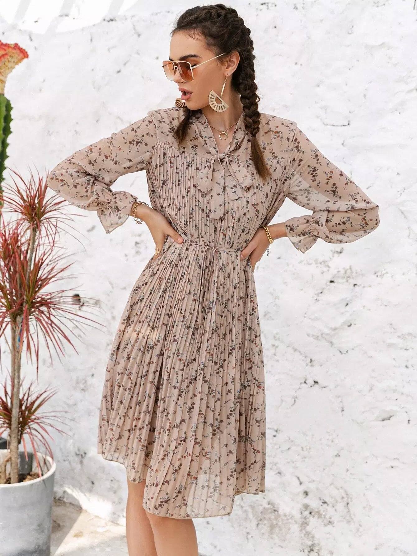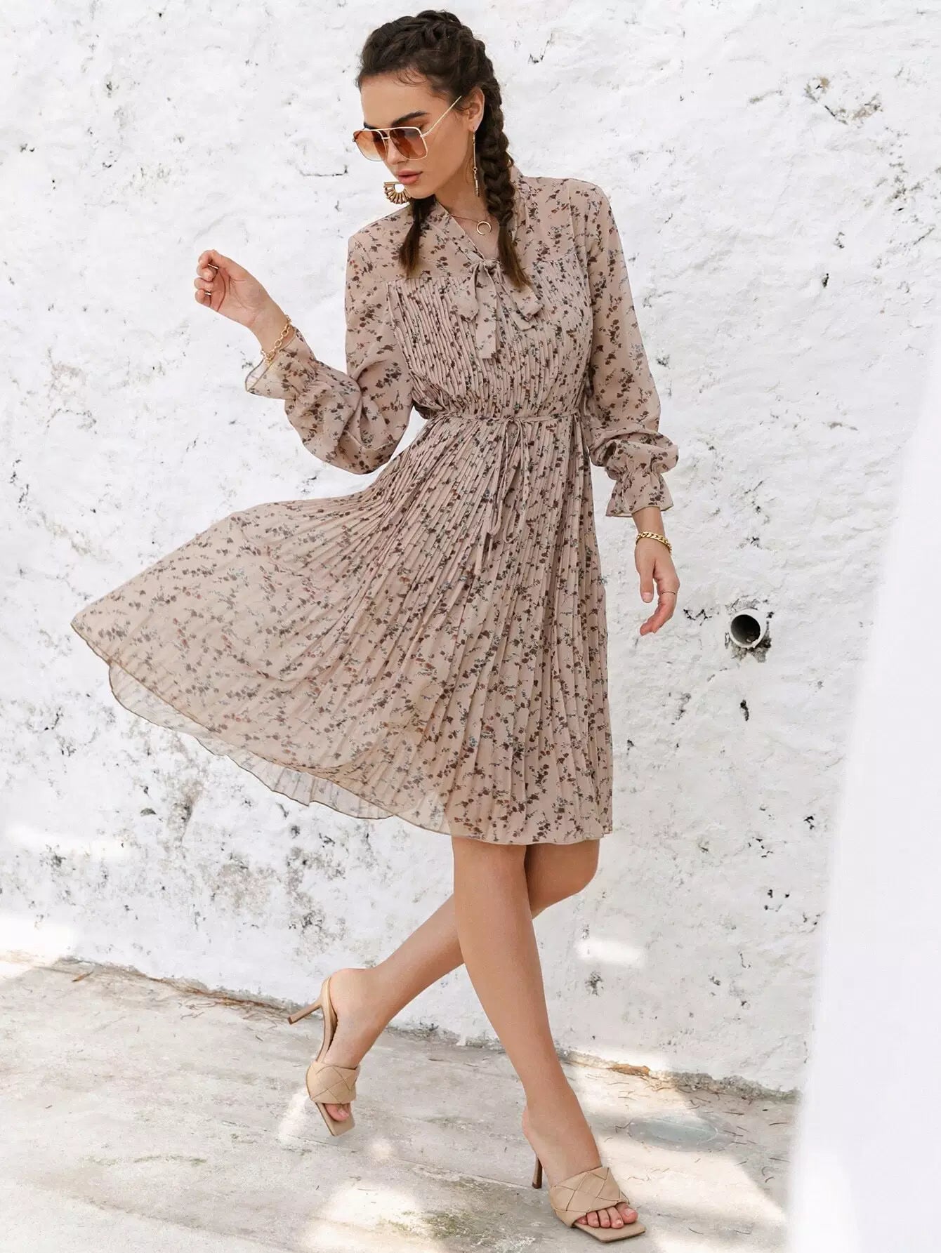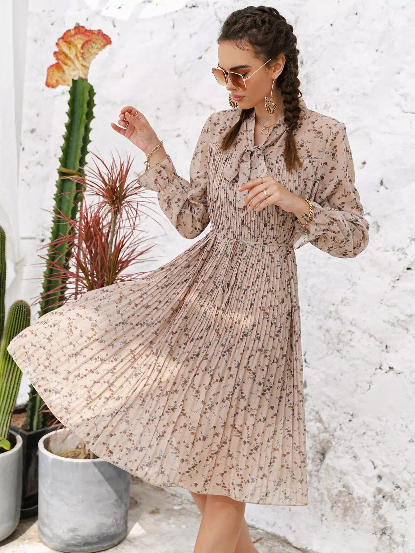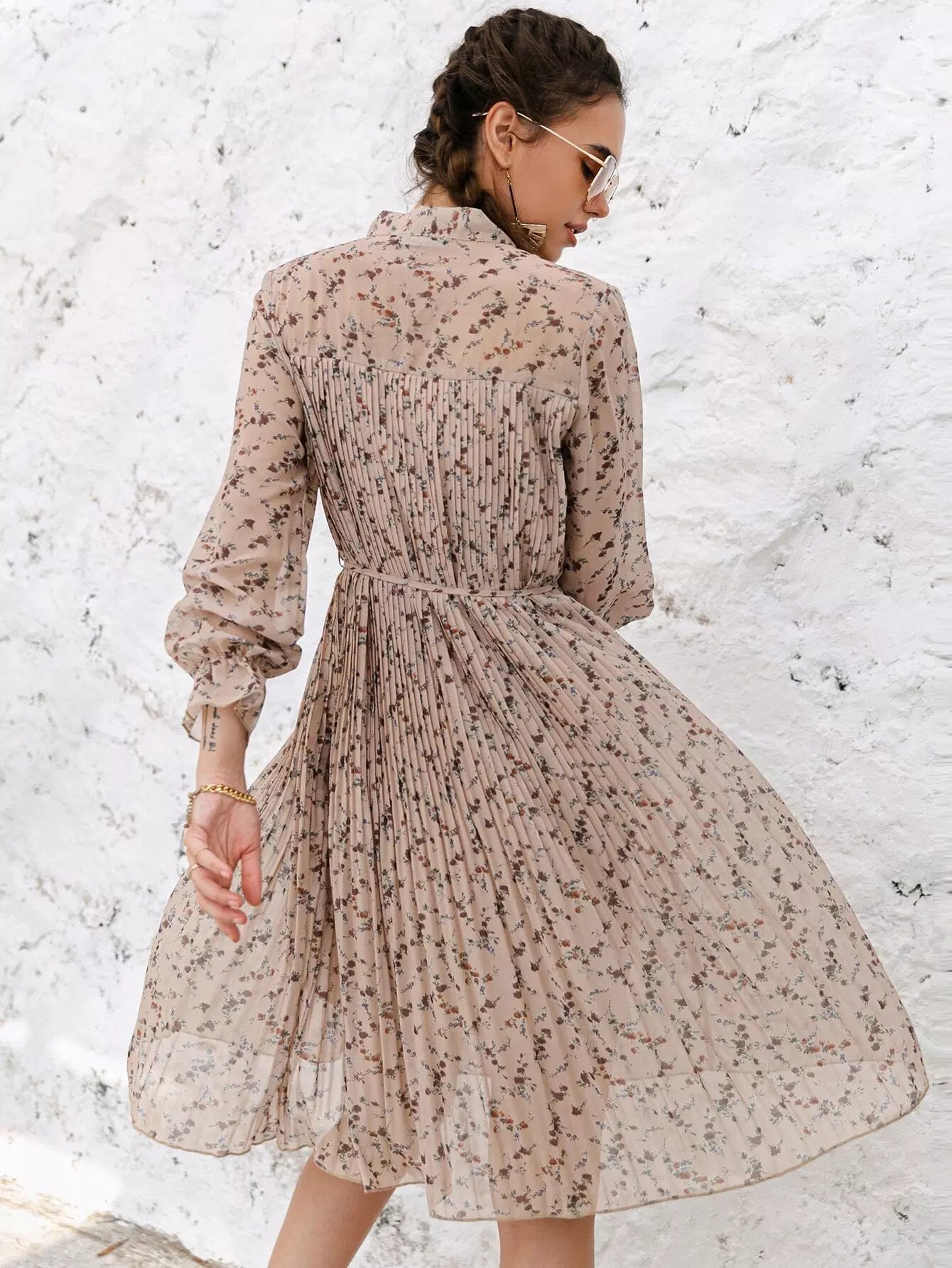 Ditsy Floral Print Tie Neck Pleated Dress Without Belt