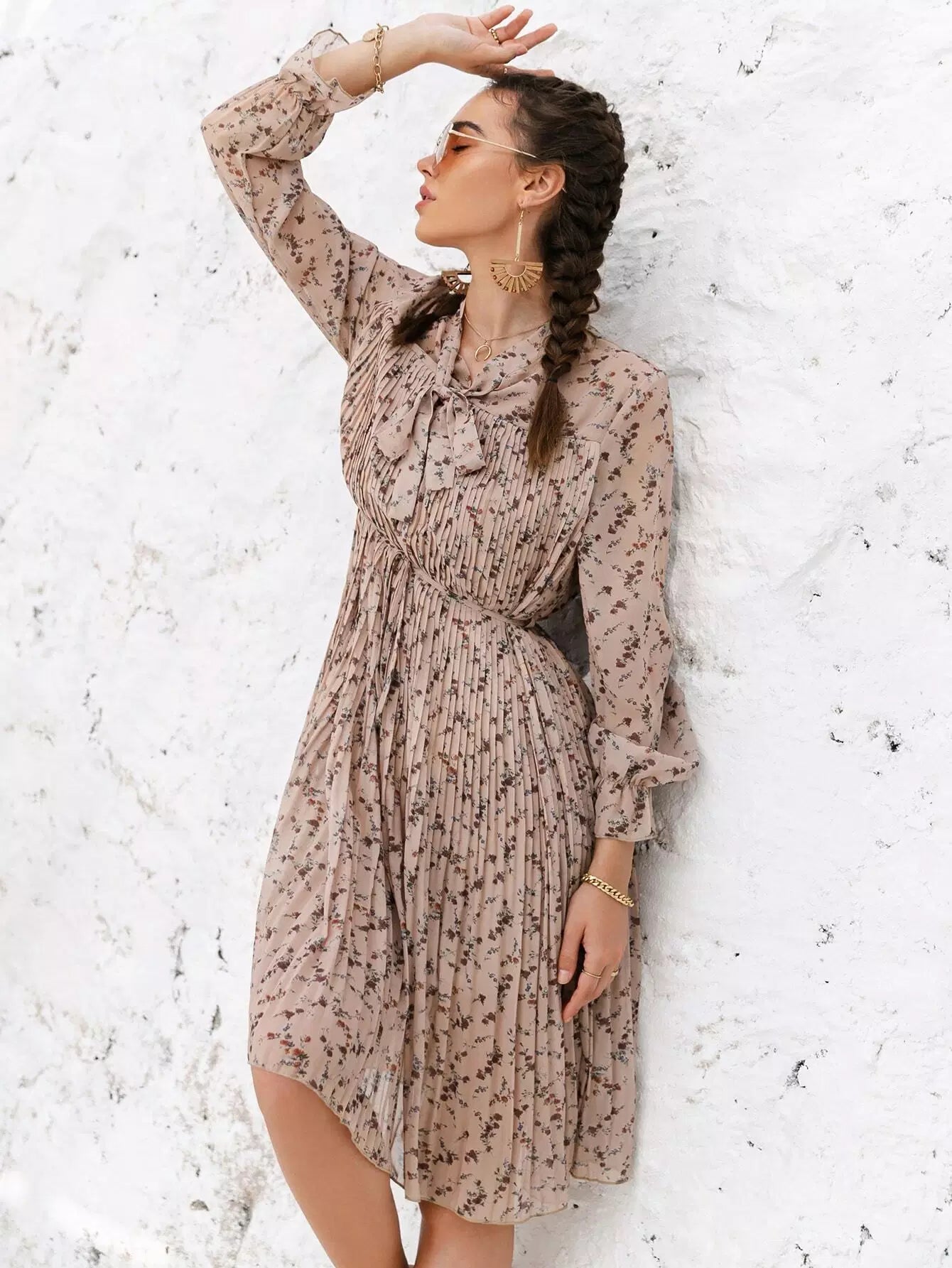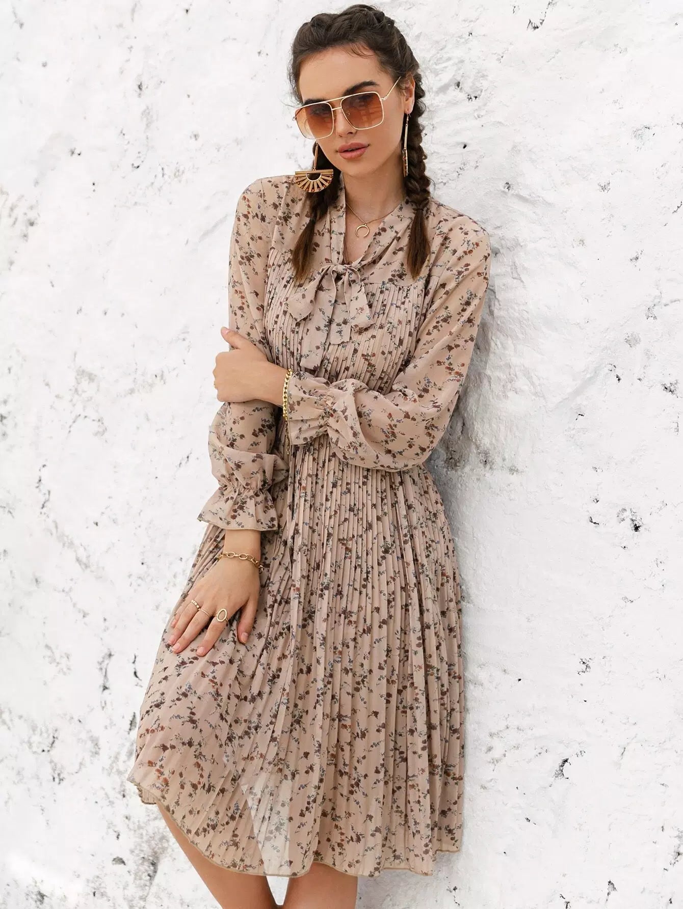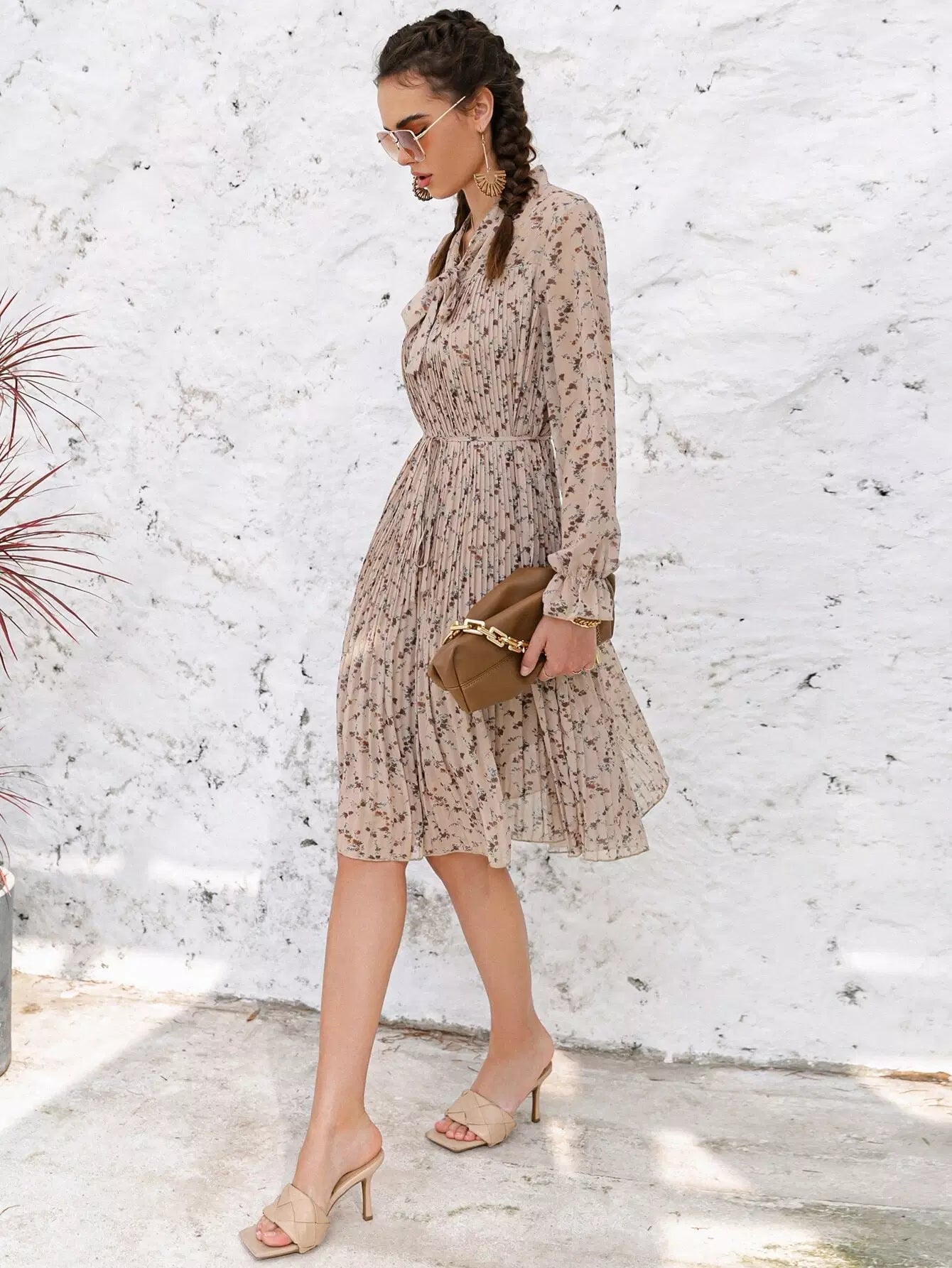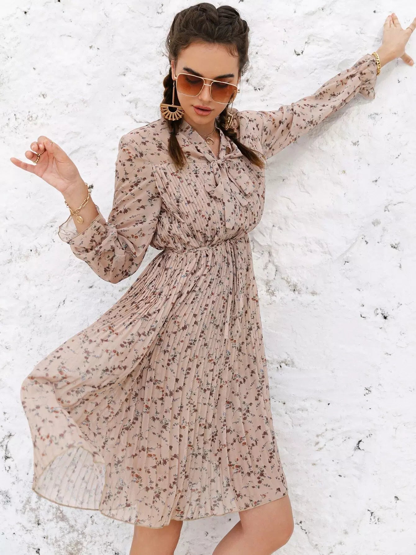 Ditsy Floral Print Tie Neck Pleated Dress Without Belt
