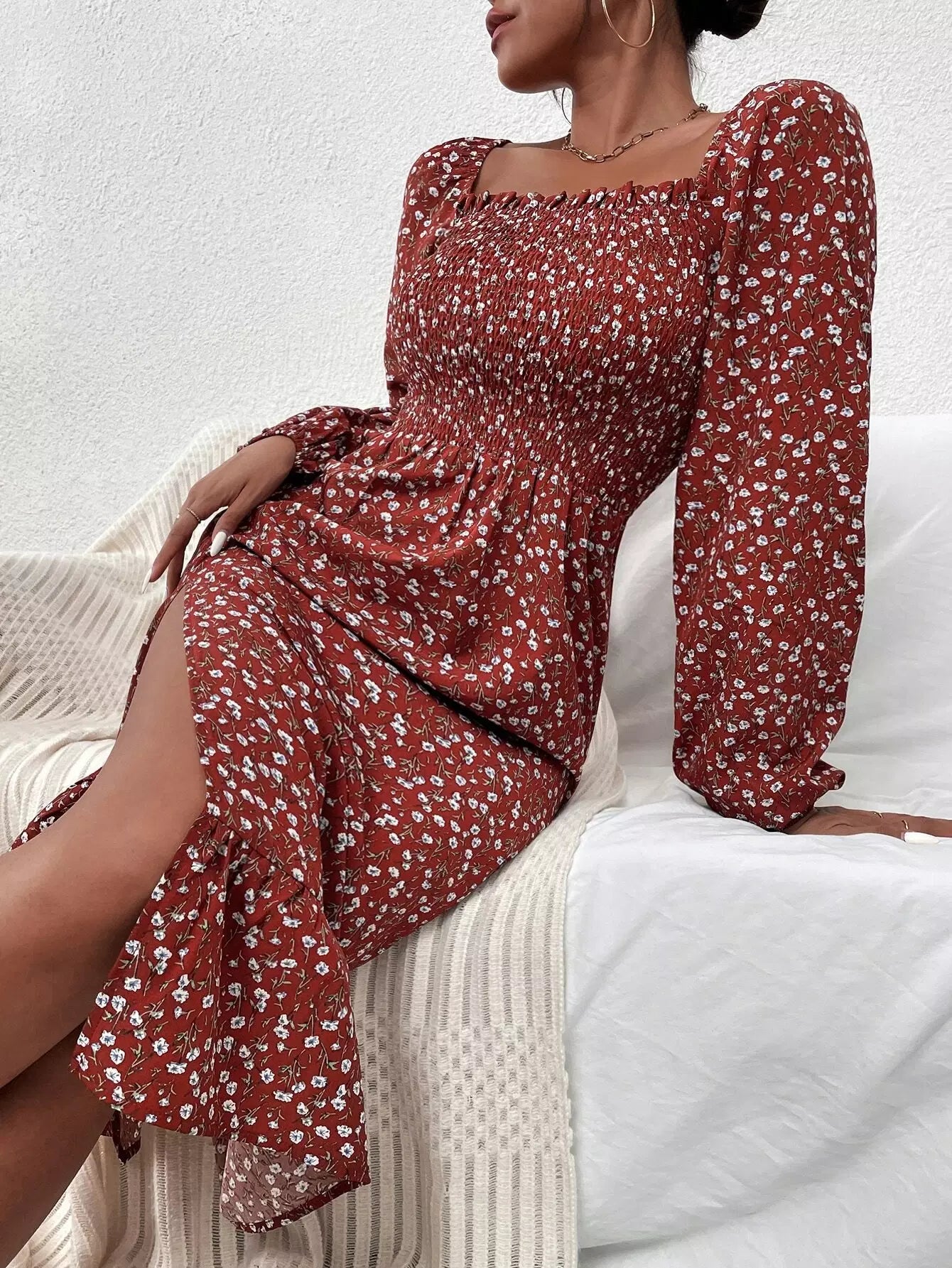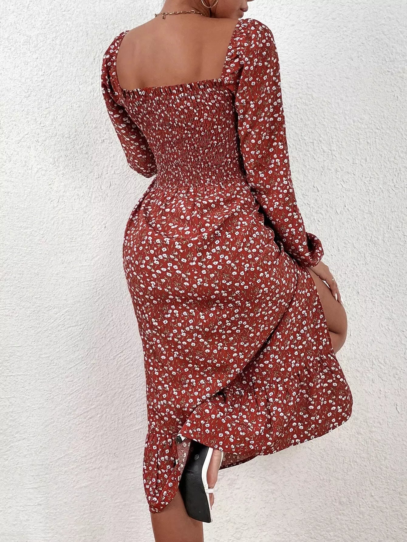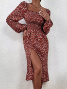Ditsy Floral Shirred Lantern Sleeve Slit Thigh Dress