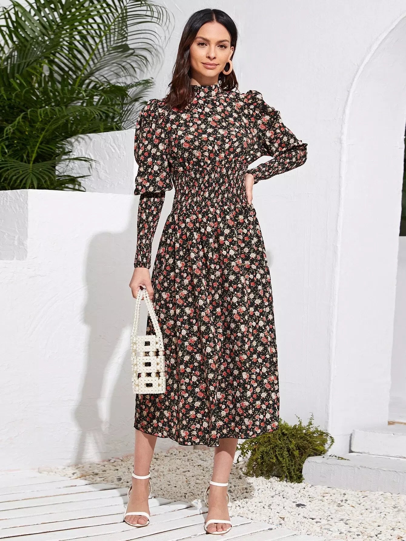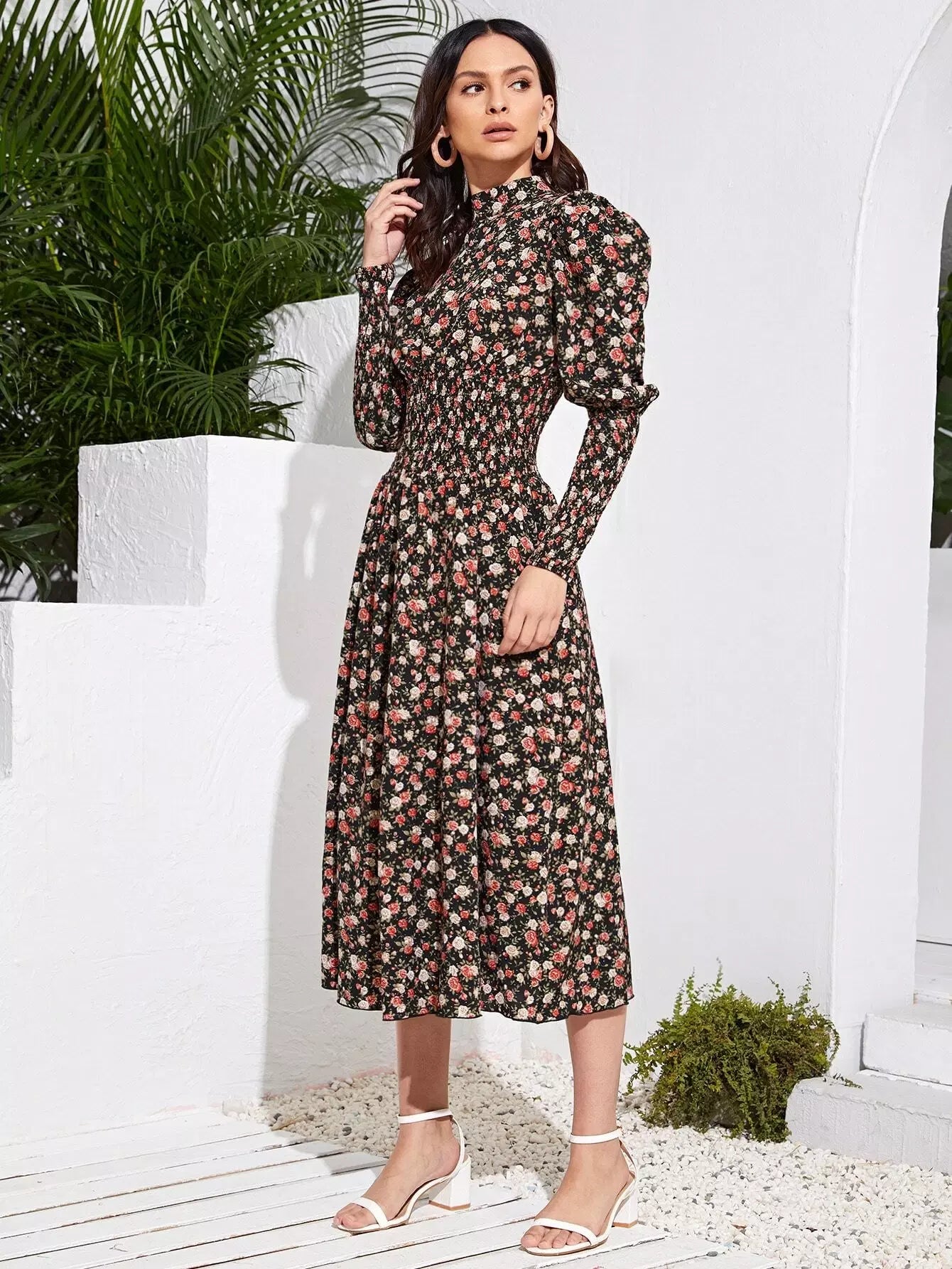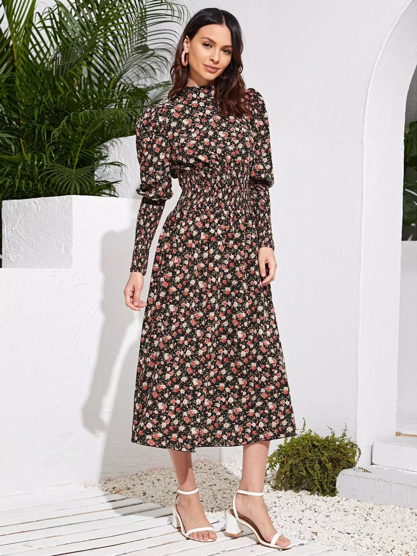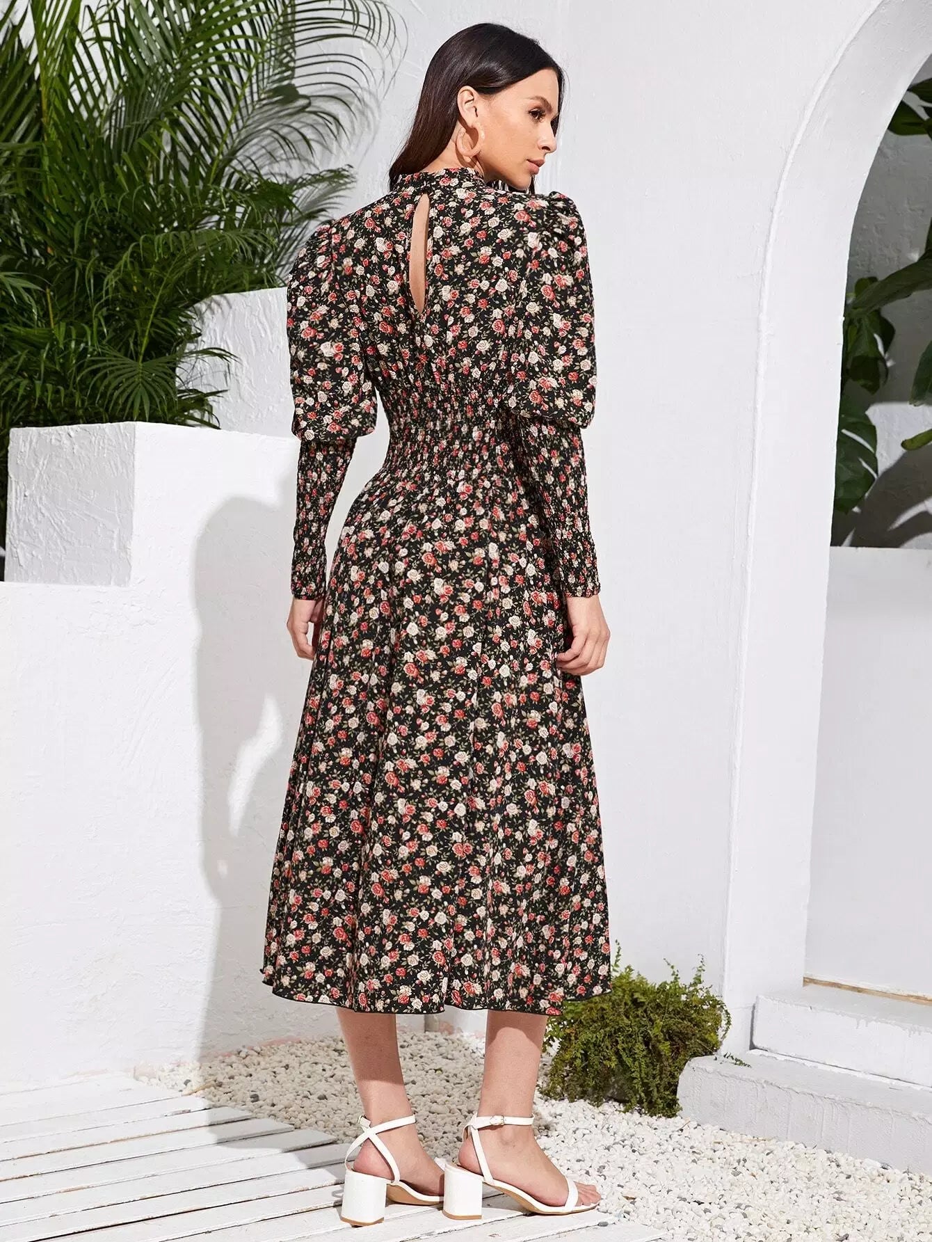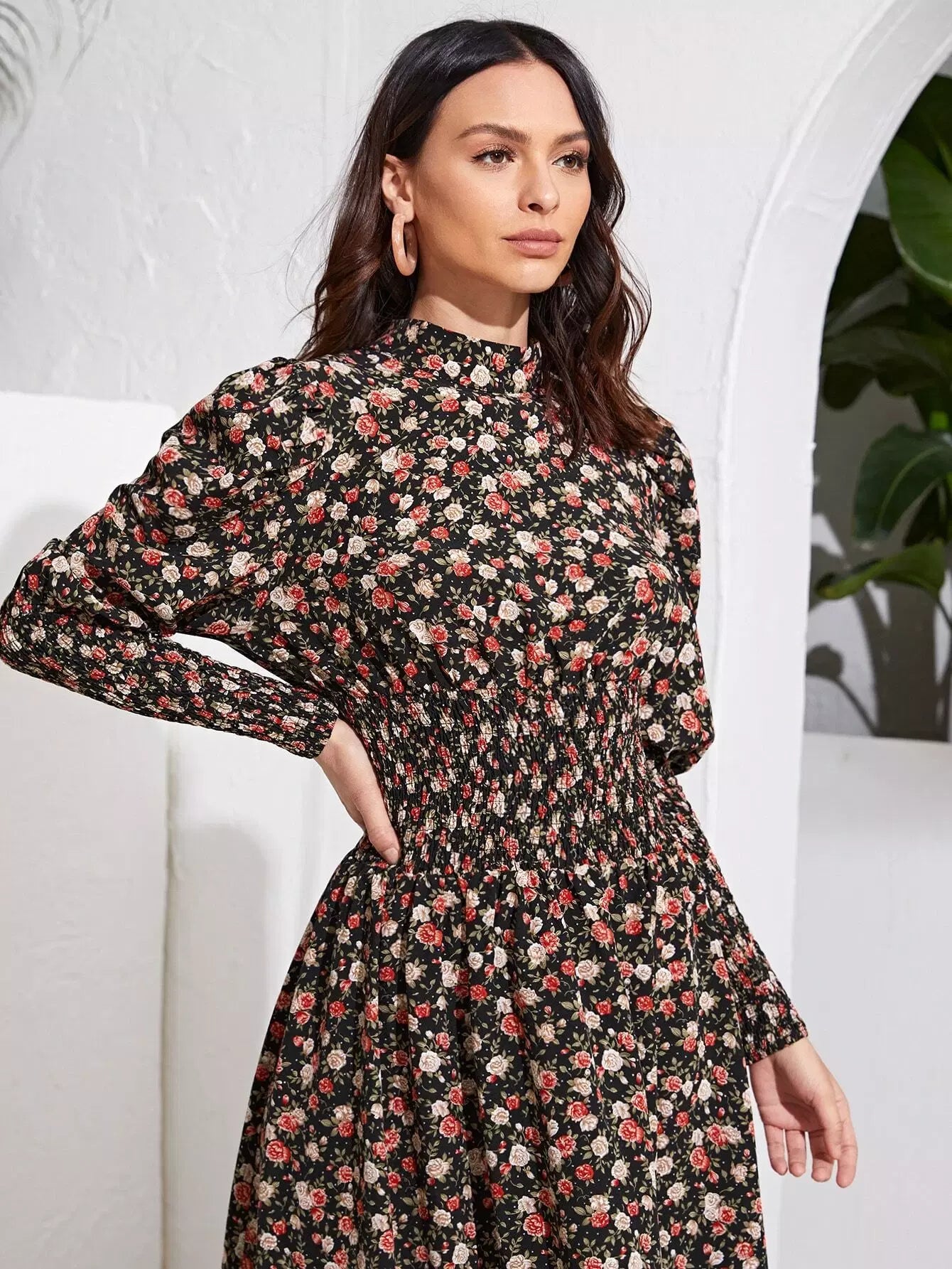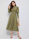 Floral Gigot Sleeve Shirred Detail Dress