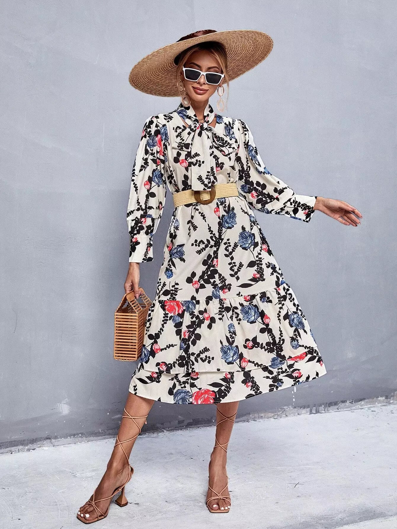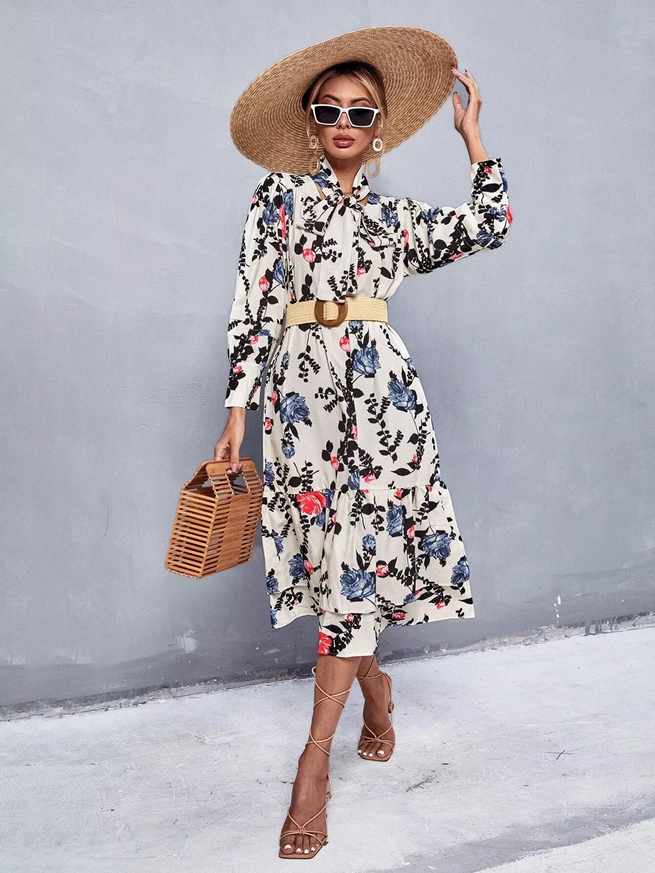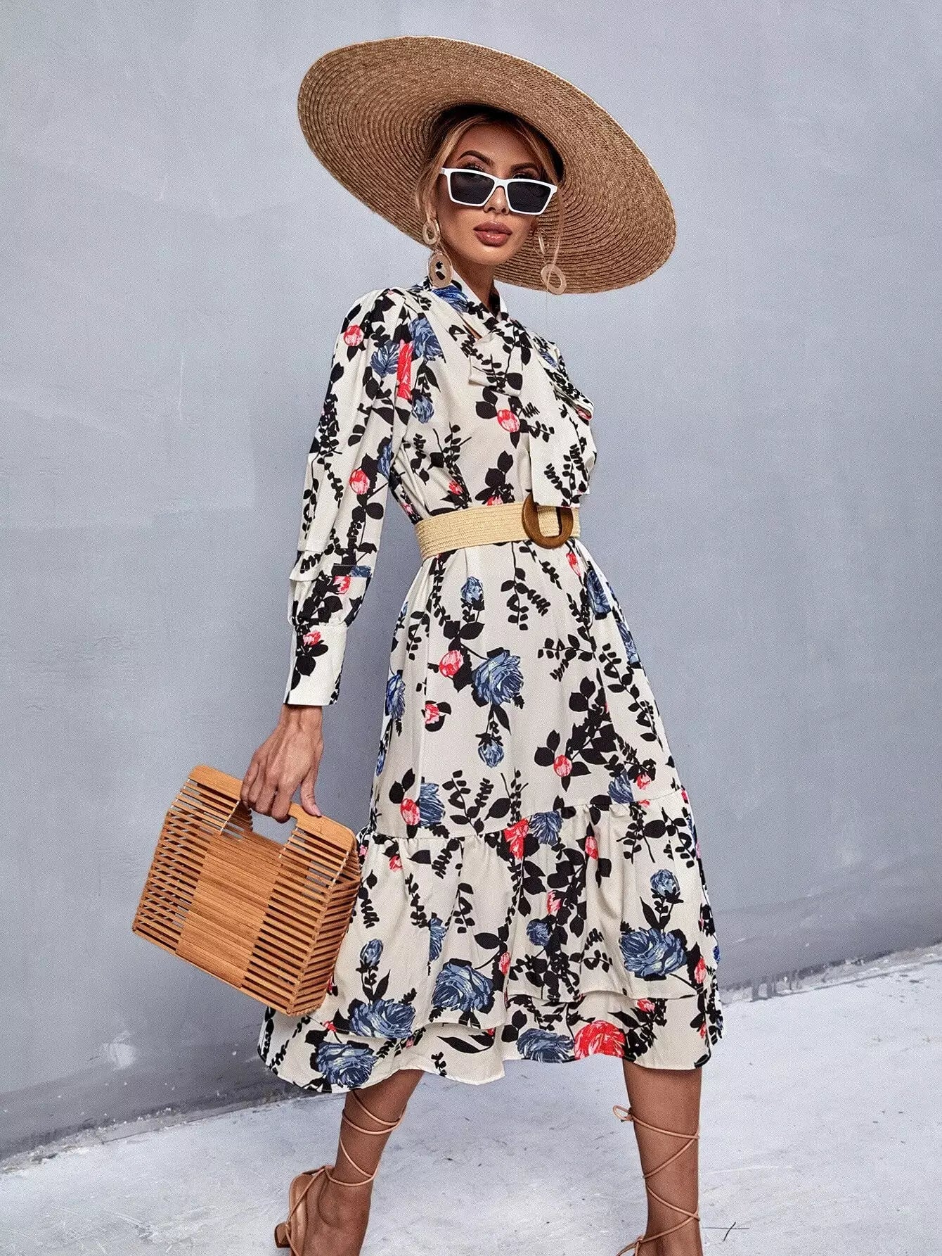 Floral Print Tie Neck Ruffle Hem Dress Without Belt