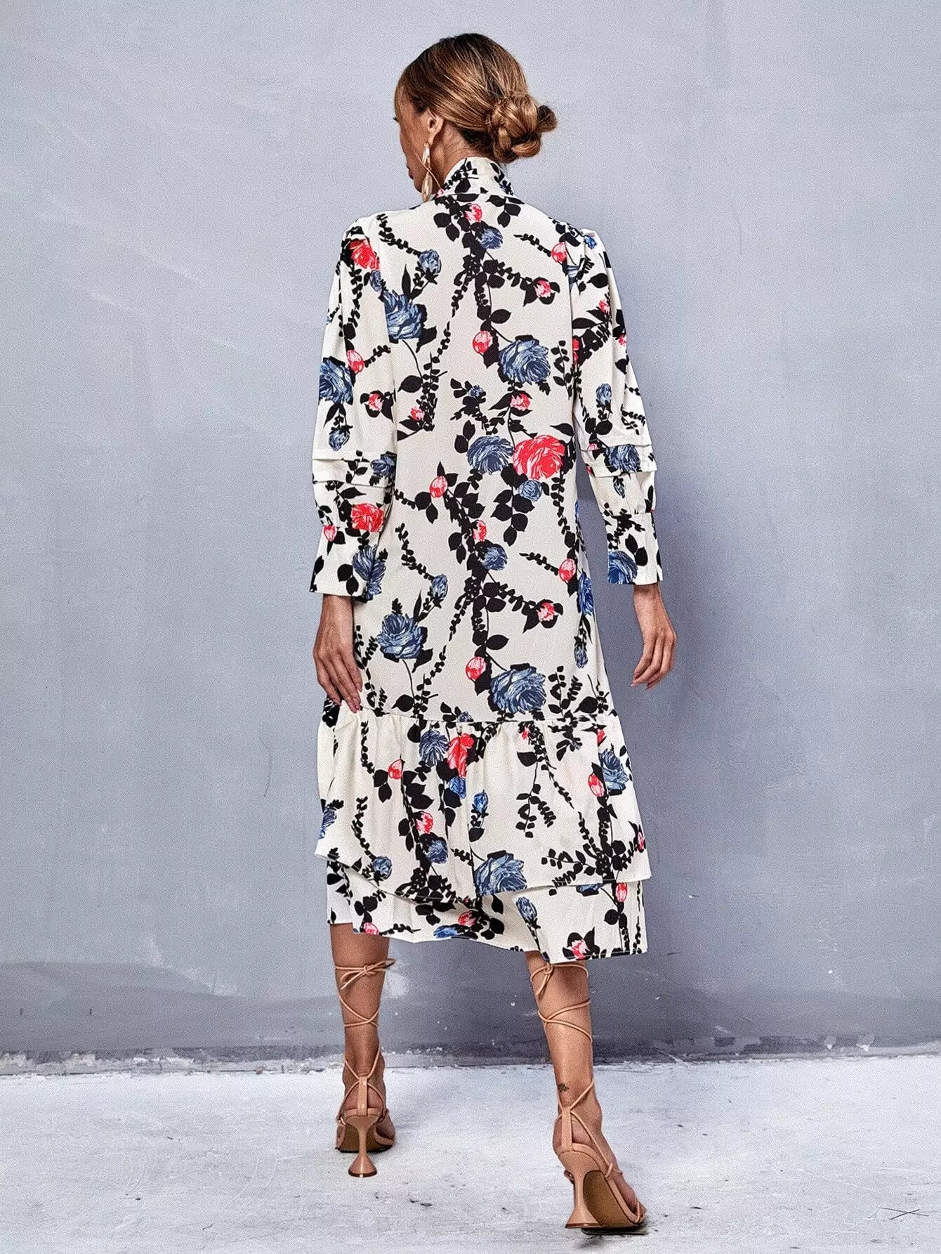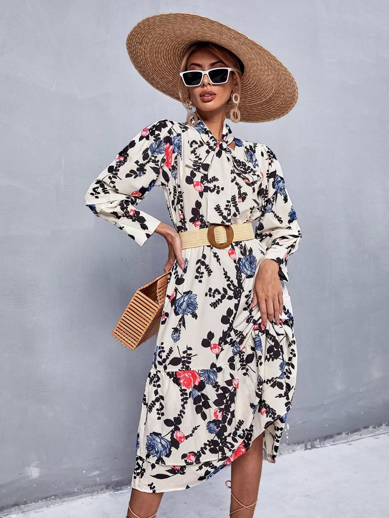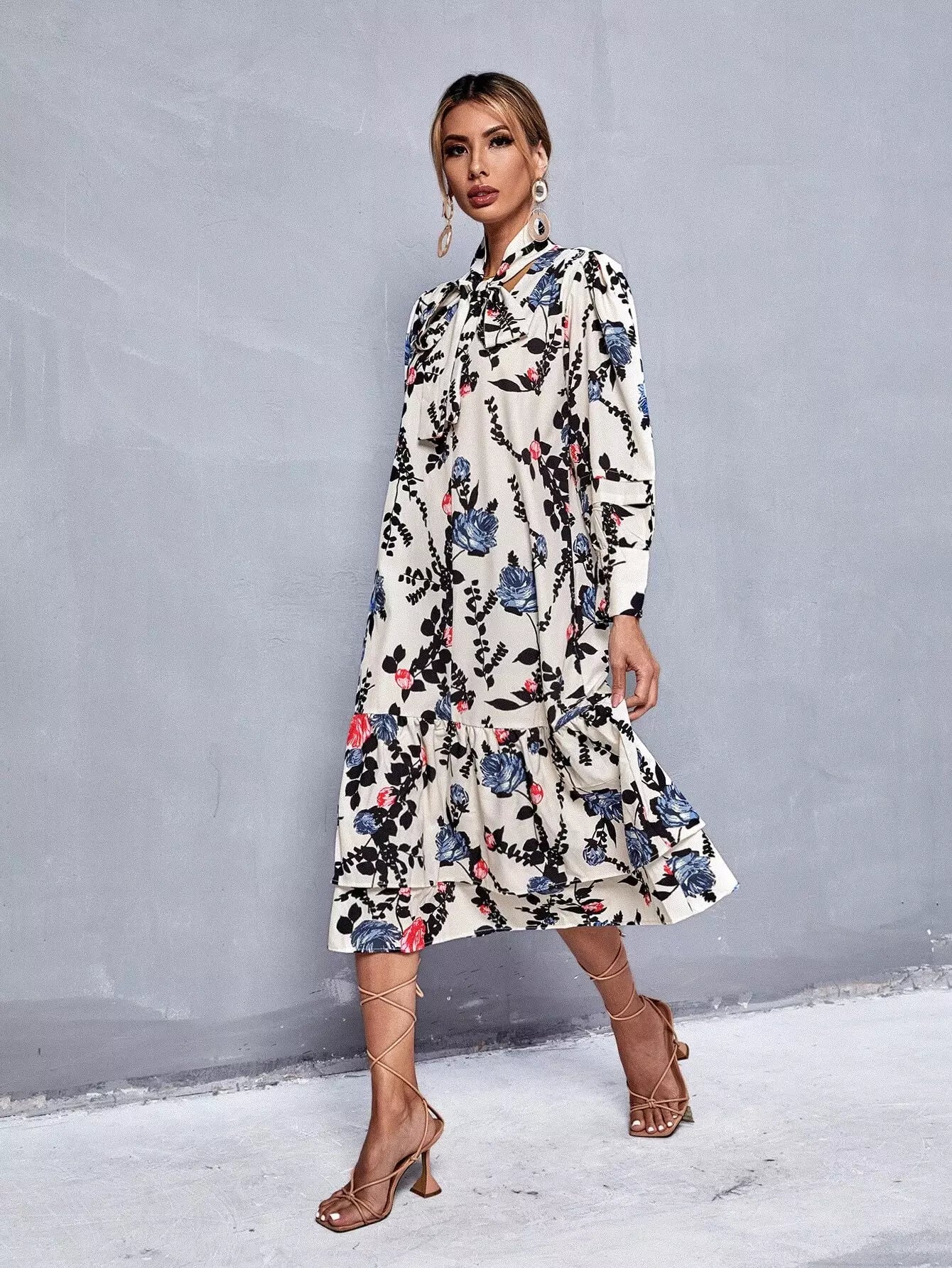 Floral Print Tie Neck Ruffle Hem Dress Without Belt