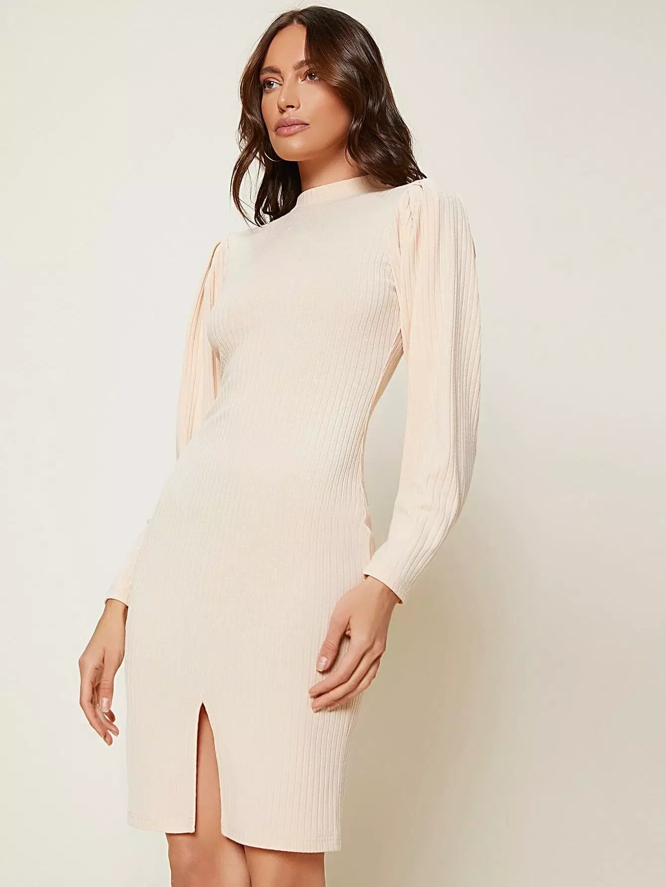Women - Mock Neck Puff Sleeve Split Hem Dress Without Belt