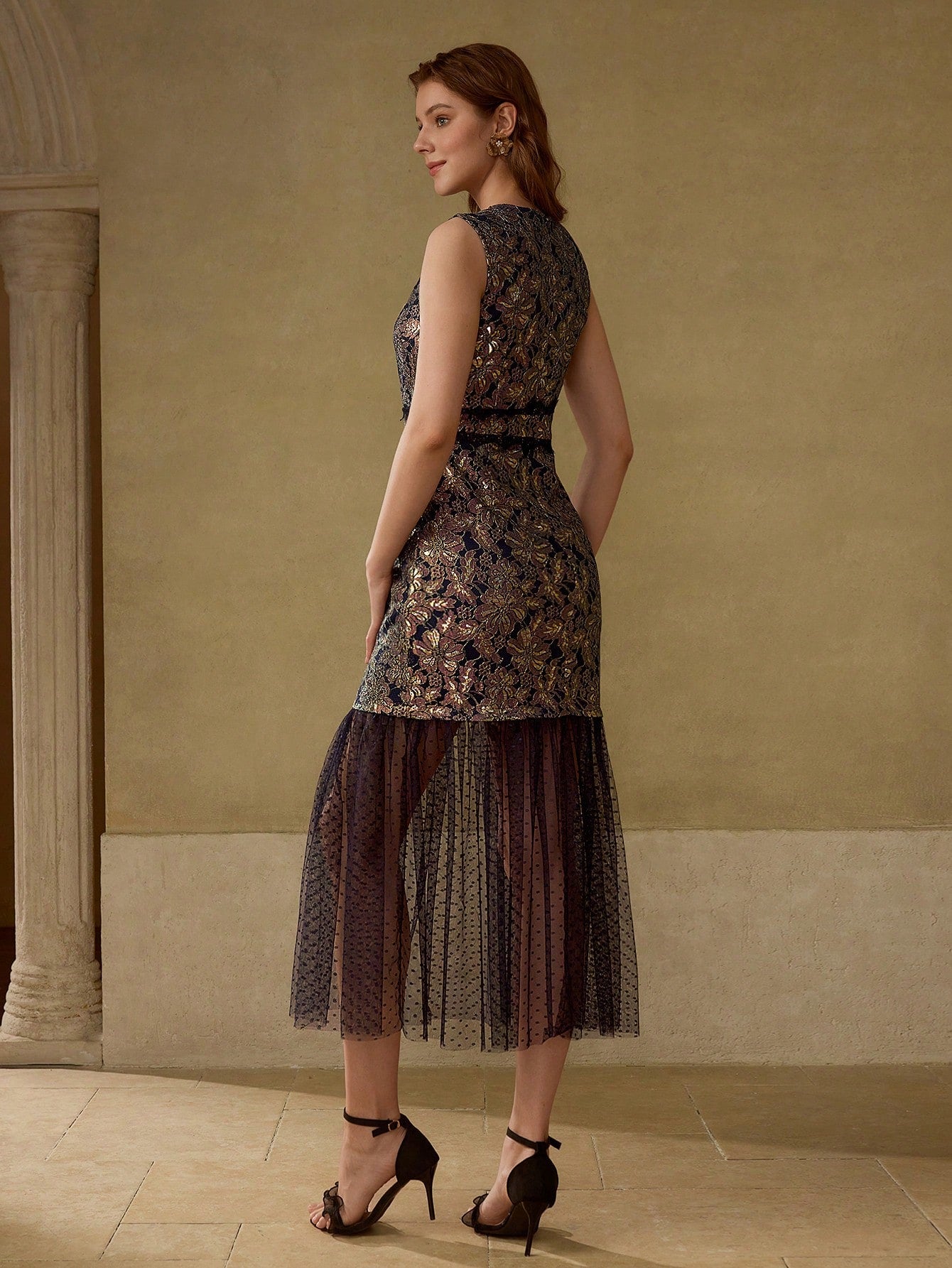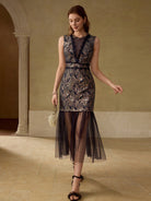 MOTF PREMIUM CONTRAST LACE SHEER HEM FITTED ROUND NECK FASHION DRESS FOR WOMEN