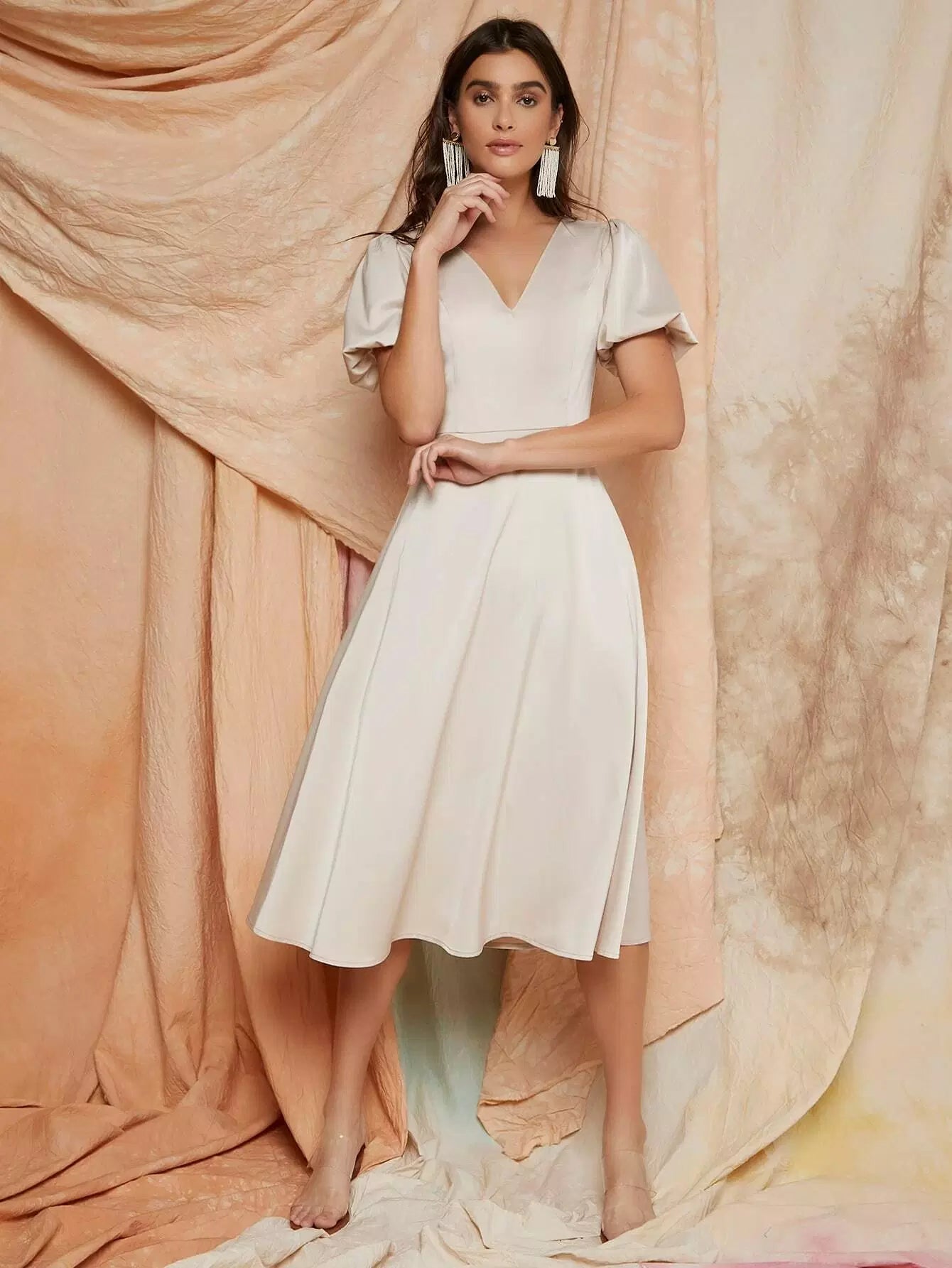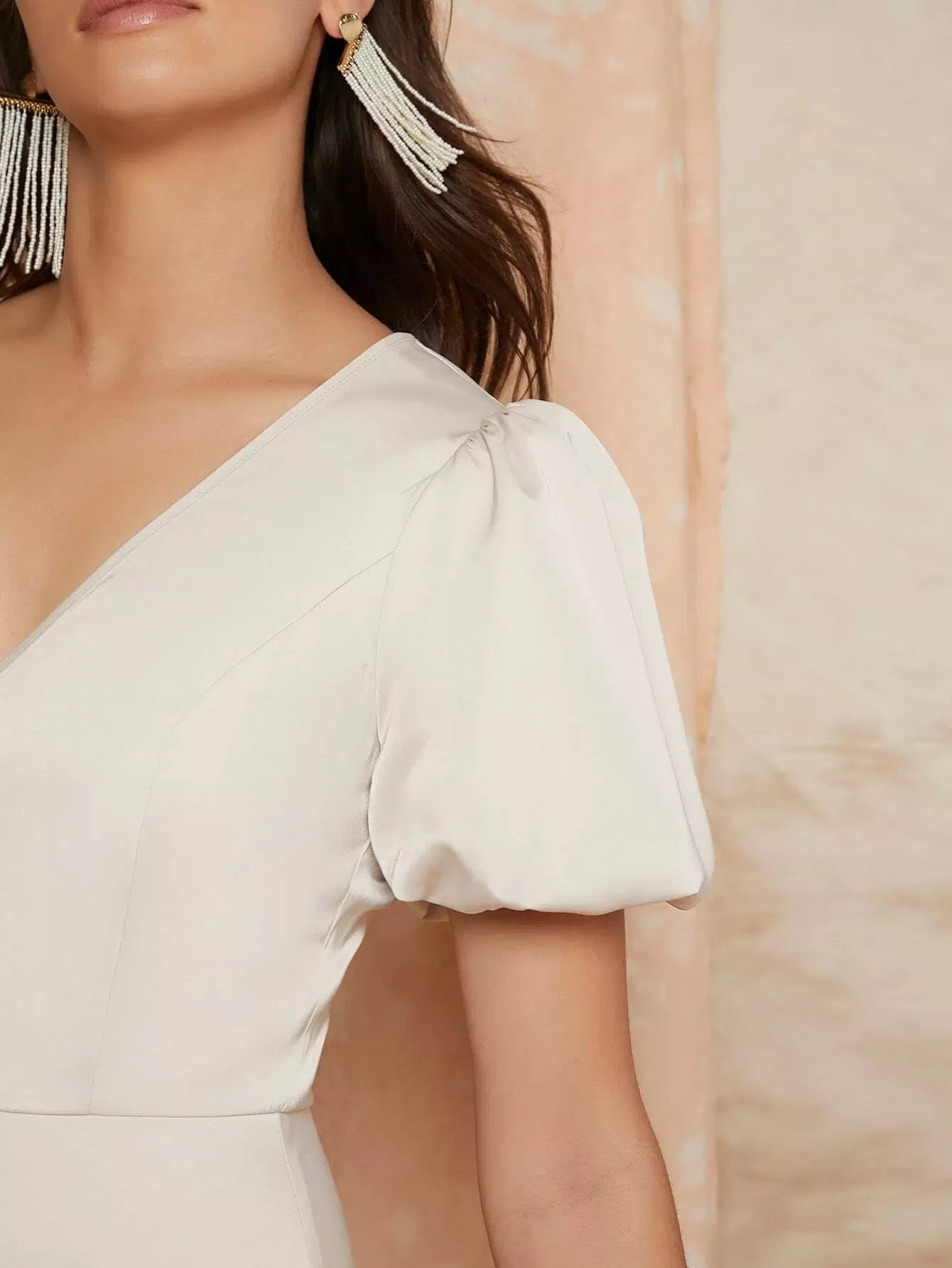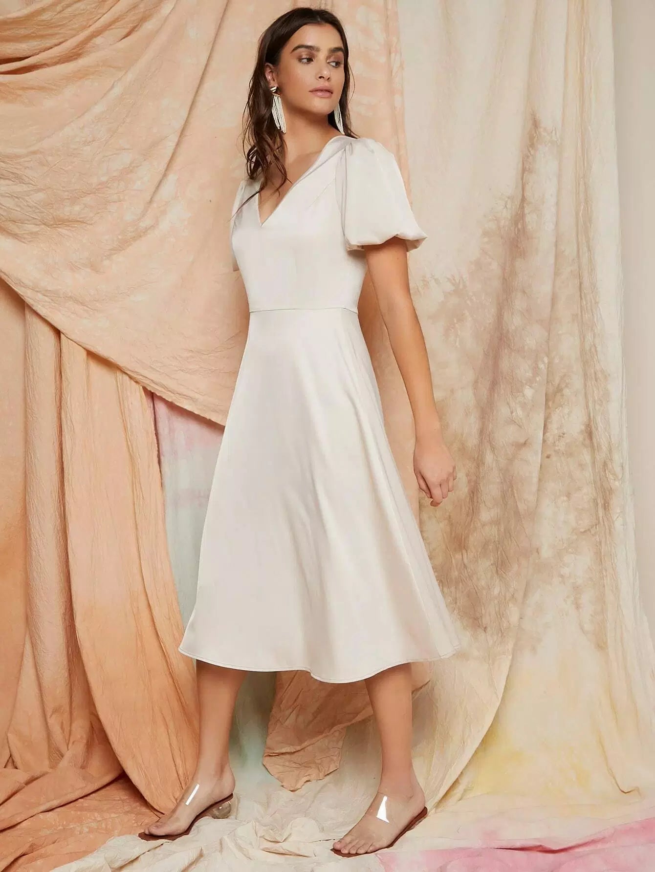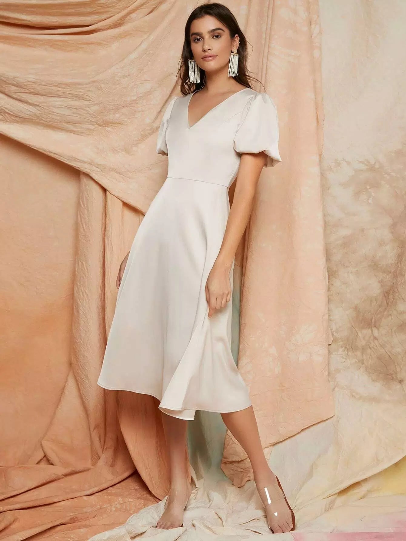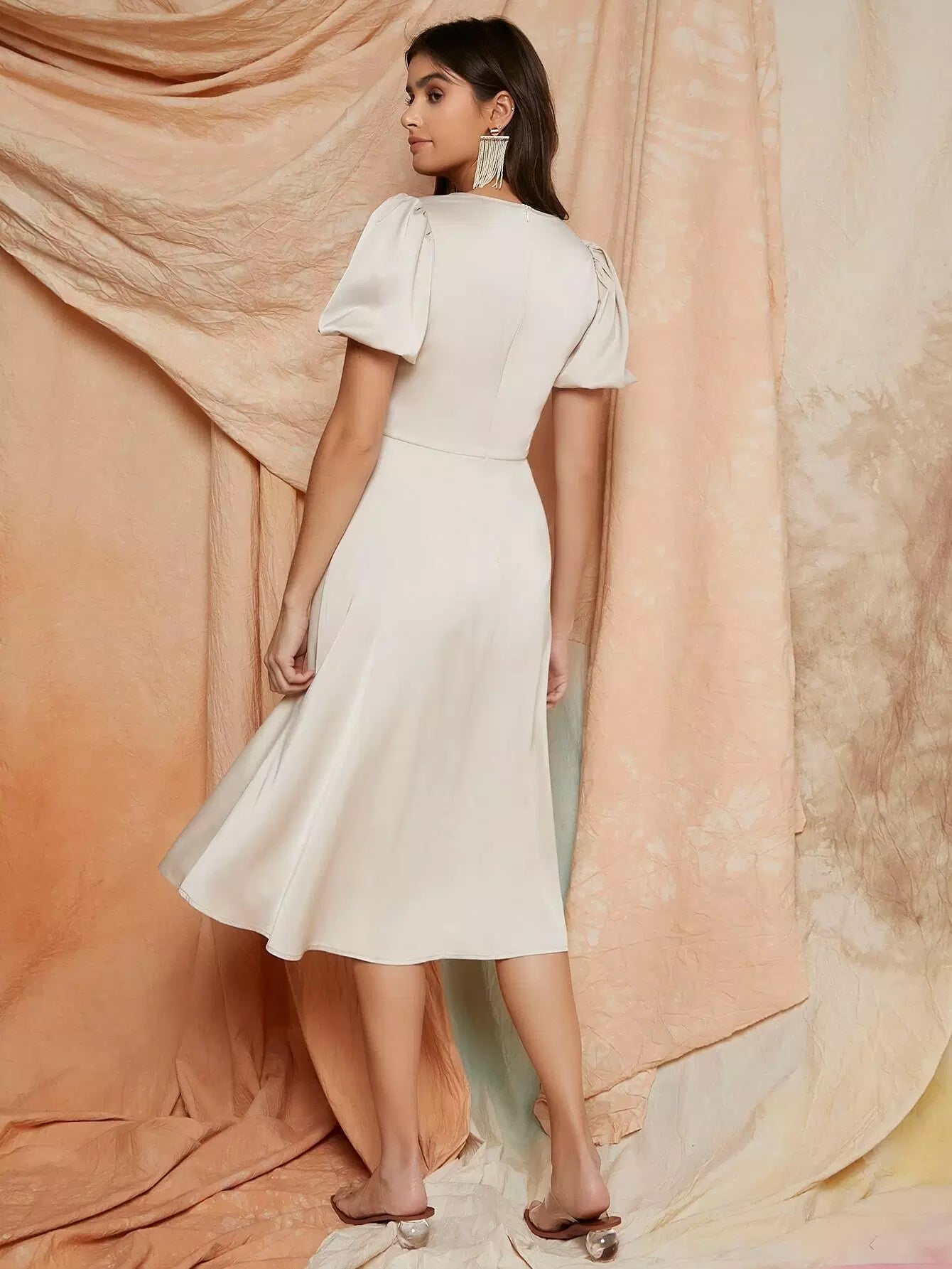 Puff Sleeve Solid Satin Dress