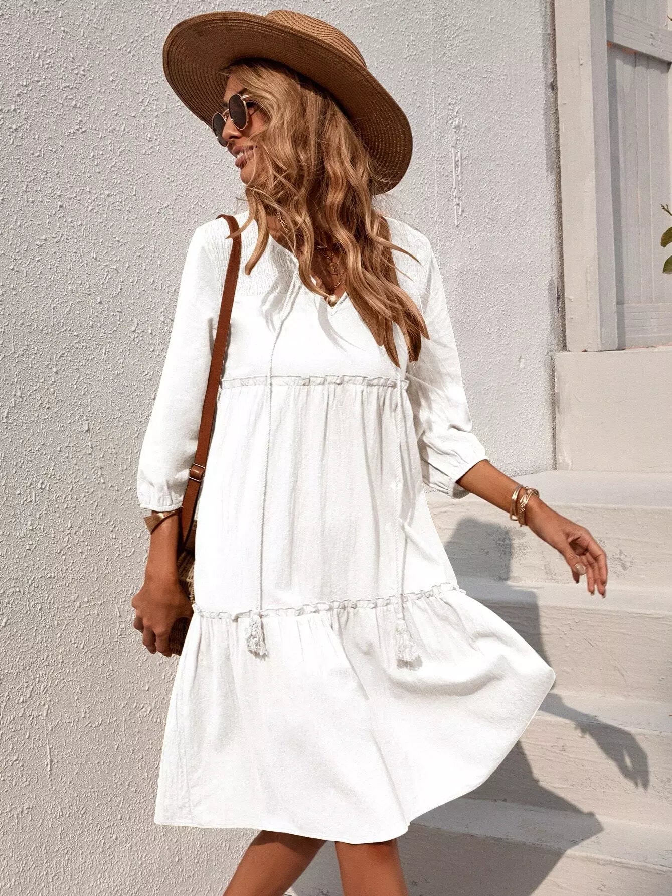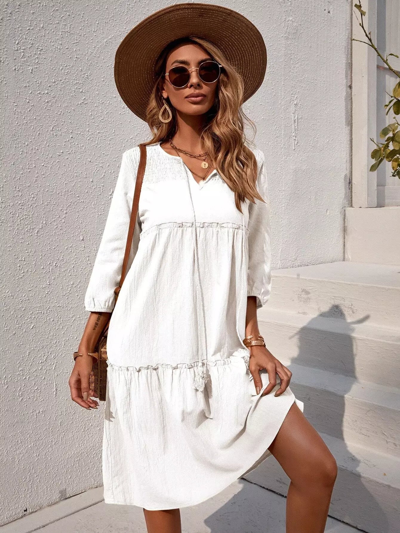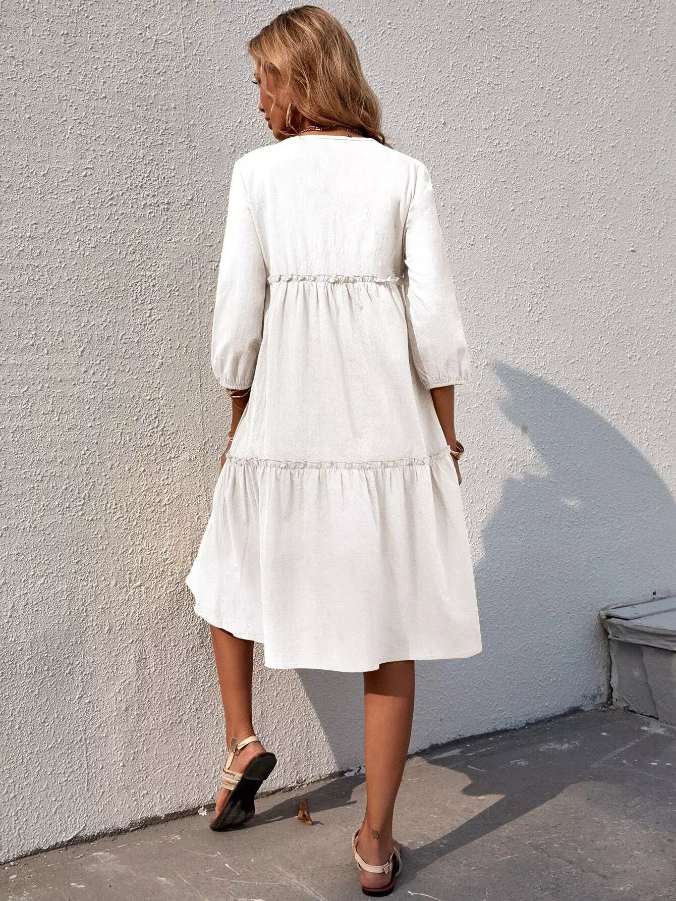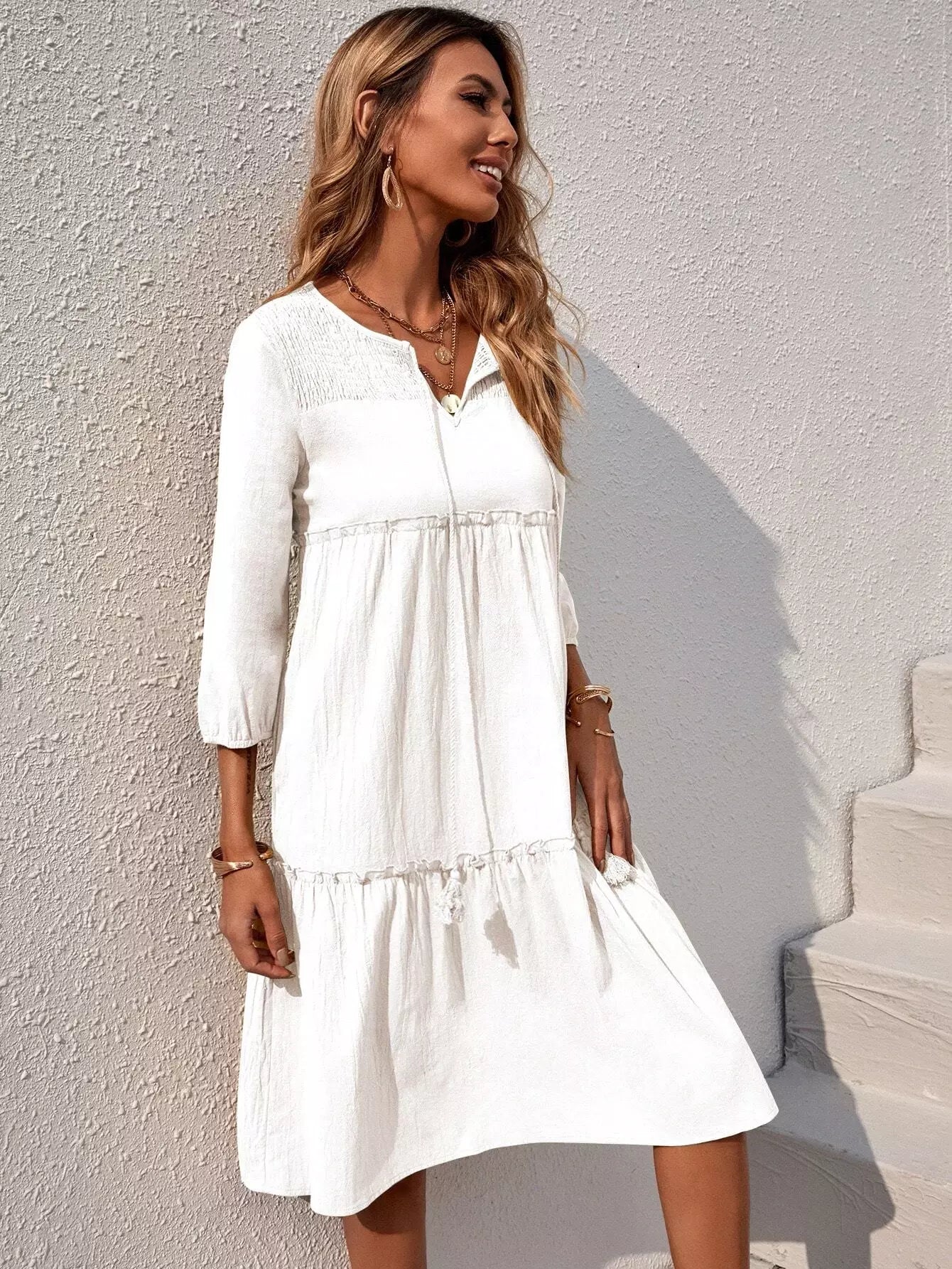 Solid Shirred Frill Trim Tie Neck Smock Dress