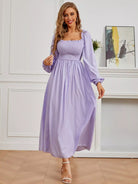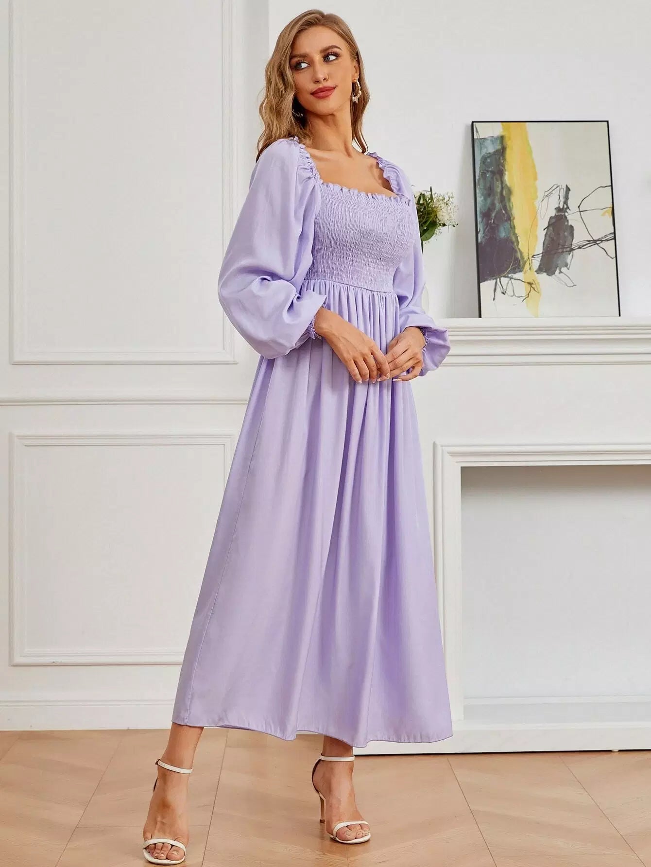 Square Neck Bishop Sleeve Shirred A-line Dress