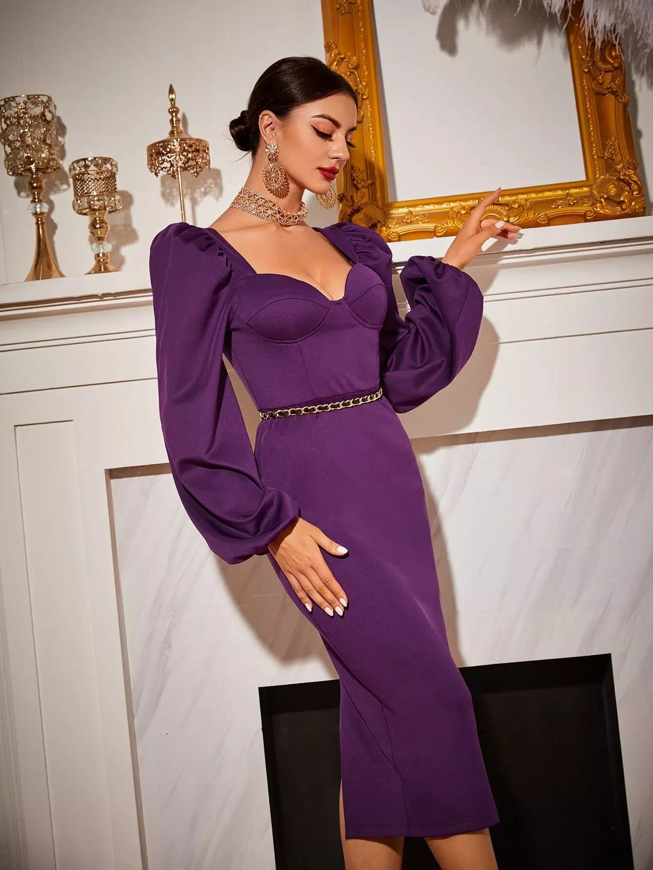 Sweetheart Neck Lantern Sleeve Split Back Dress Without Belt