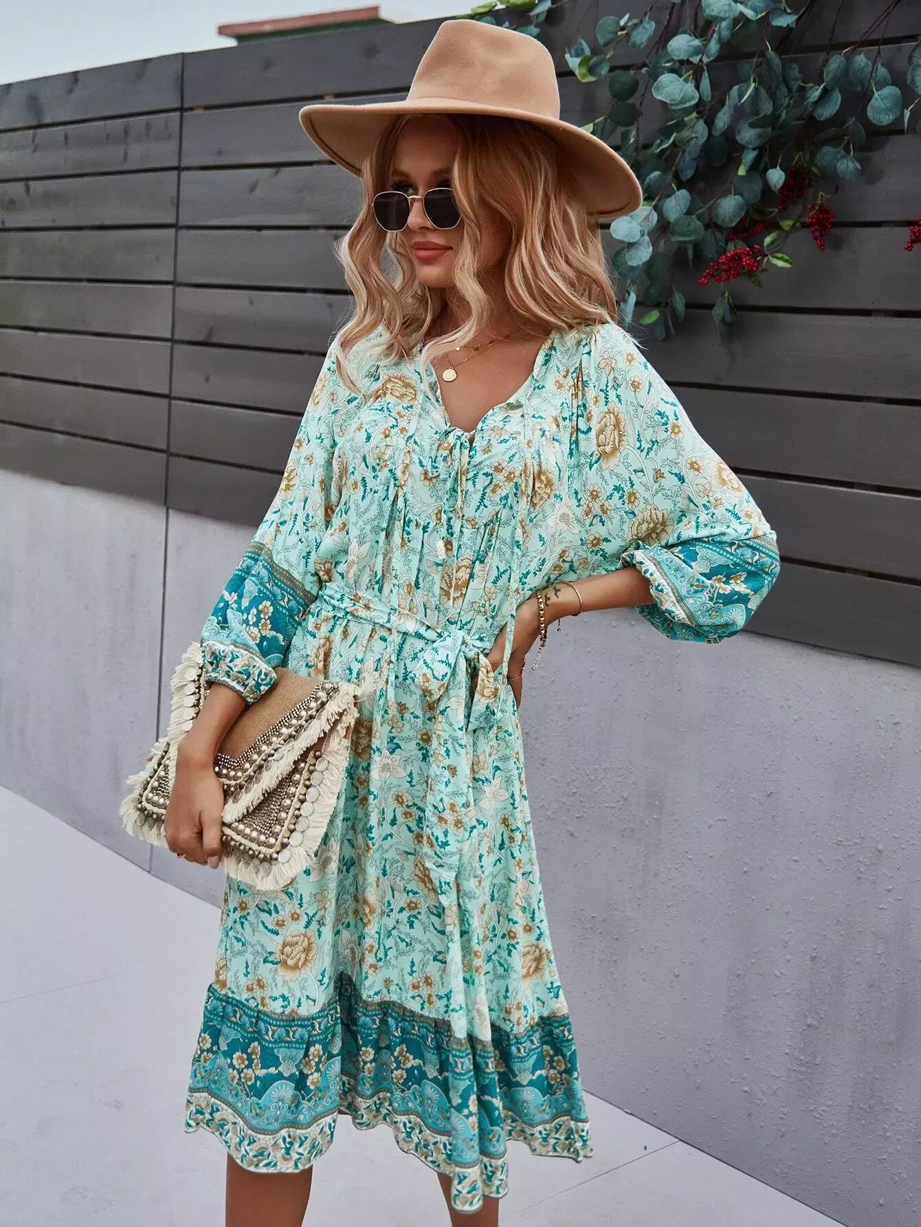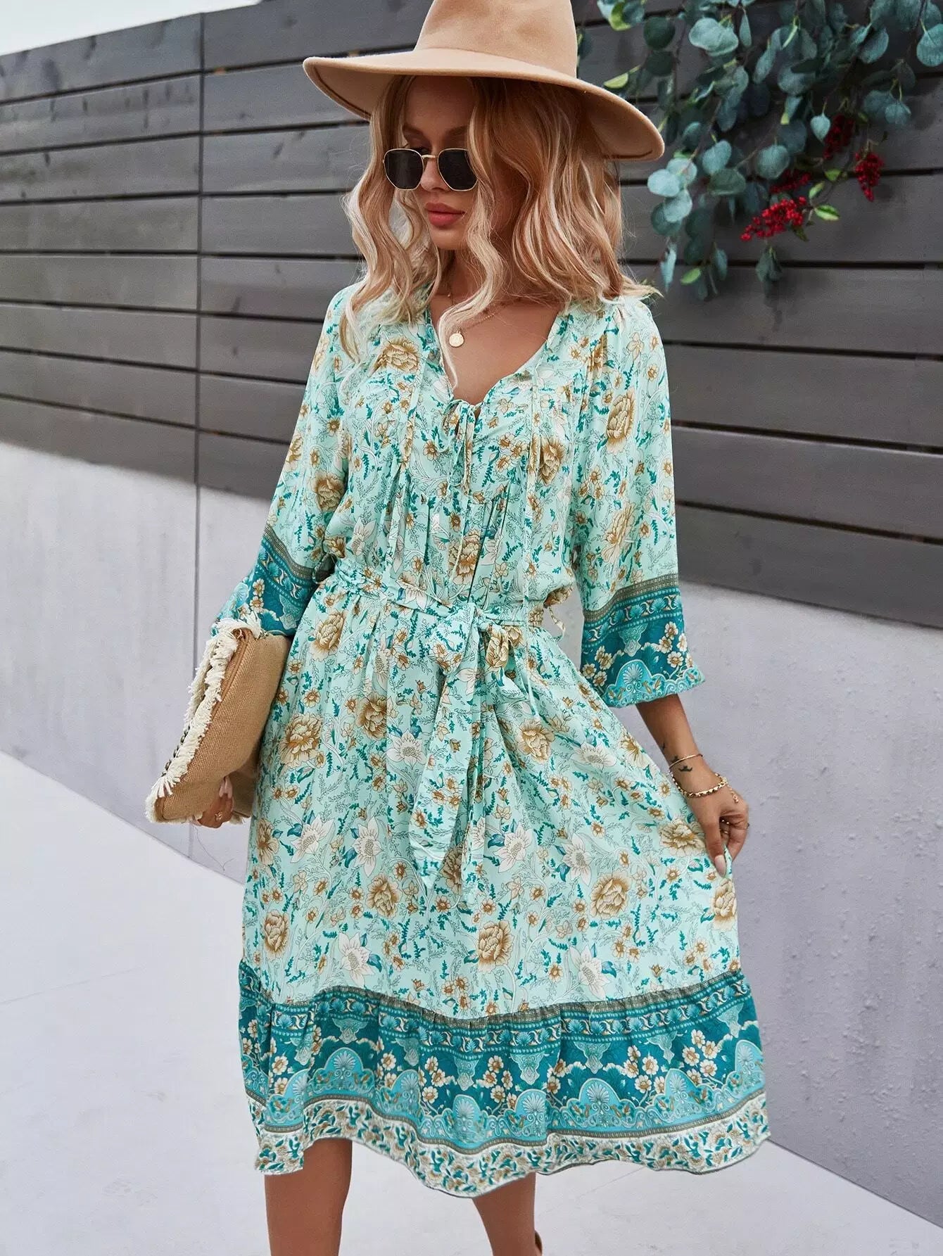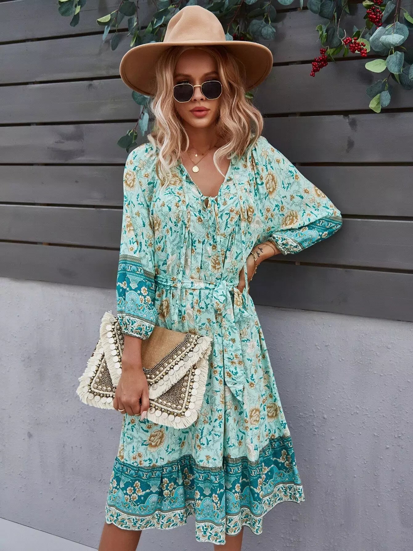 Tie Neck Floral Print Dress Without Belt