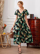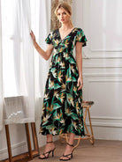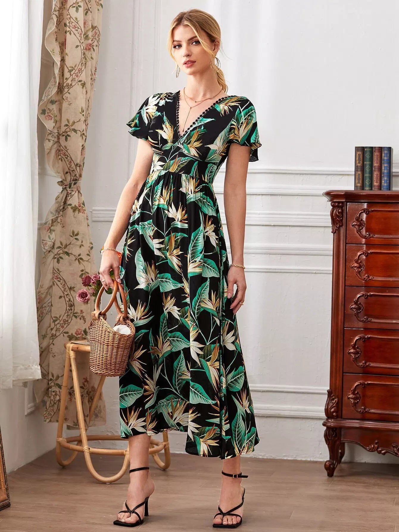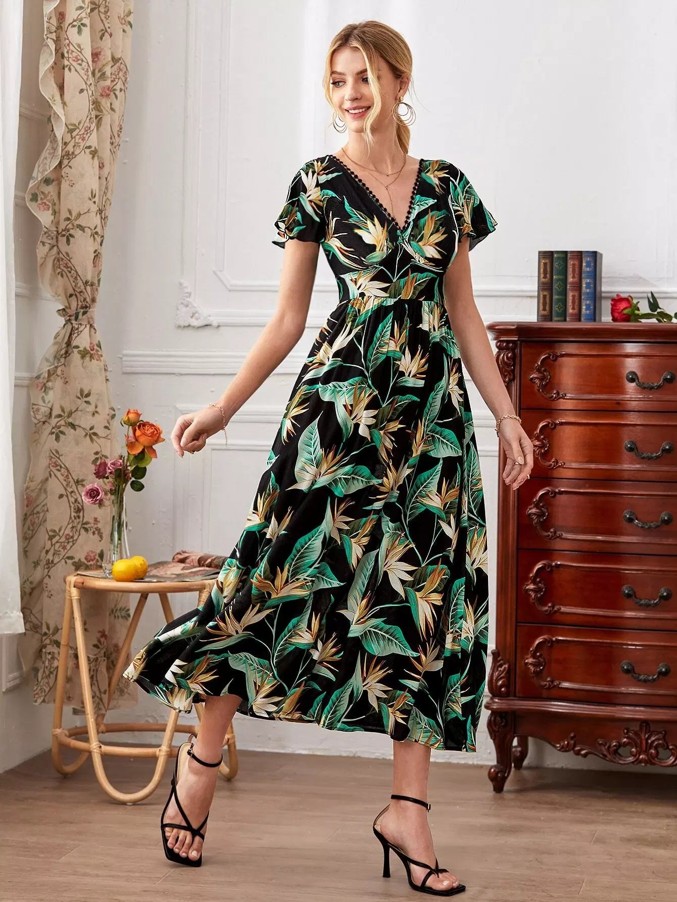 Tied Open Back Dotted Lace Trim Tropical Dress