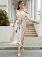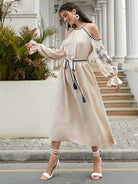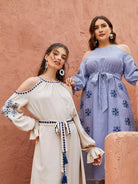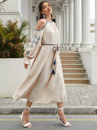 1PC Cold Shoulder Flounce Sleeve Embroidery Detail Dress Without Belt