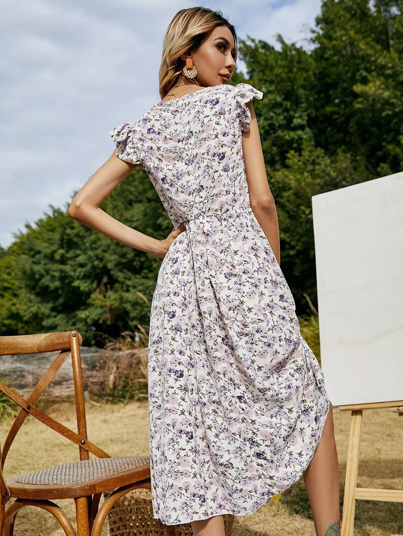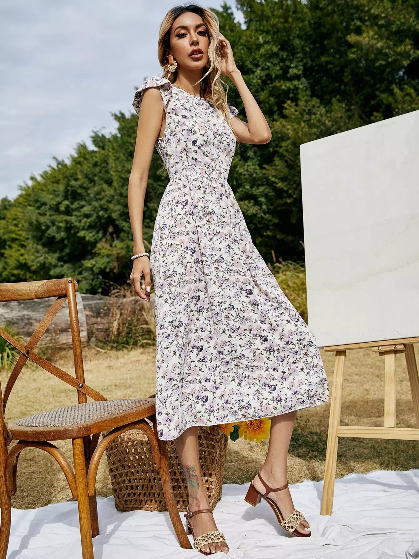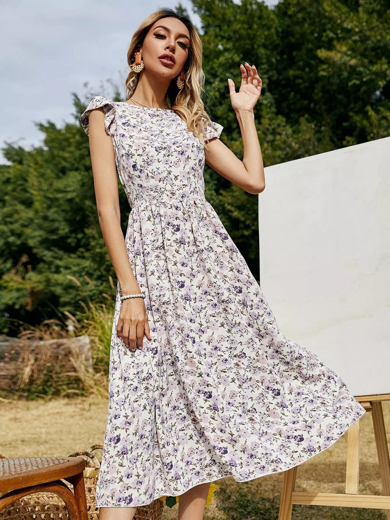 Allover Floral Ruffle Cuff A-line Dress