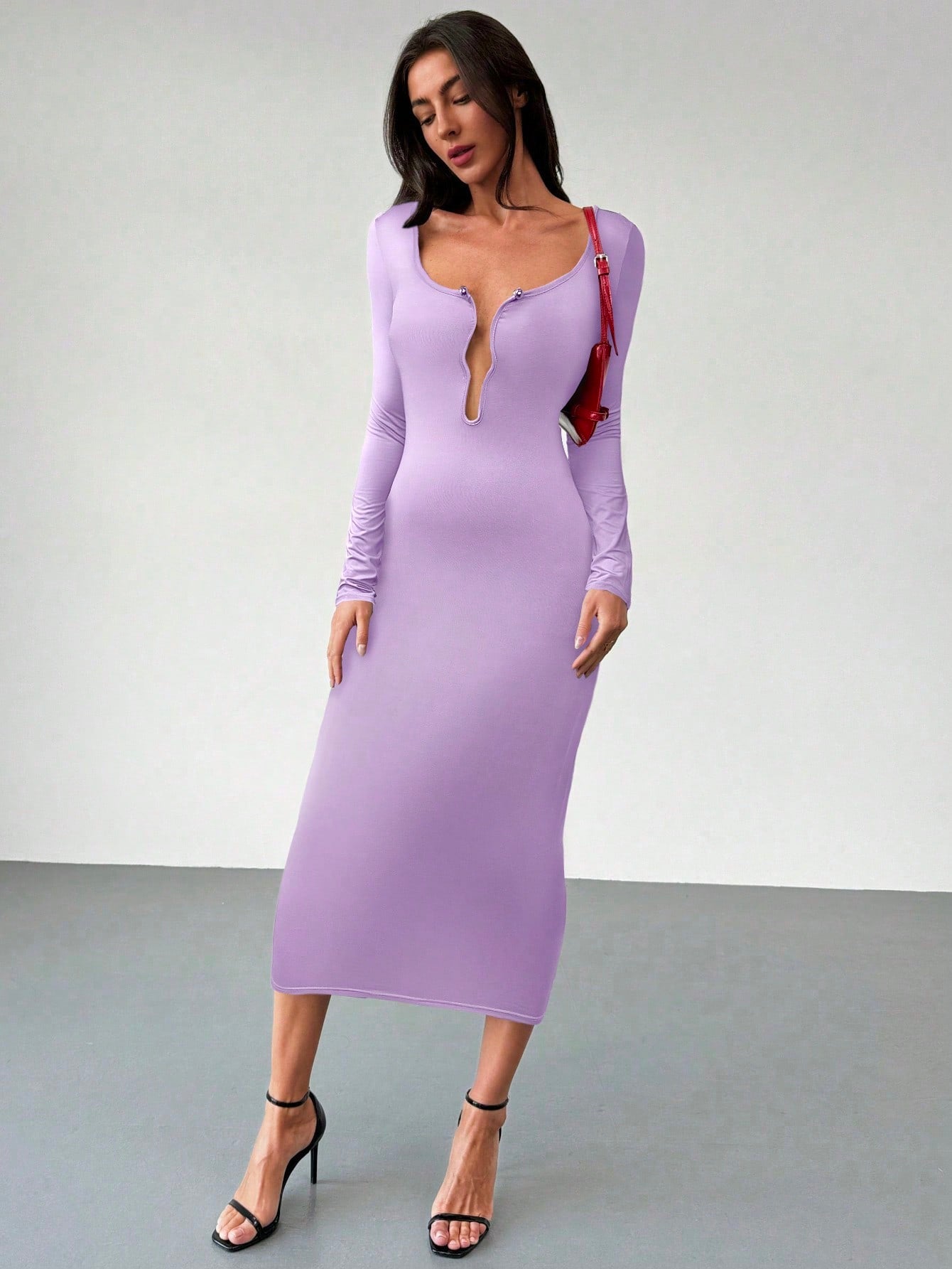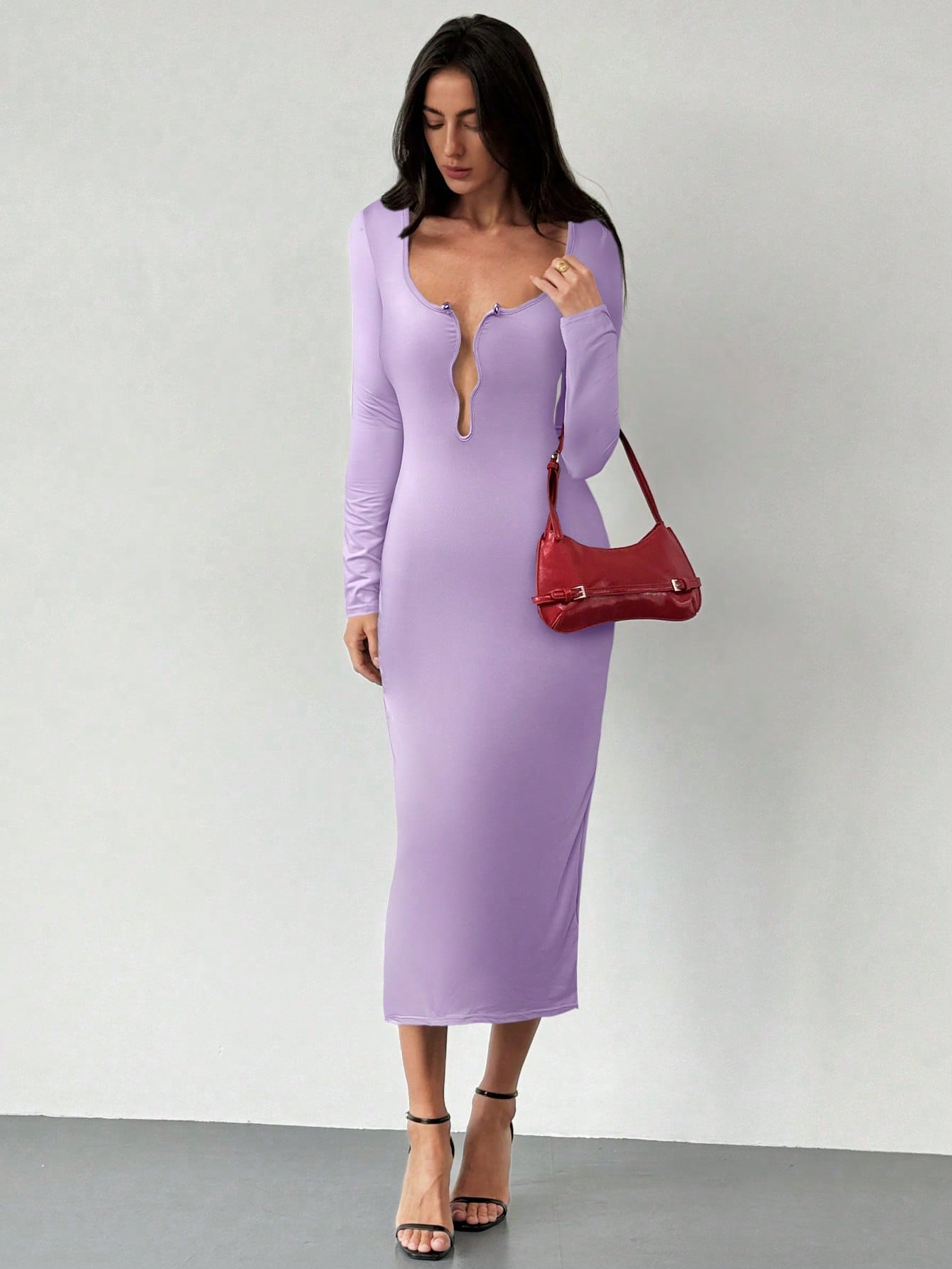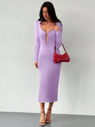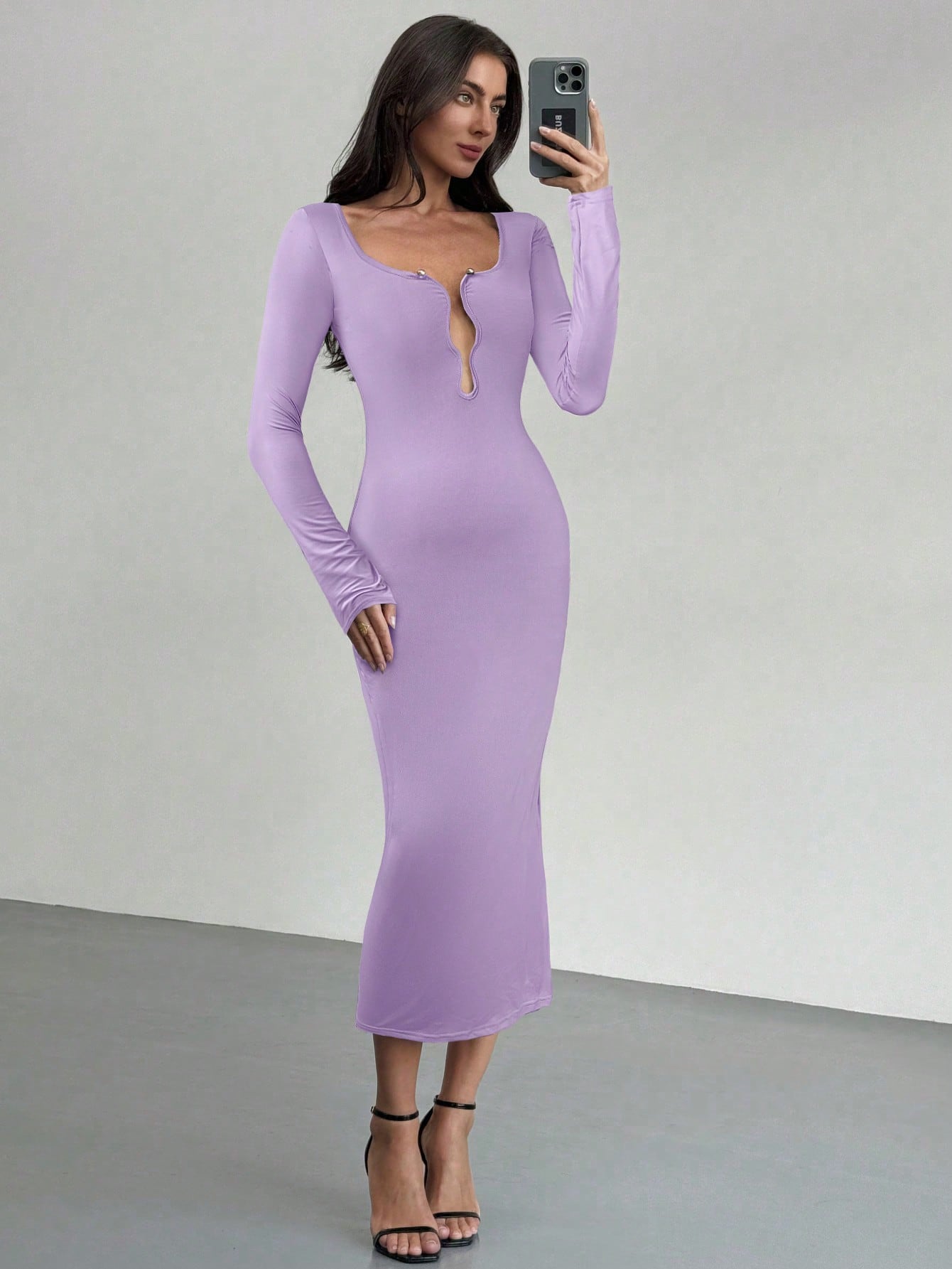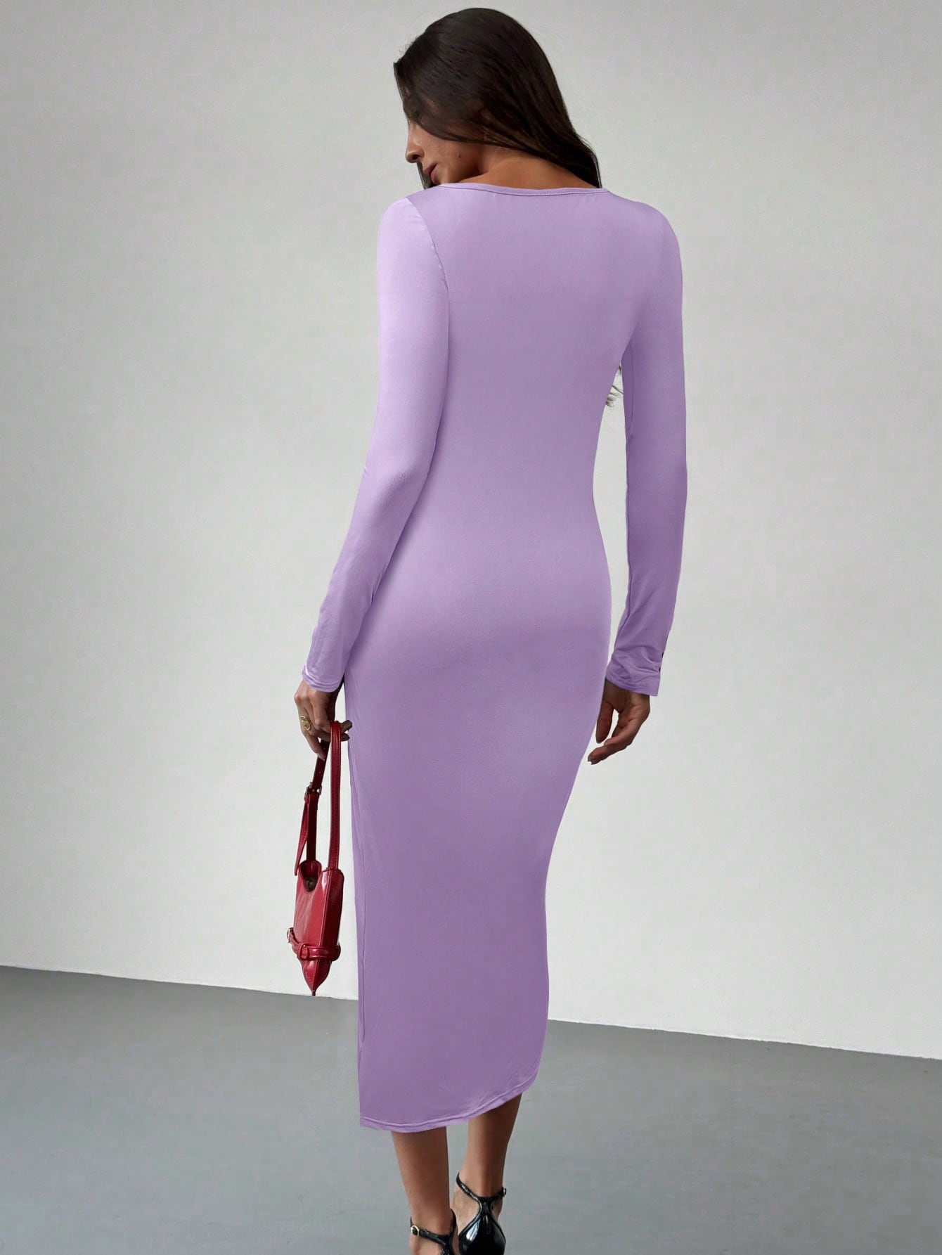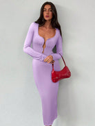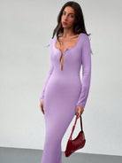 Aloruh Modern V-Neck Form-Fitting Long Sleeve Full Length Black Bodycon Dress For Women,Lavender Dress