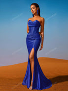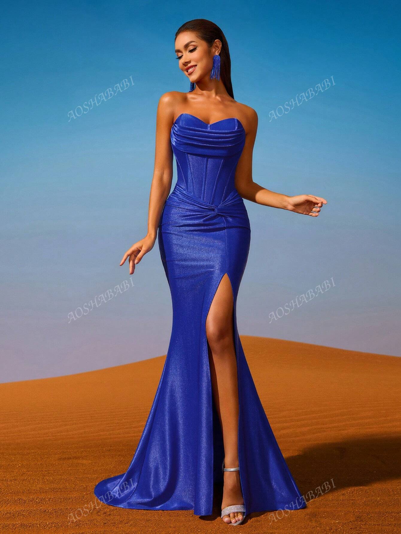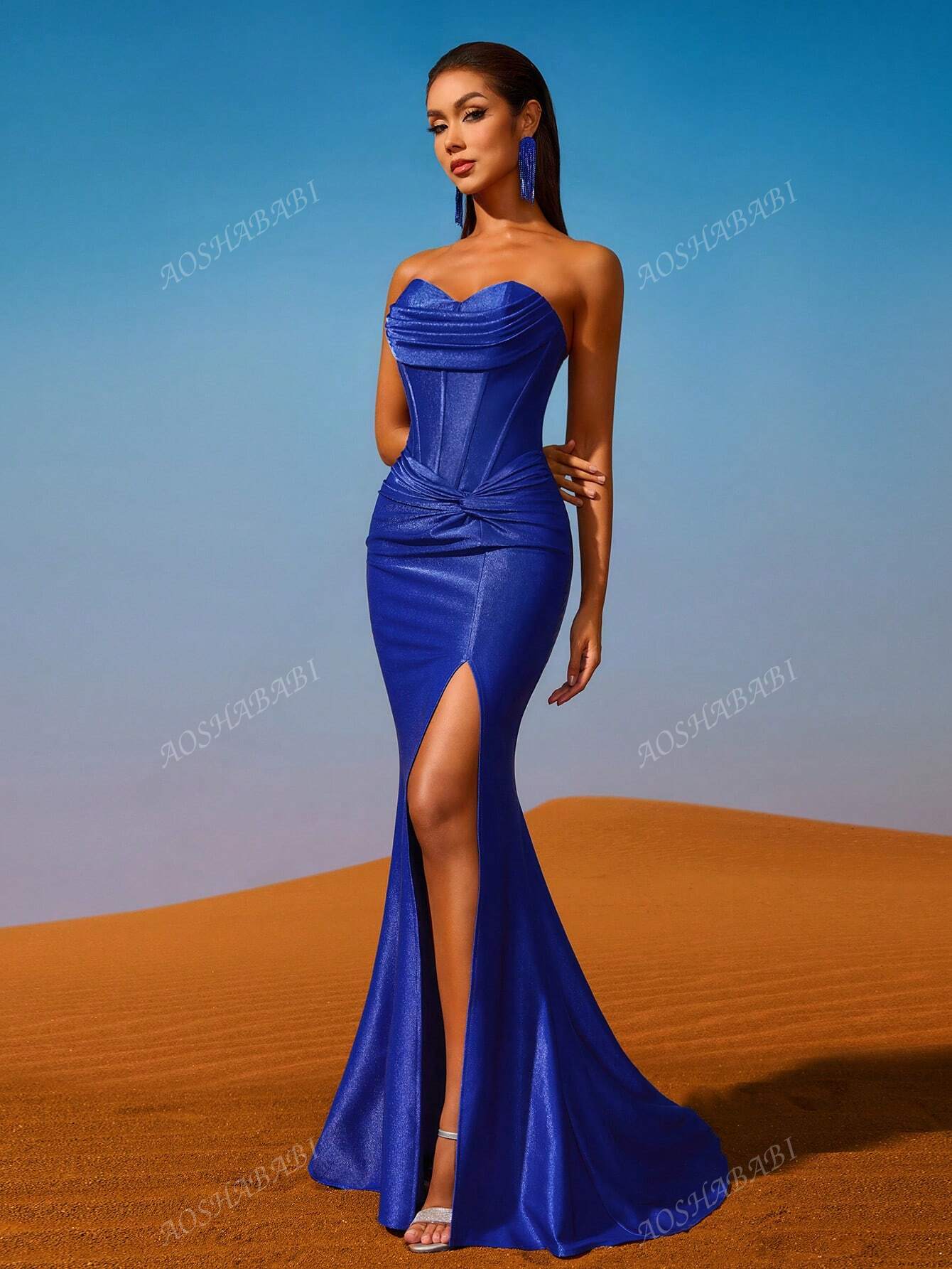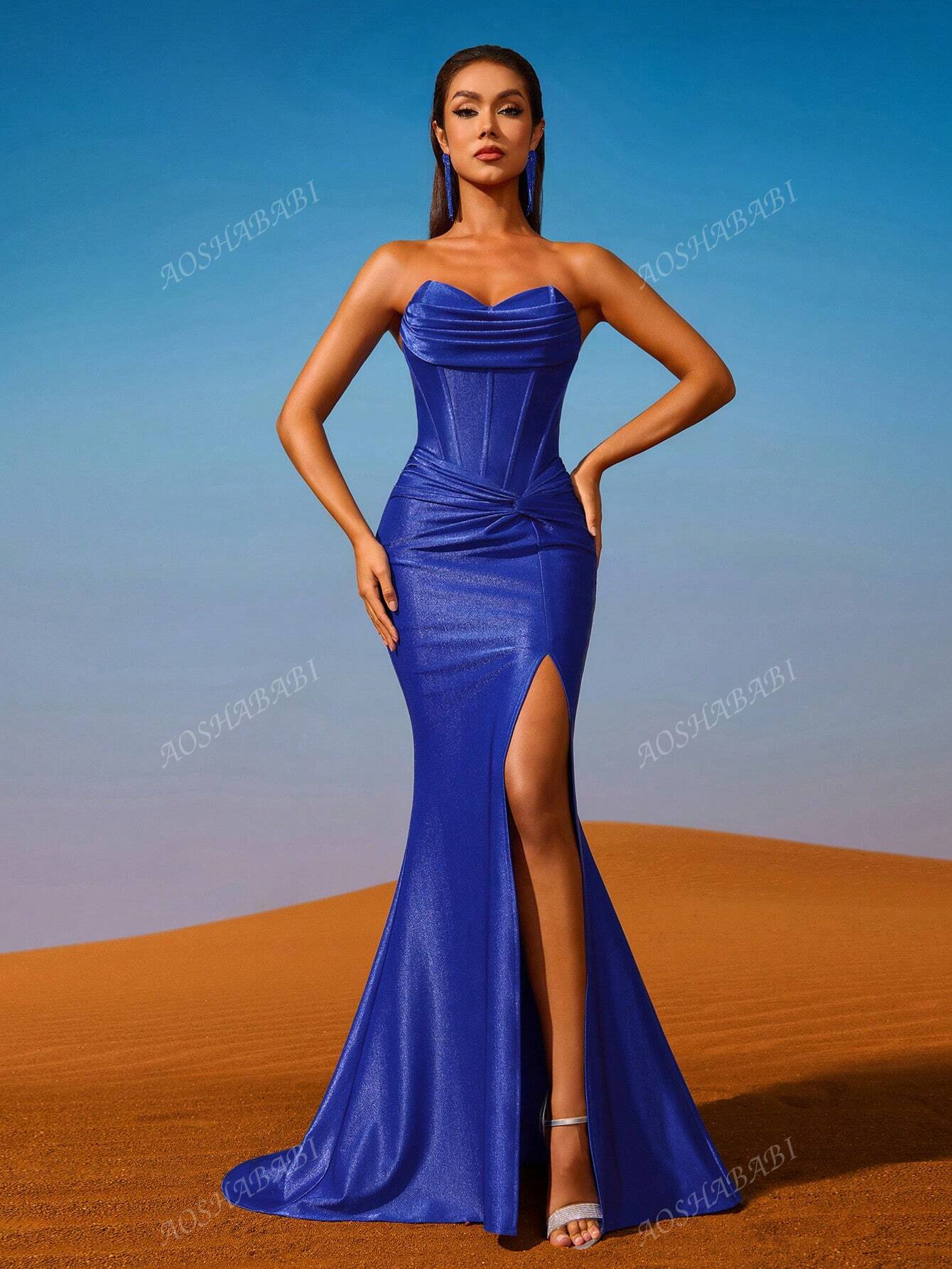 AOSHABABI Women's Glittering Satin Strapless Sweetheart Neckline Fish Bone Stitching Asymmetric Thigh-High