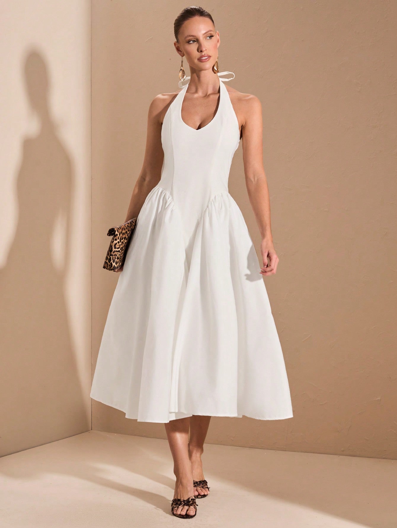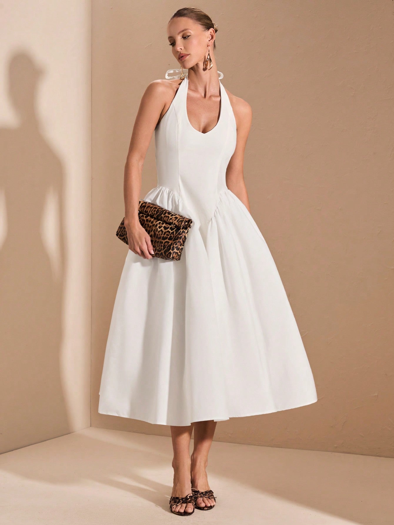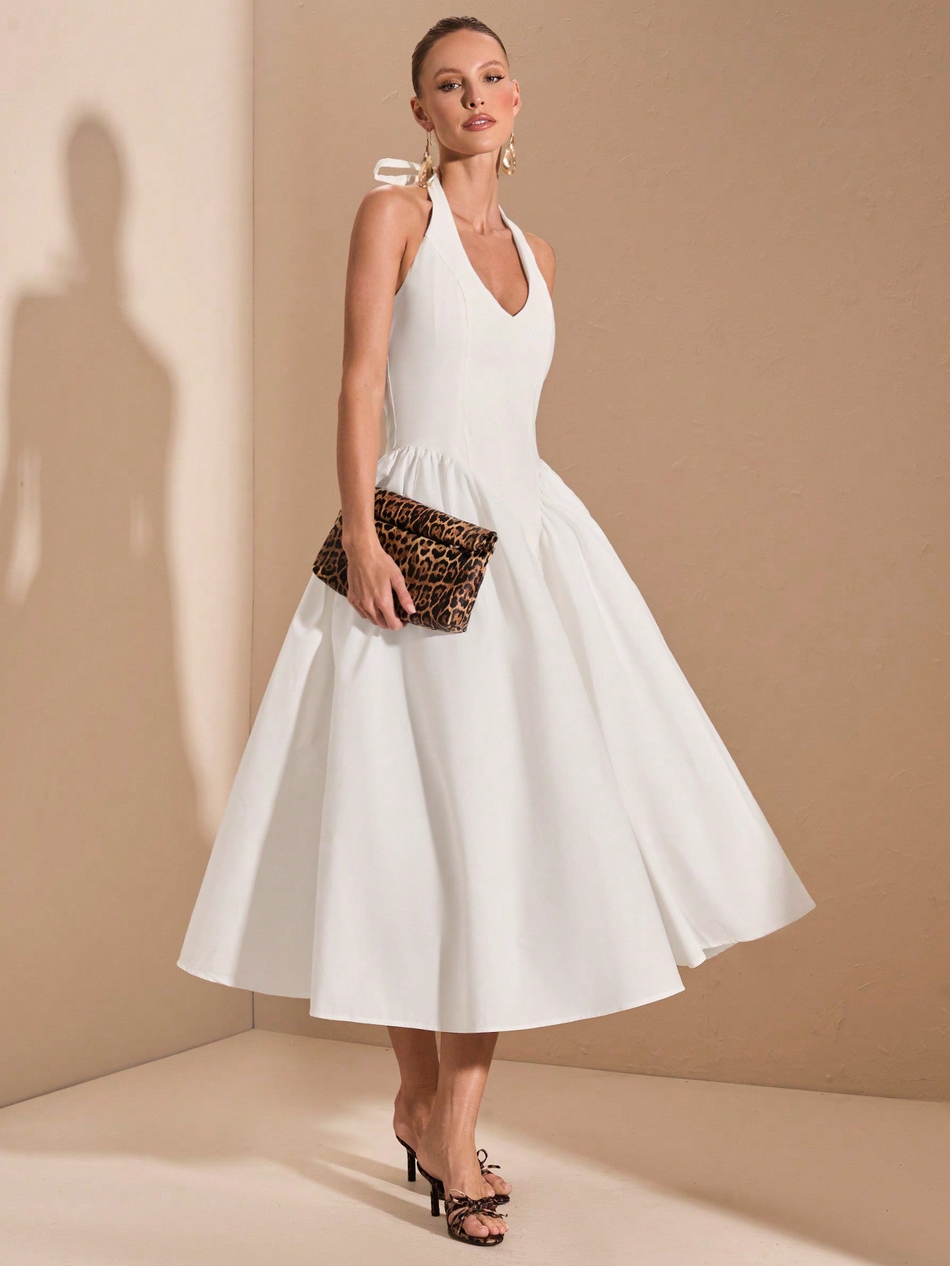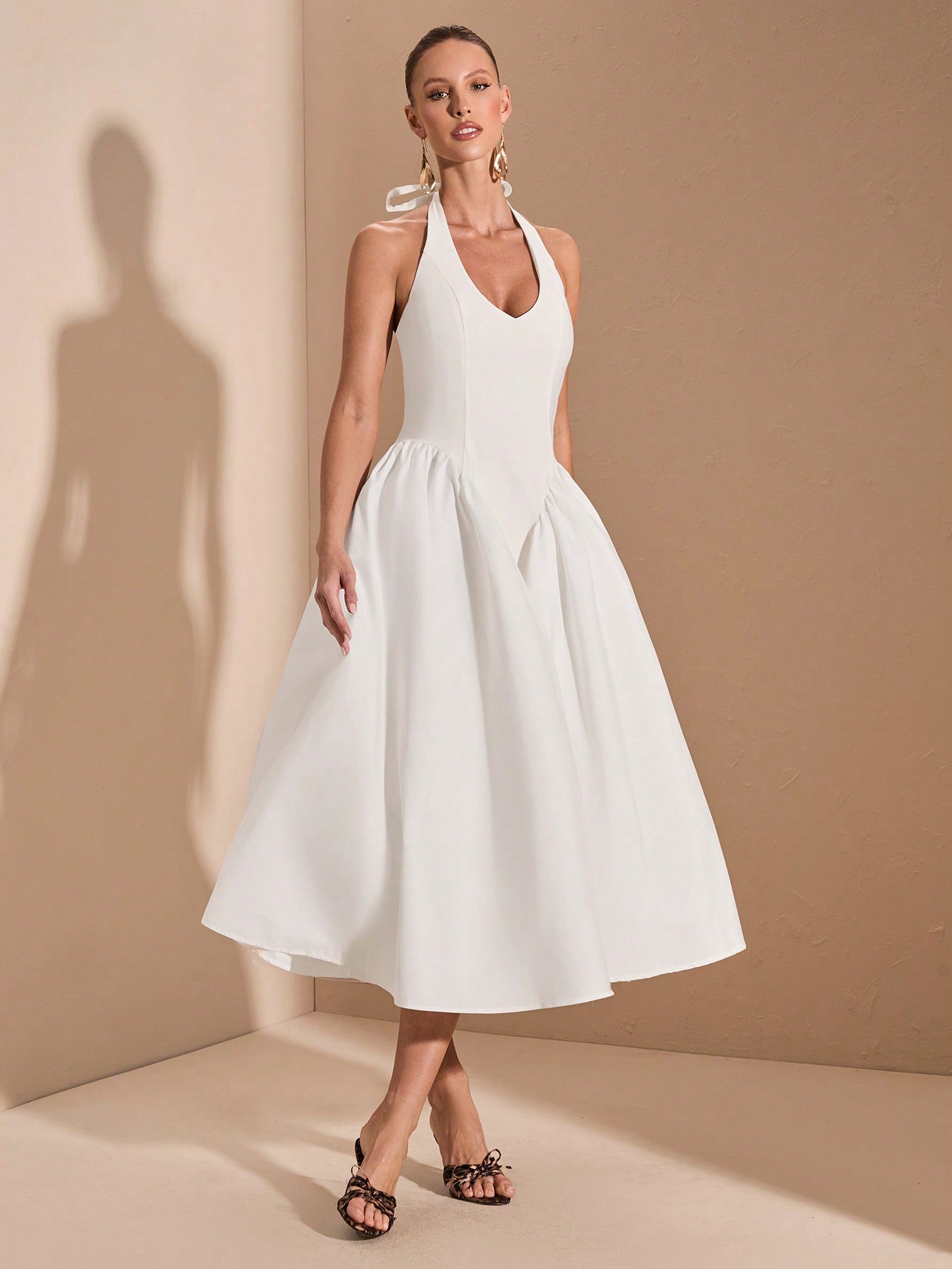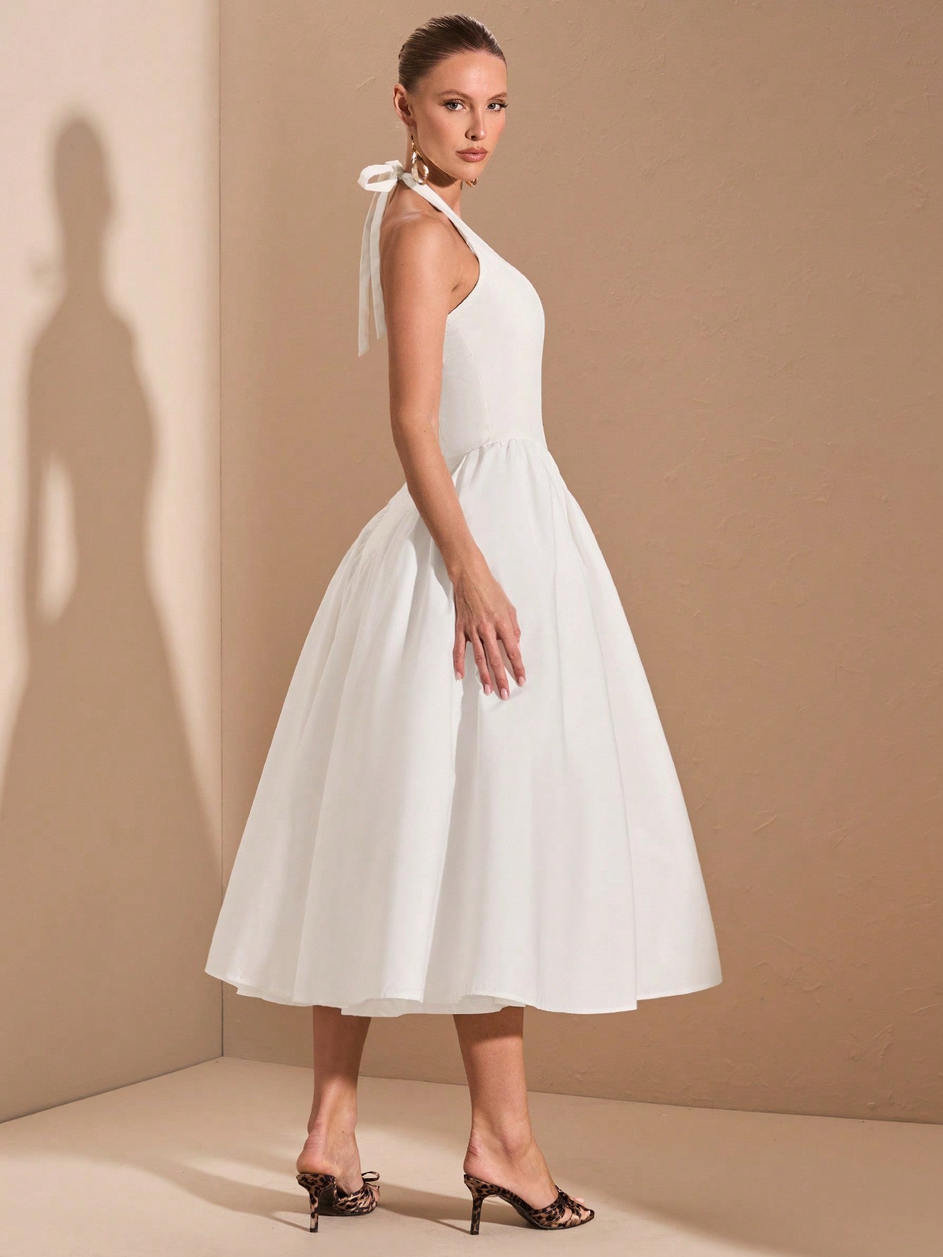 BAE Pure White Deep V-Neck Tie Waist Puff Dress For Formal Occasions, Graduation, Cocktail Party, Romantic