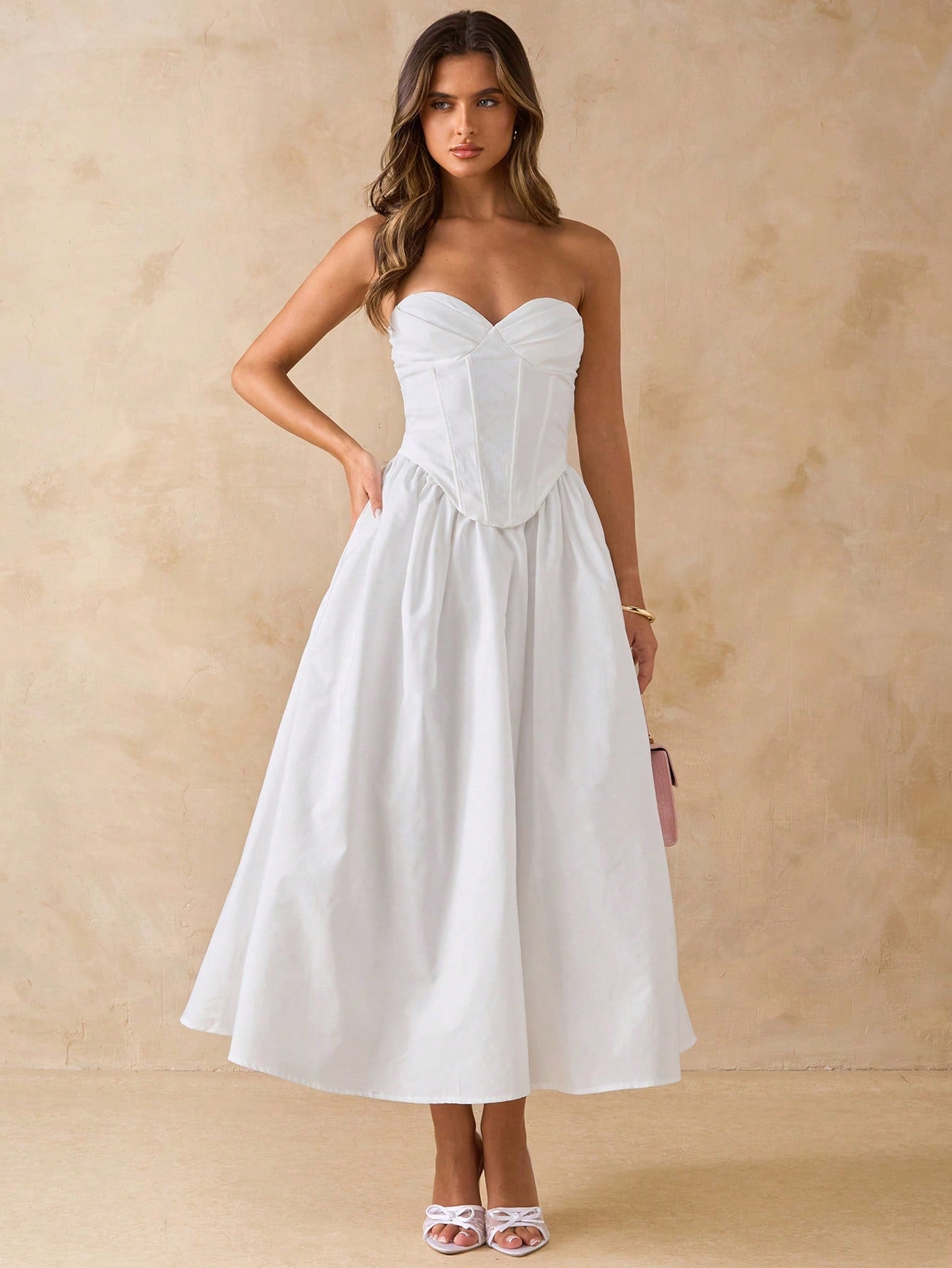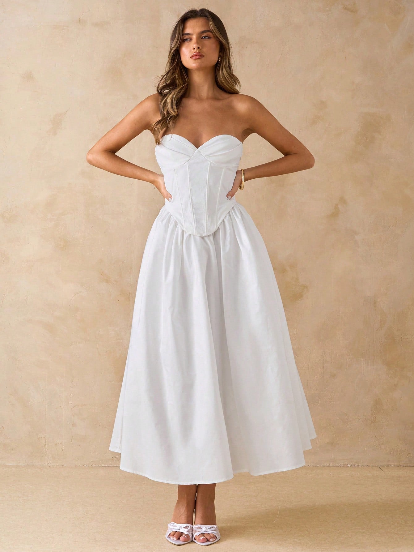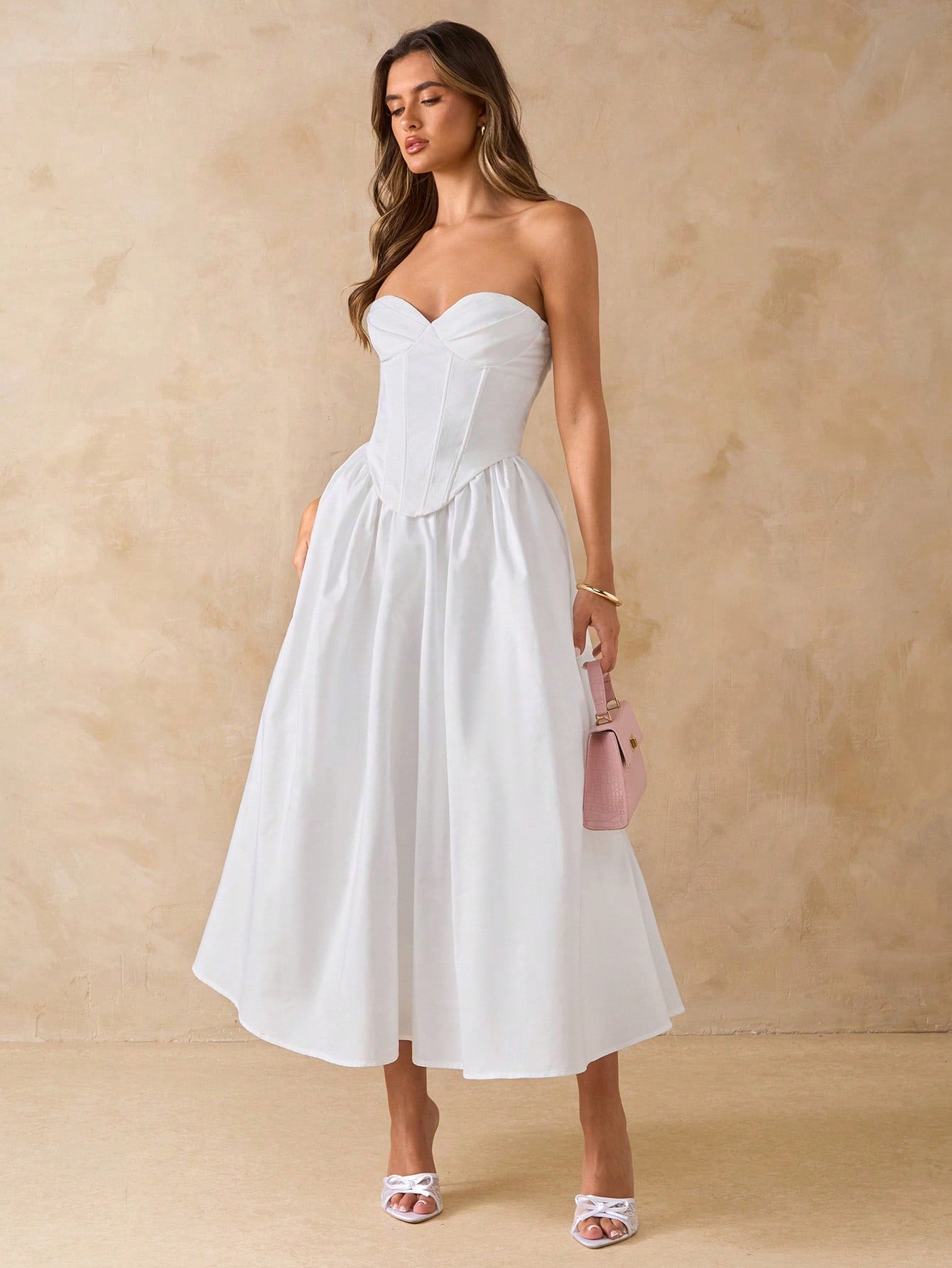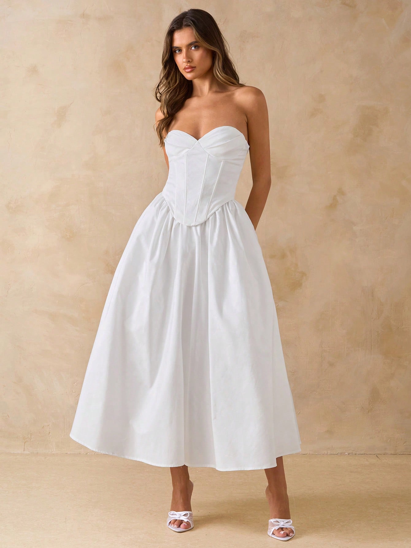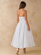 BAE Solid White Elegant Midi Dress With Bow, Slim Fit Casual Dress For Dates, Vacation, Party, Birthday,