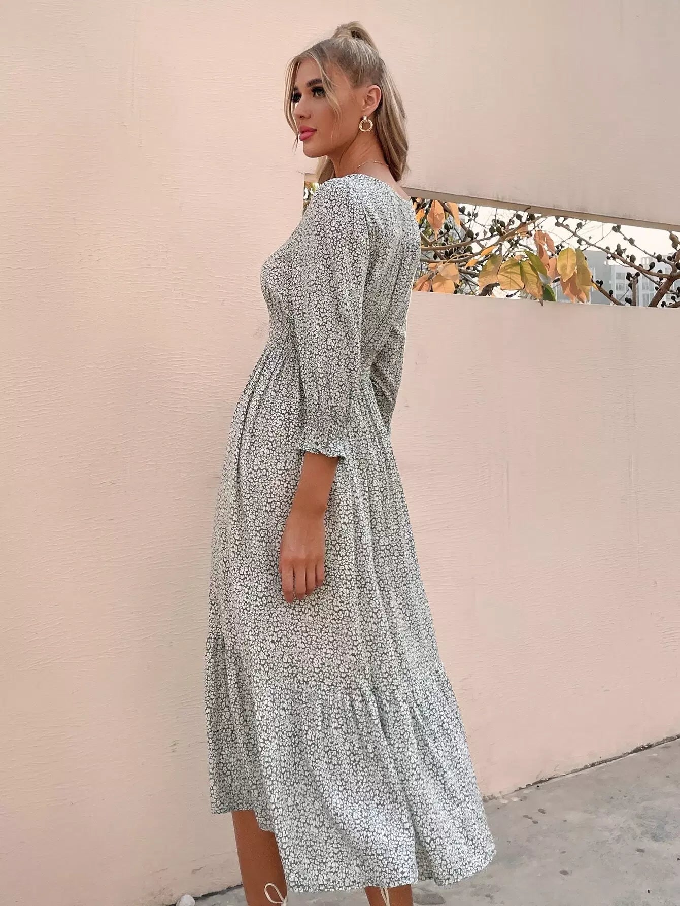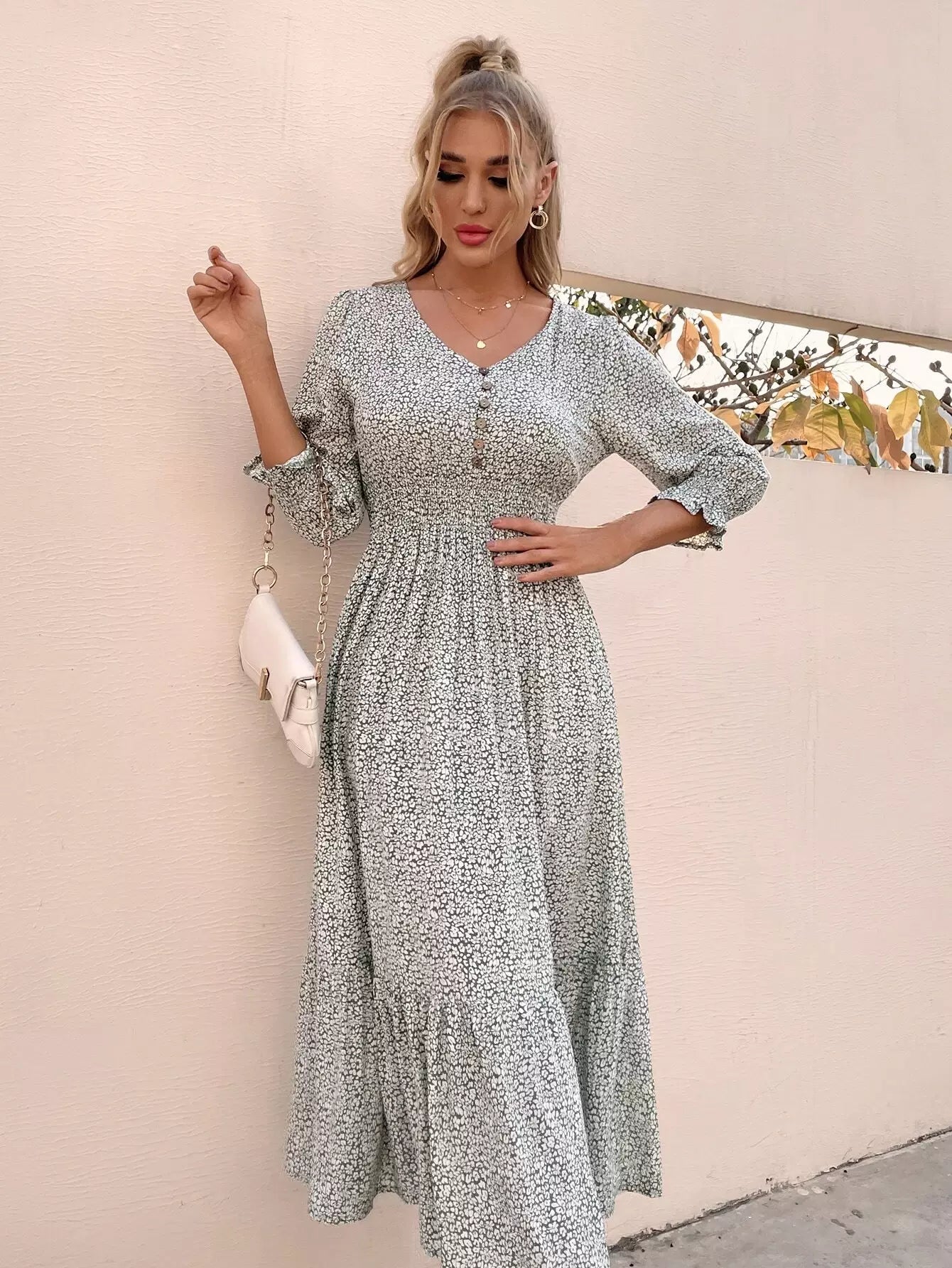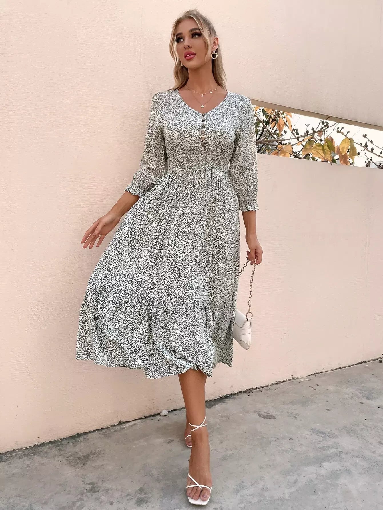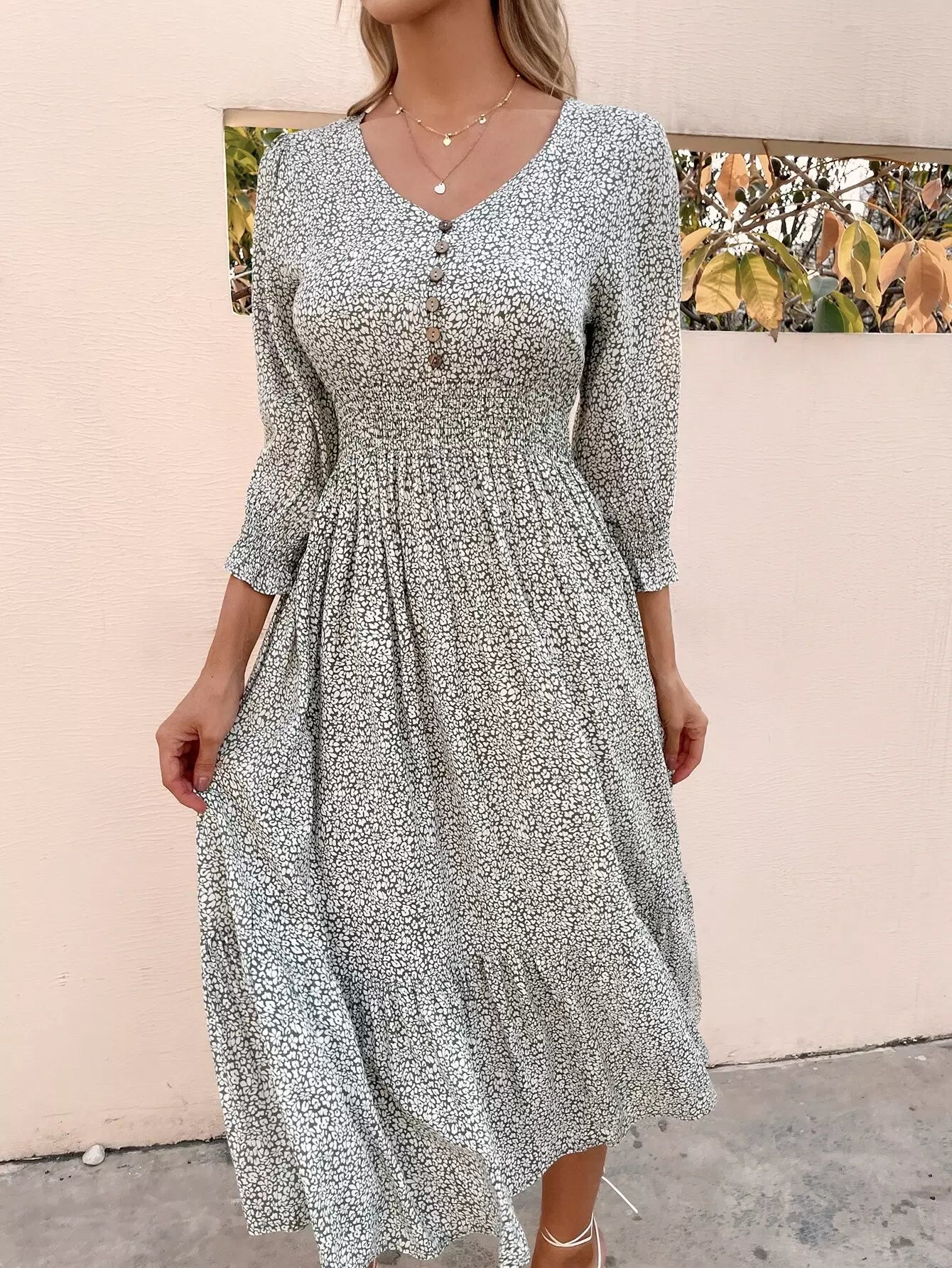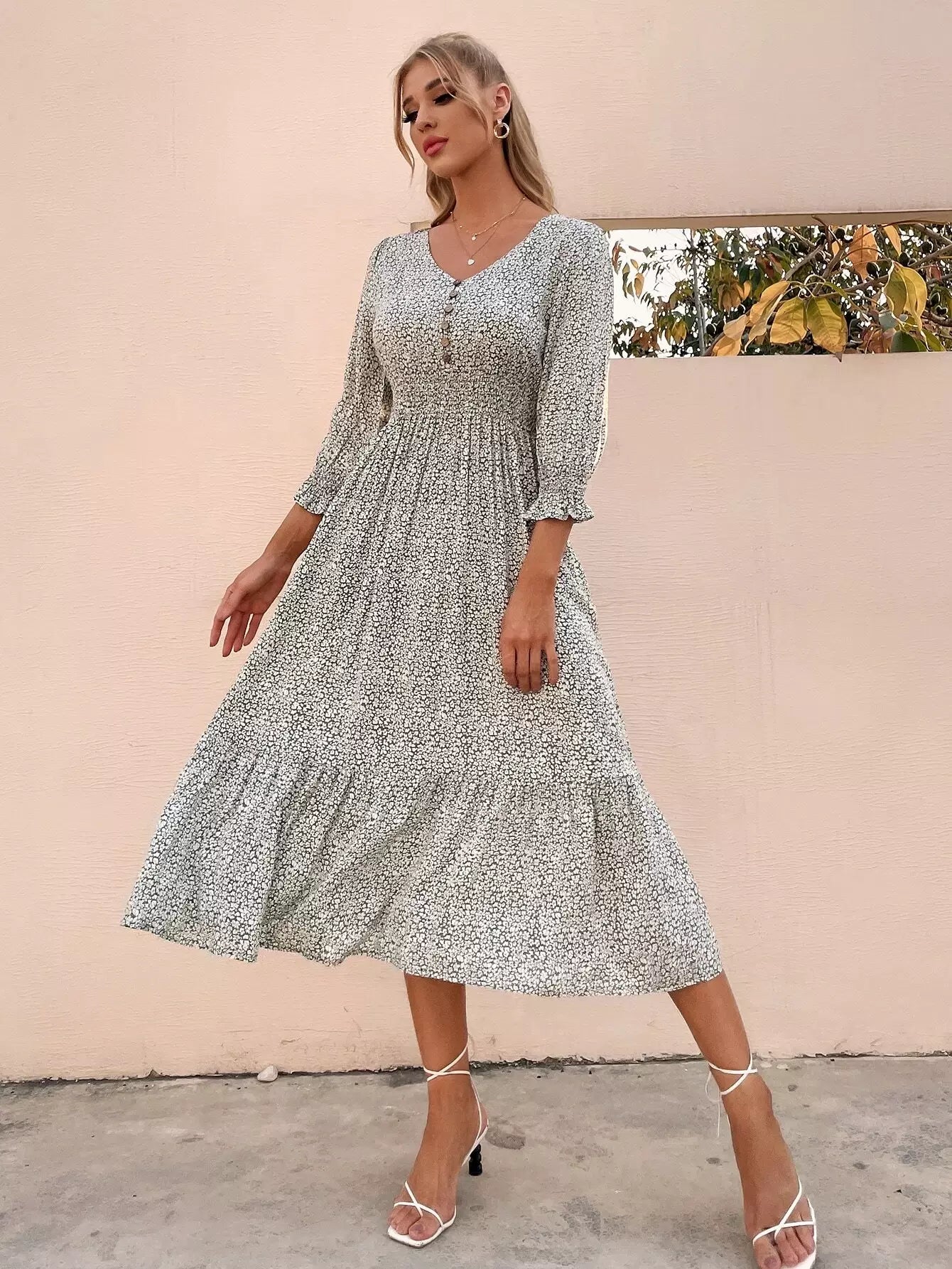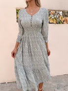 Button Front Shirred Waist Ditsy Floral Dress
