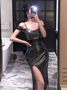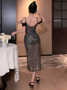 DAZY Sheer Mesh Sequins Bodycon Splice Off Shoulder Sexy High Slit Slip Dress Midi Length Evening Dress
