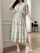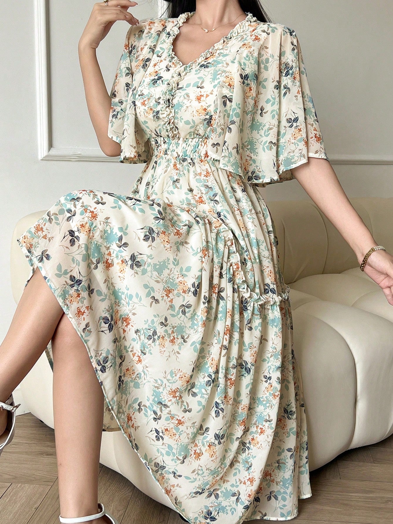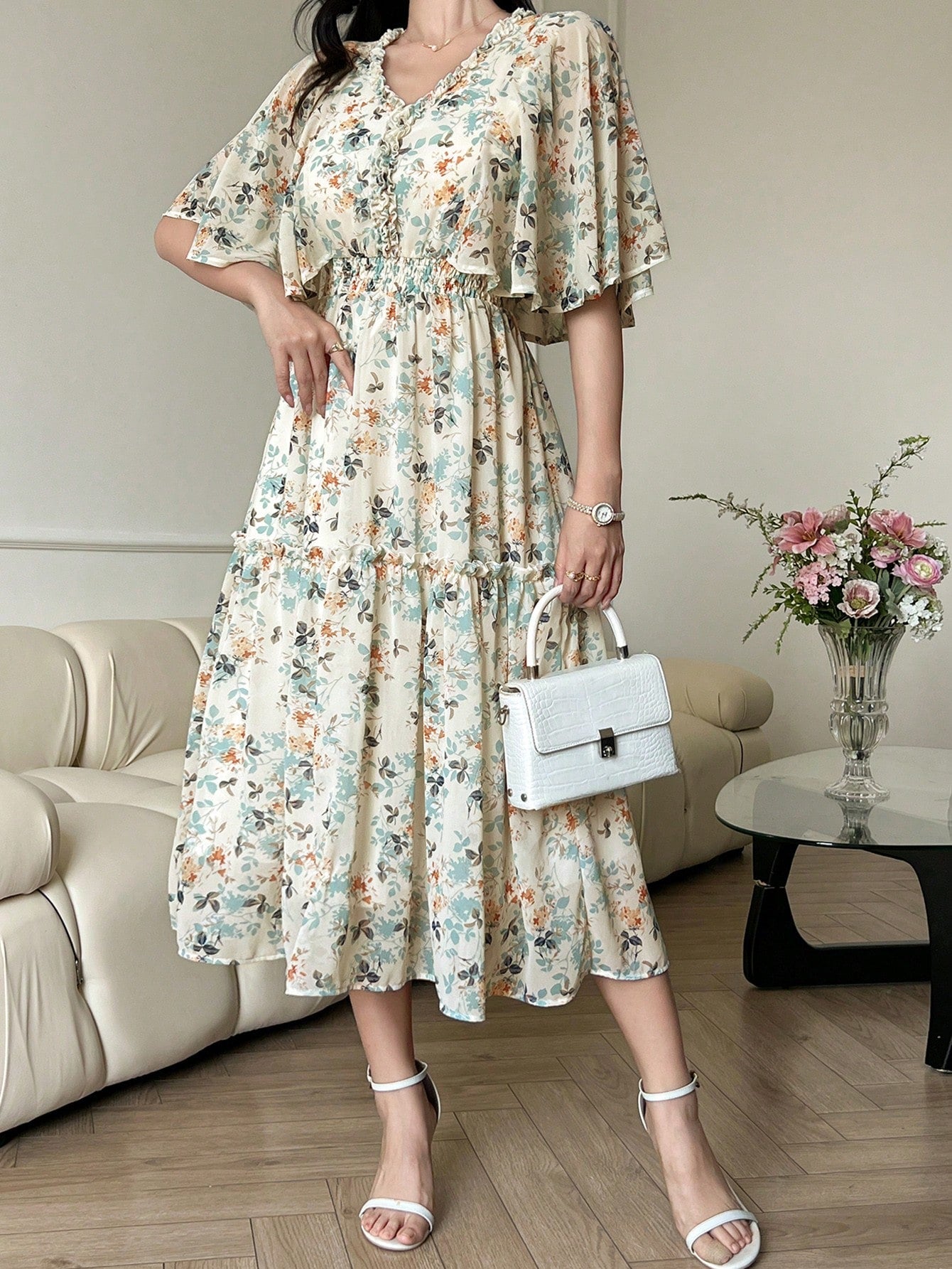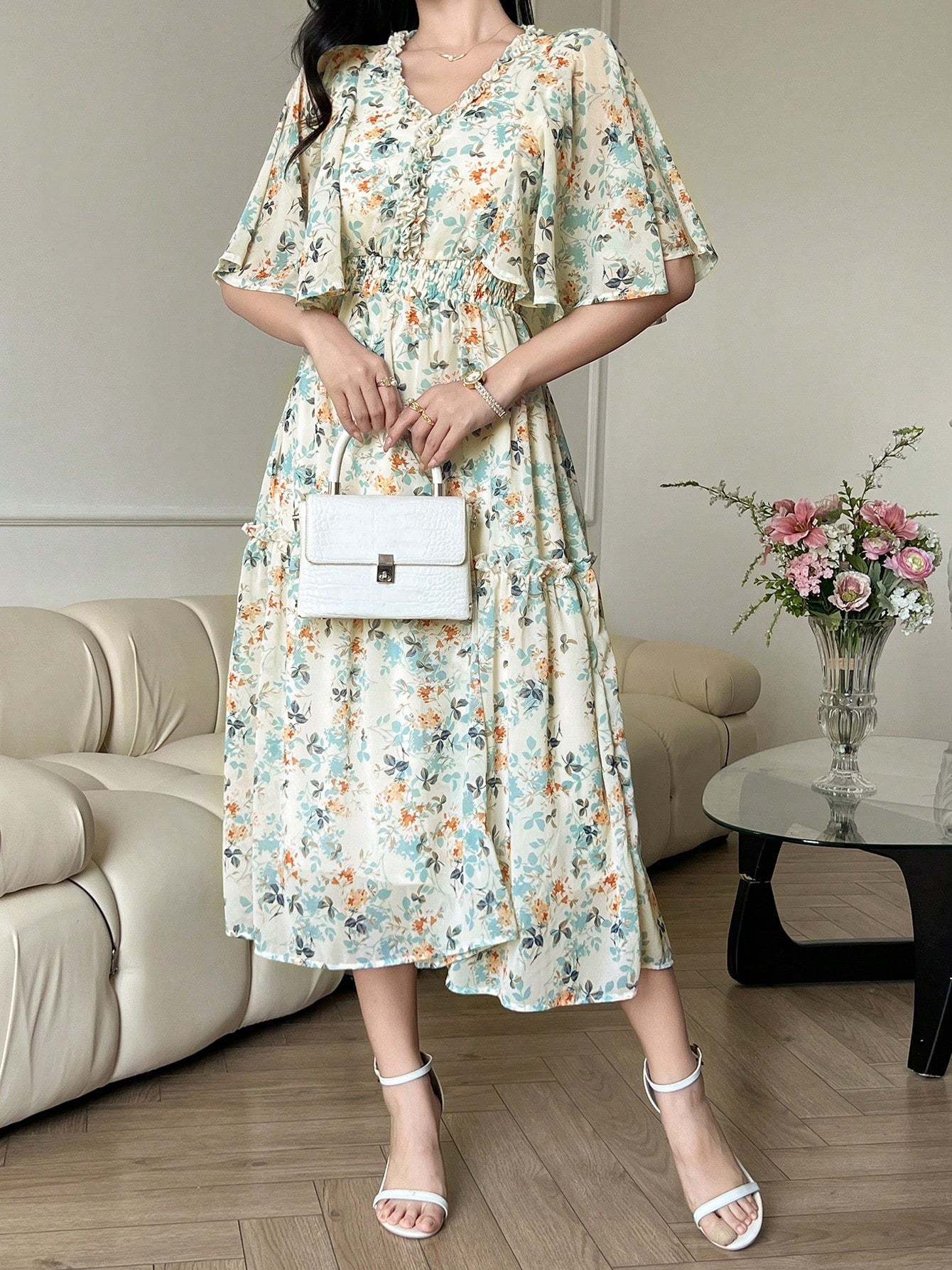 DAZY Shirred Floral Full-Body With Ruffle Hem & Flutter Sleeve Women's Mid-Length Dress, For Spring