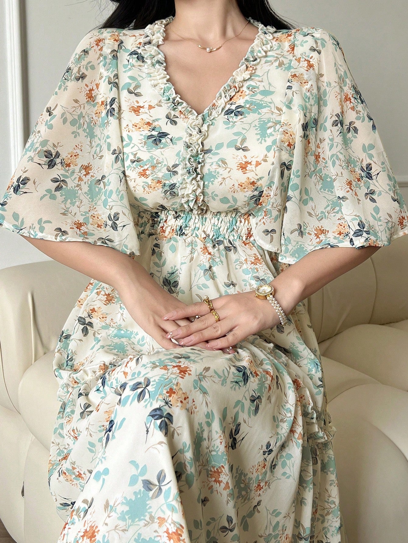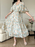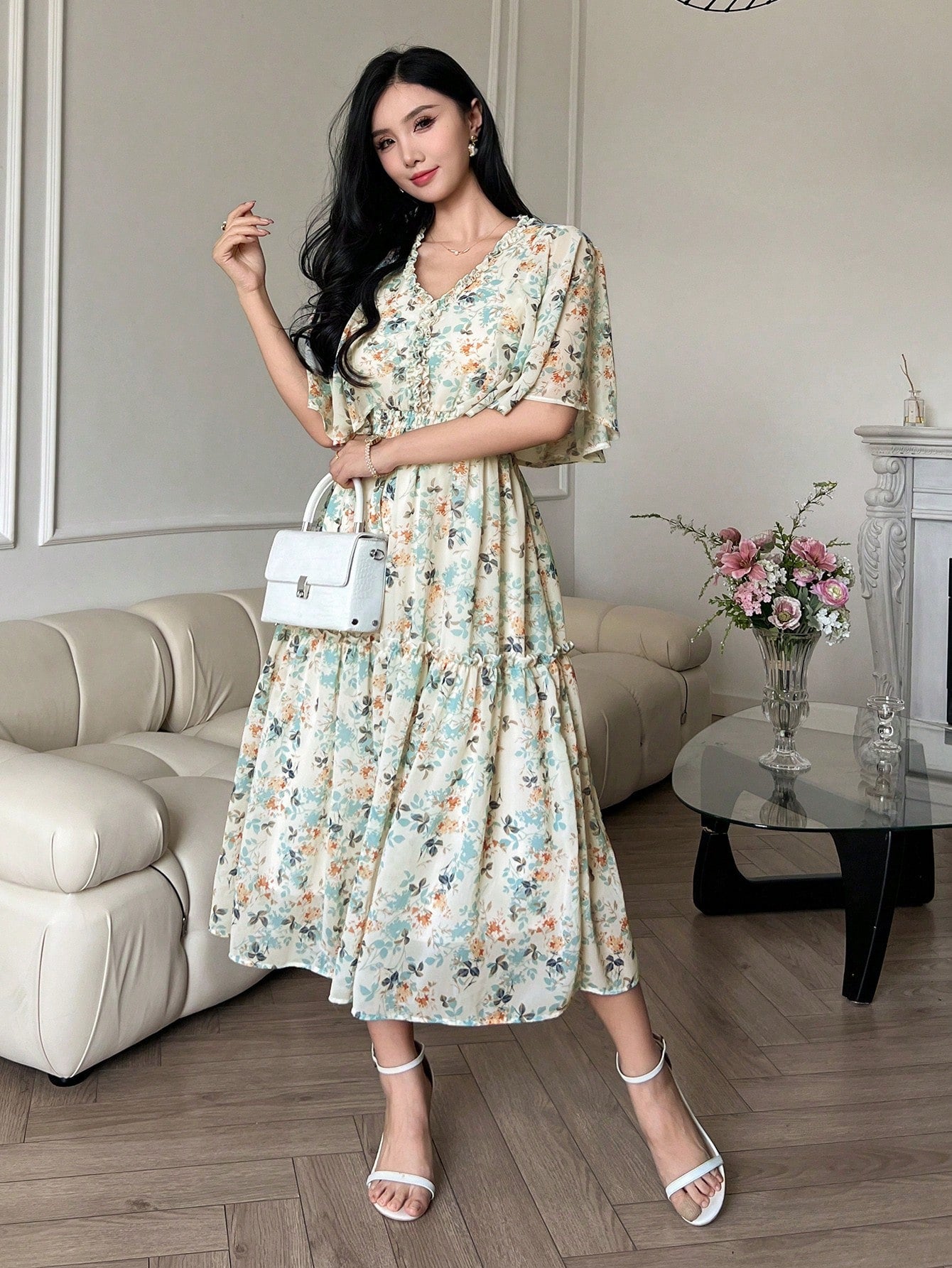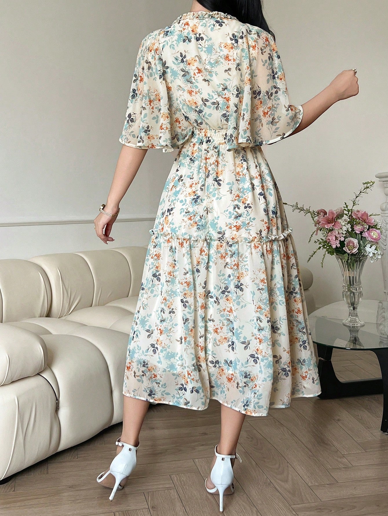 DAZY Shirred Floral Full-Body With Ruffle Hem & Flutter Sleeve Women's Mid-Length Dress, For Spring