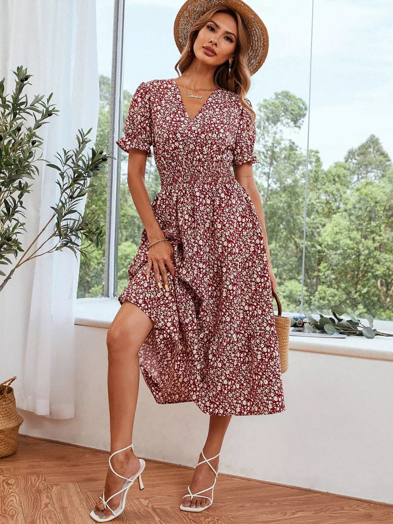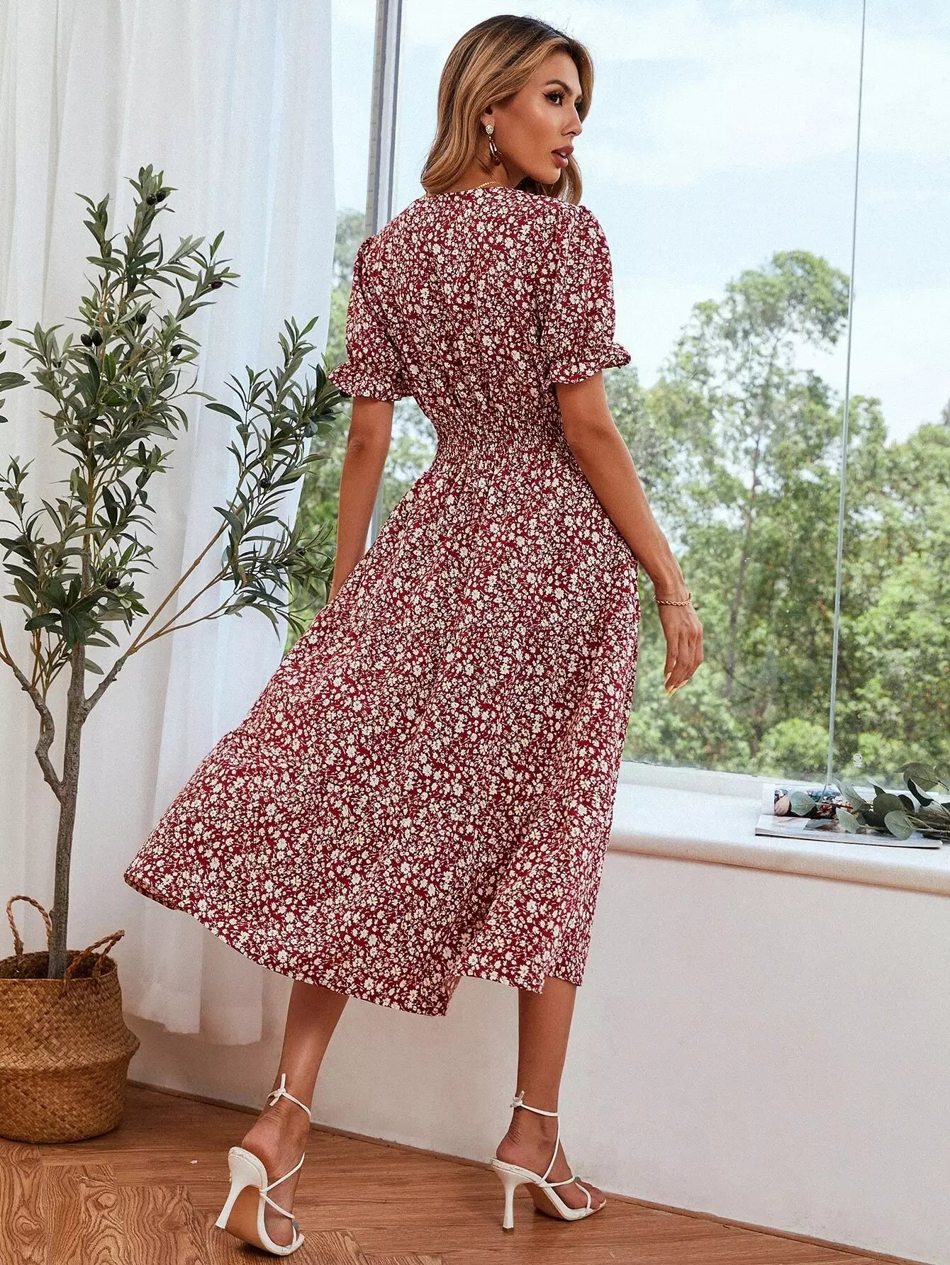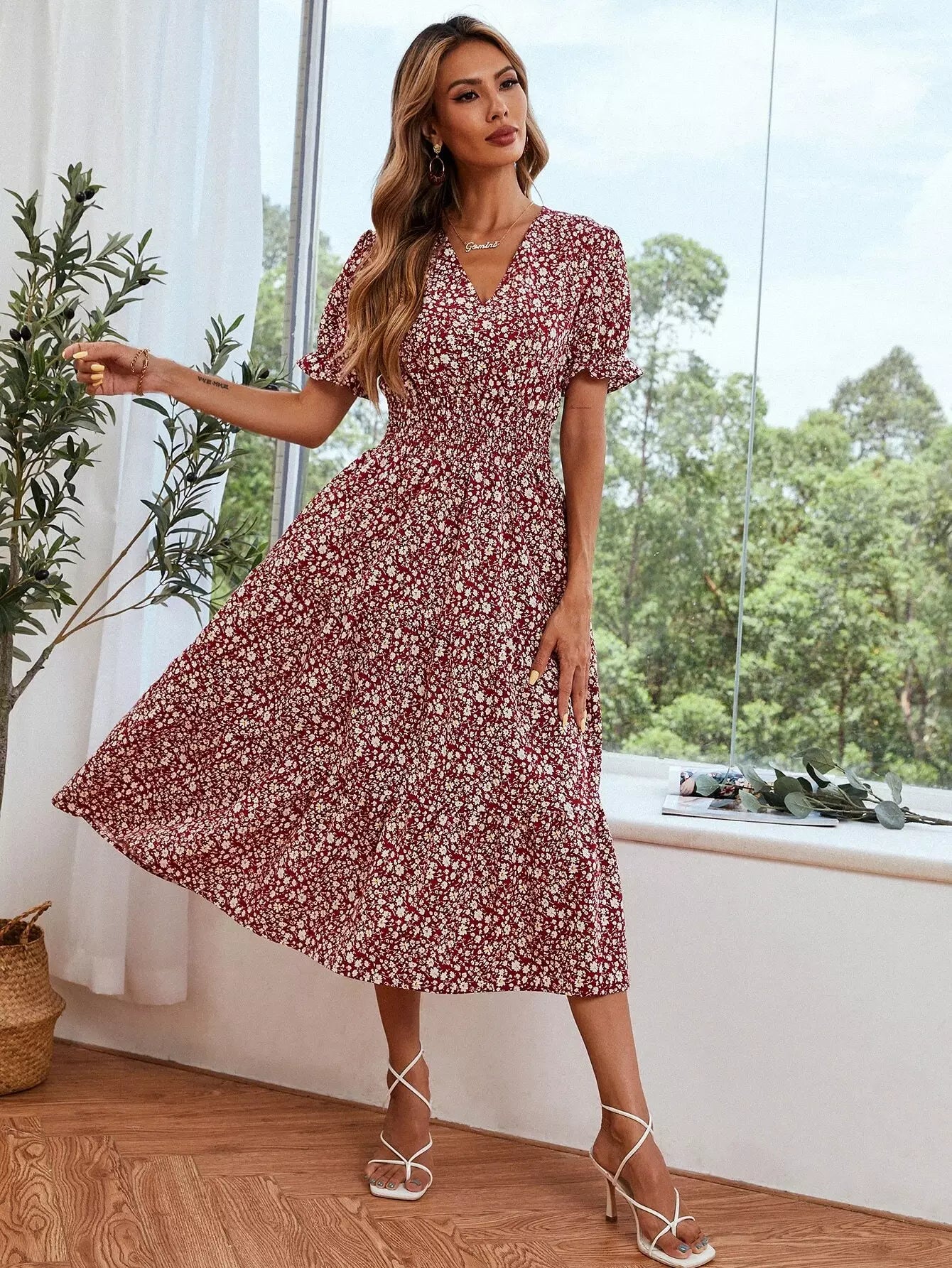 Ditsy Floral Print Shirred Waist Flounce Sleeve Dress