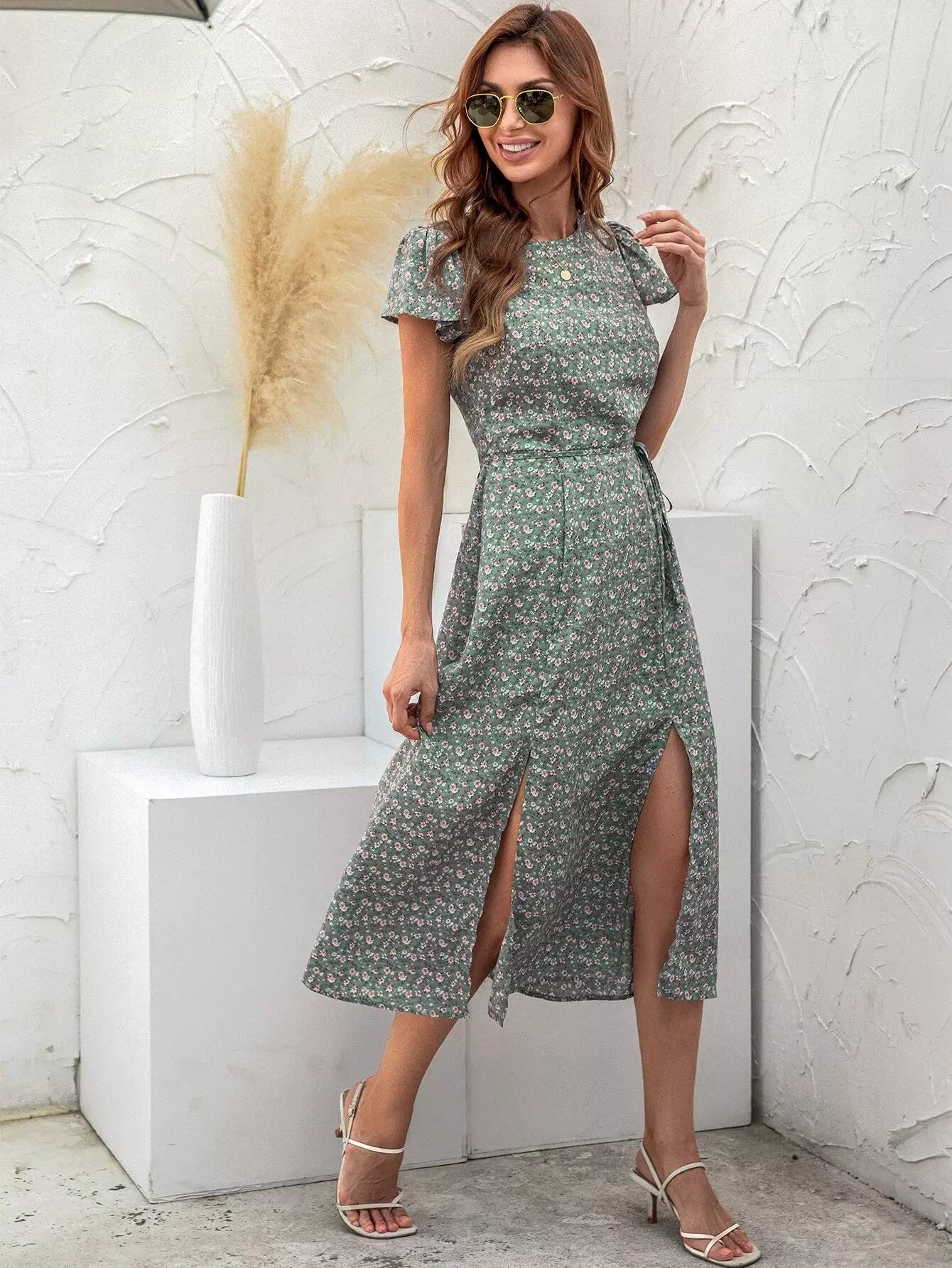 Ditsy Floral Print Slit Hem Dress Without Belt