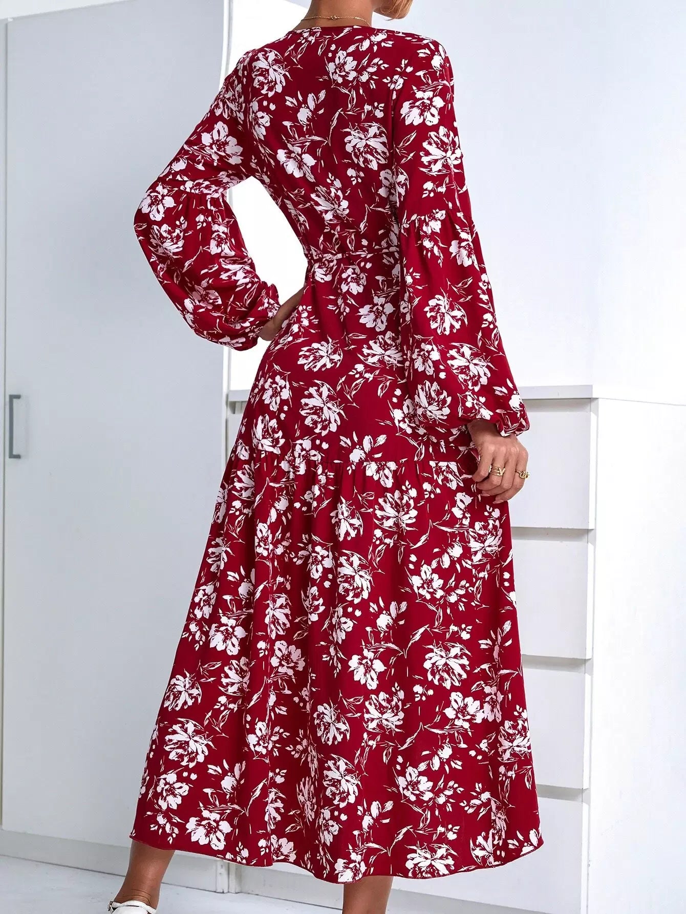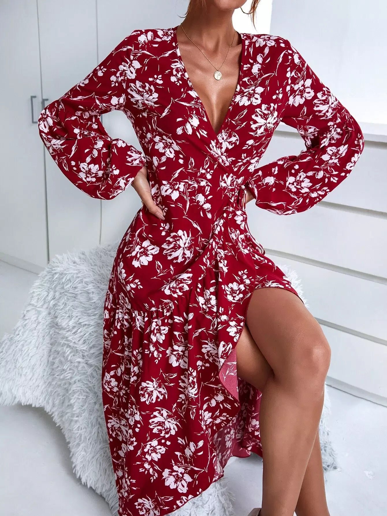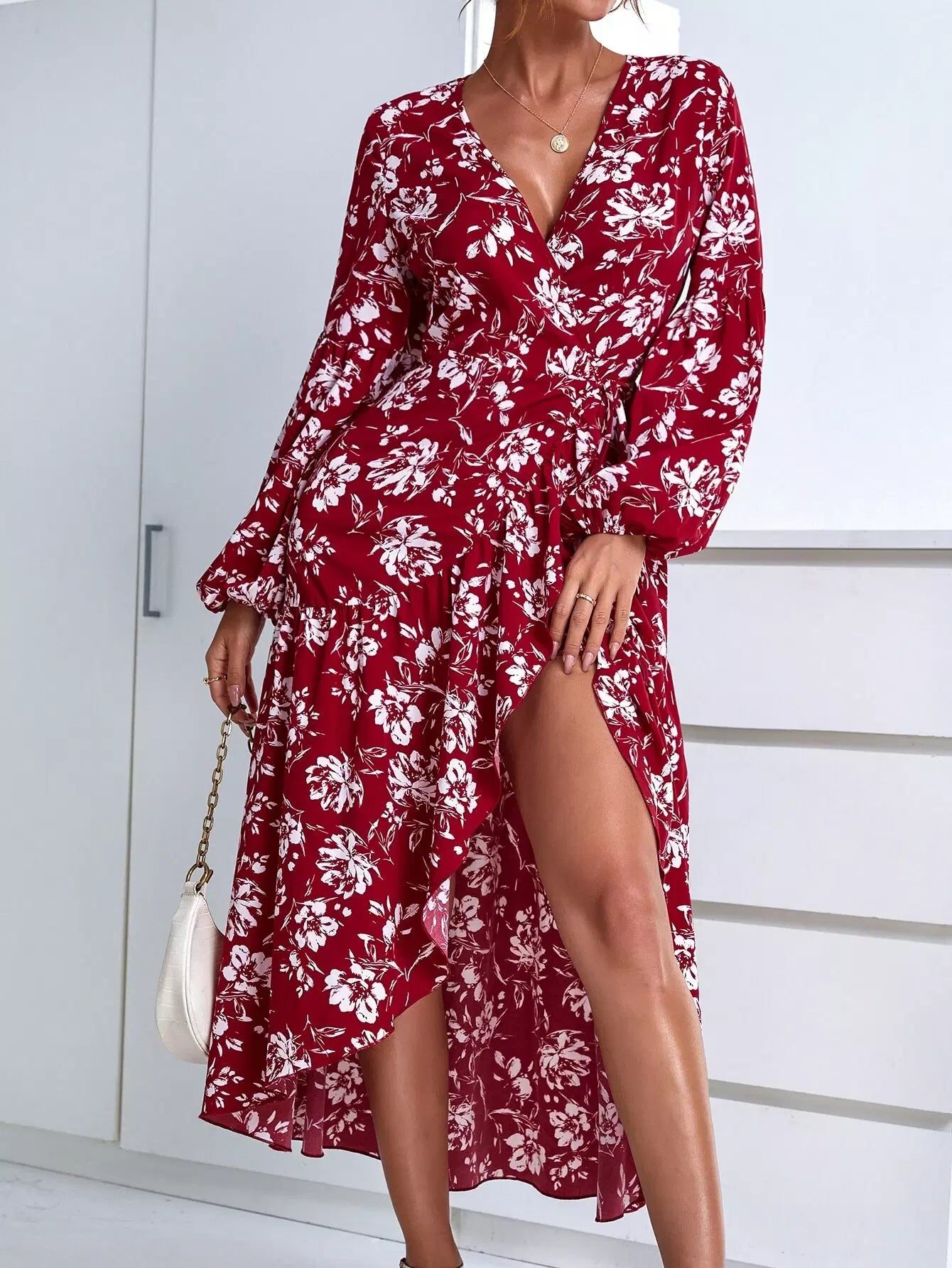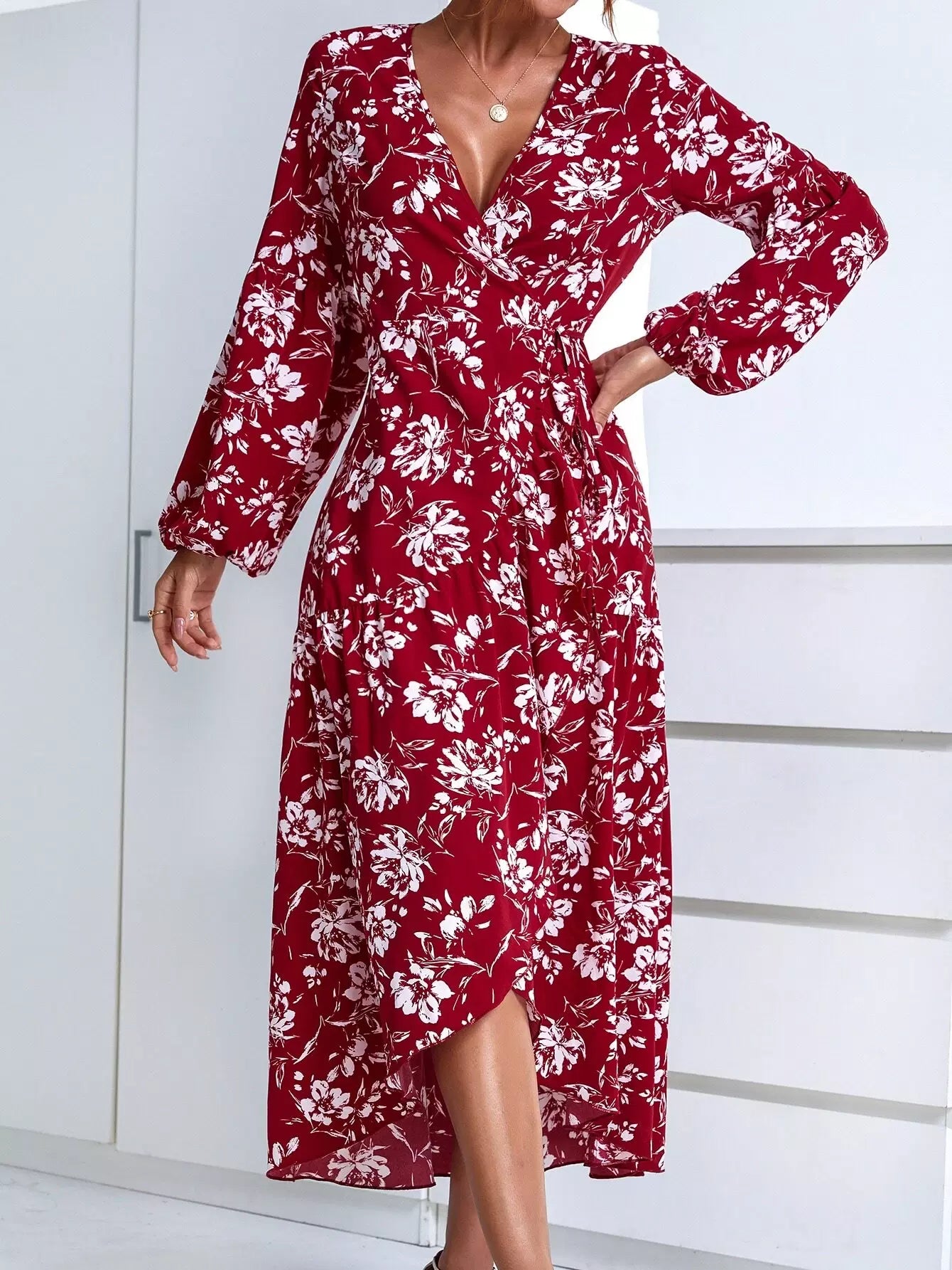 Floral Print Lantern Sleeve Wrap Dress
