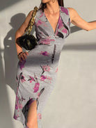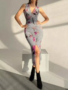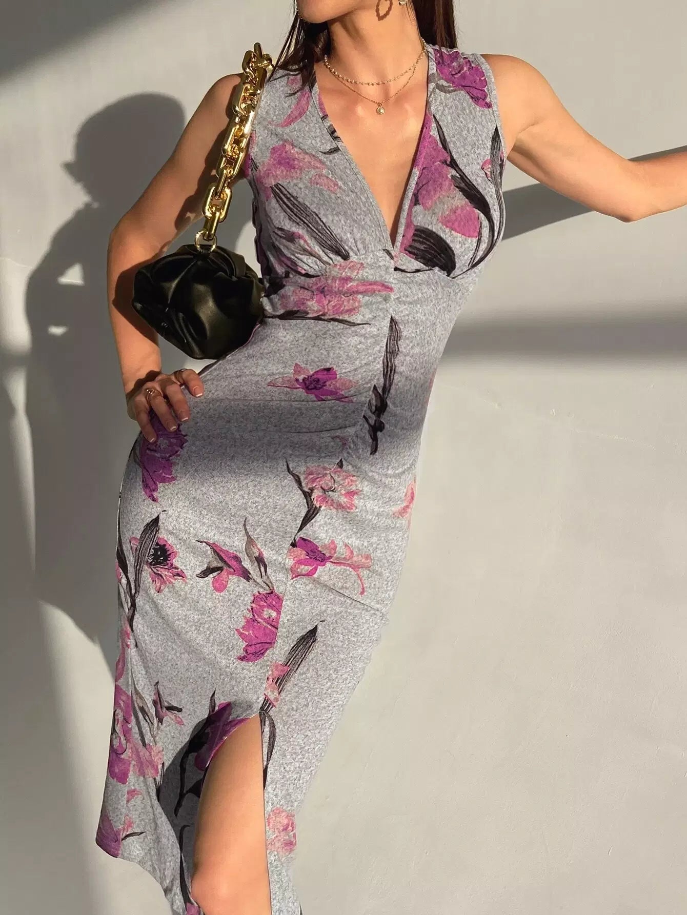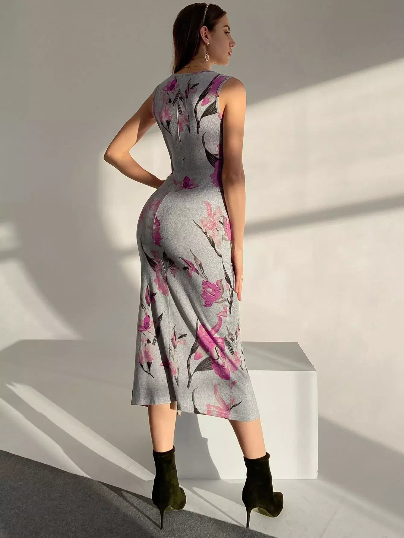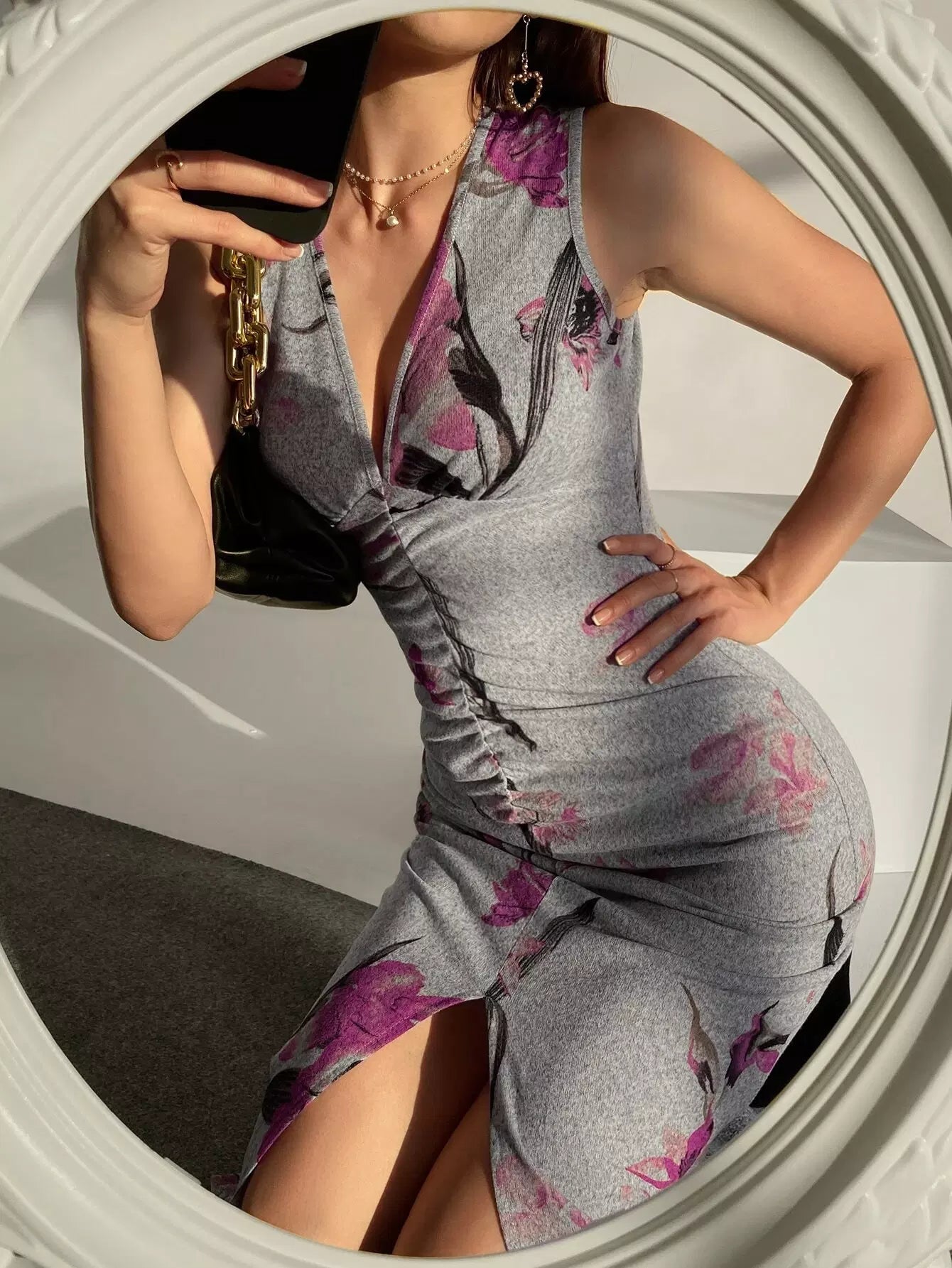 Floral Print Ruched Sleeveless Split Thigh Dress