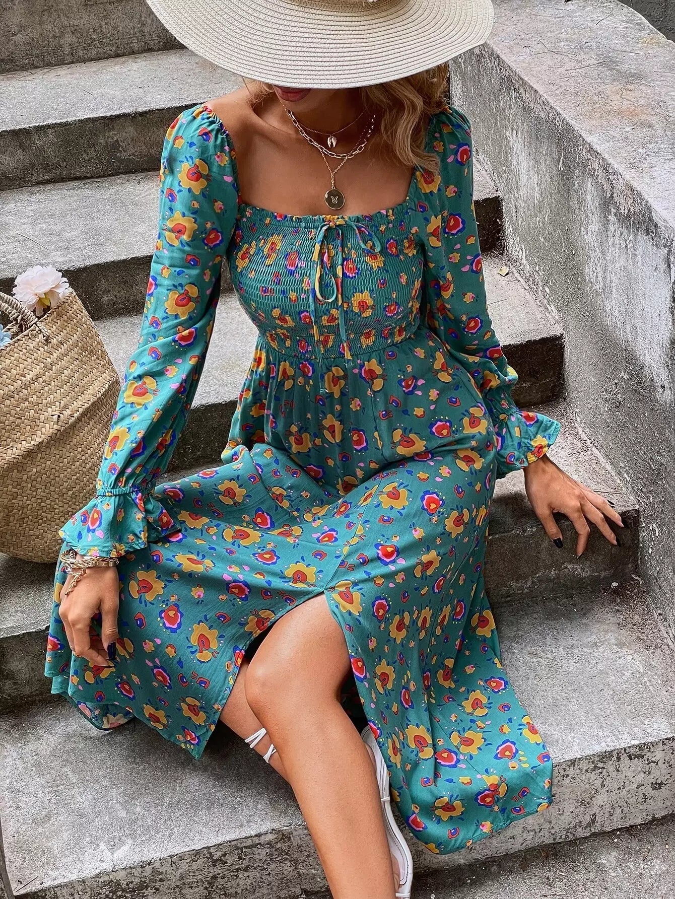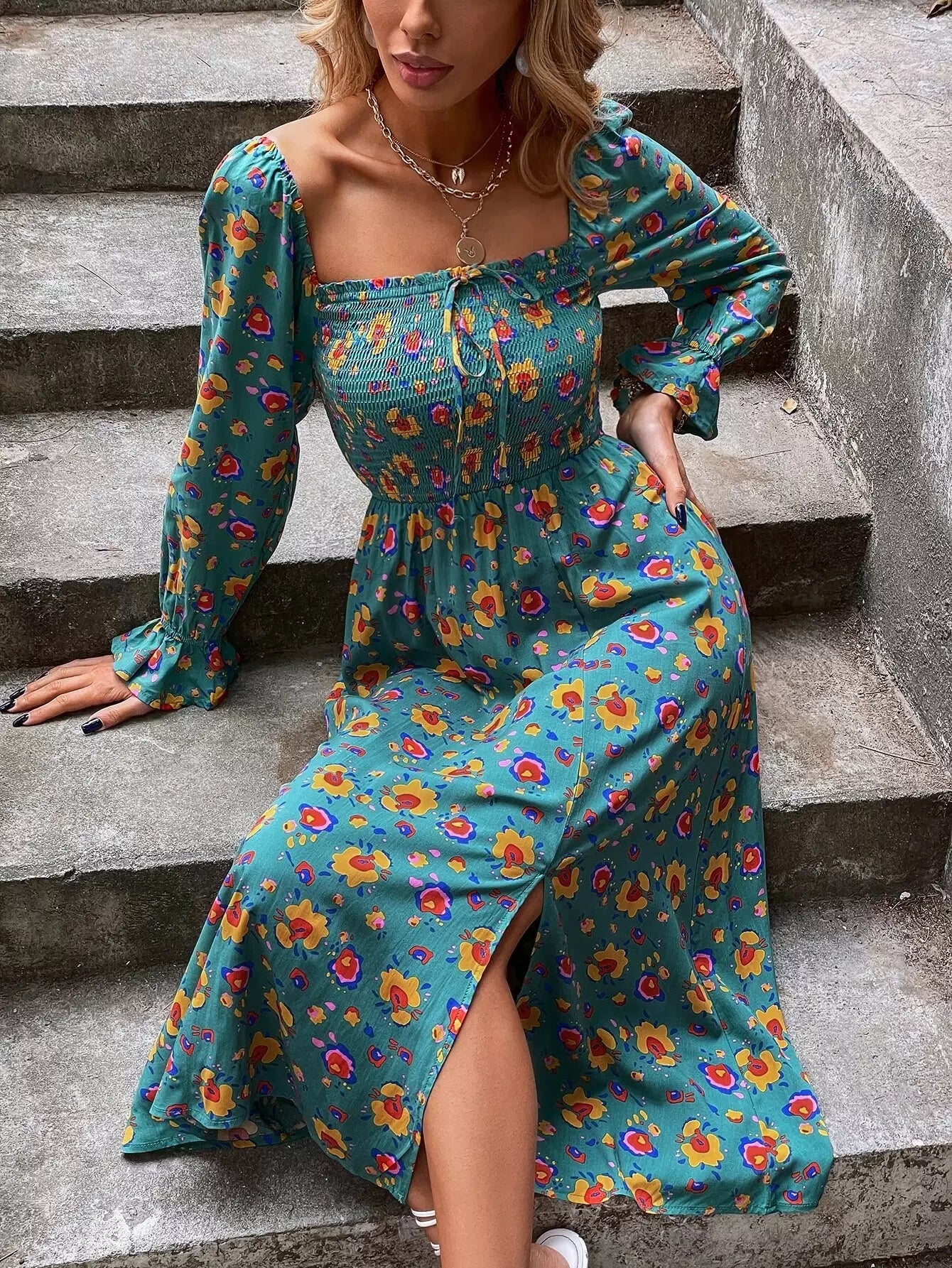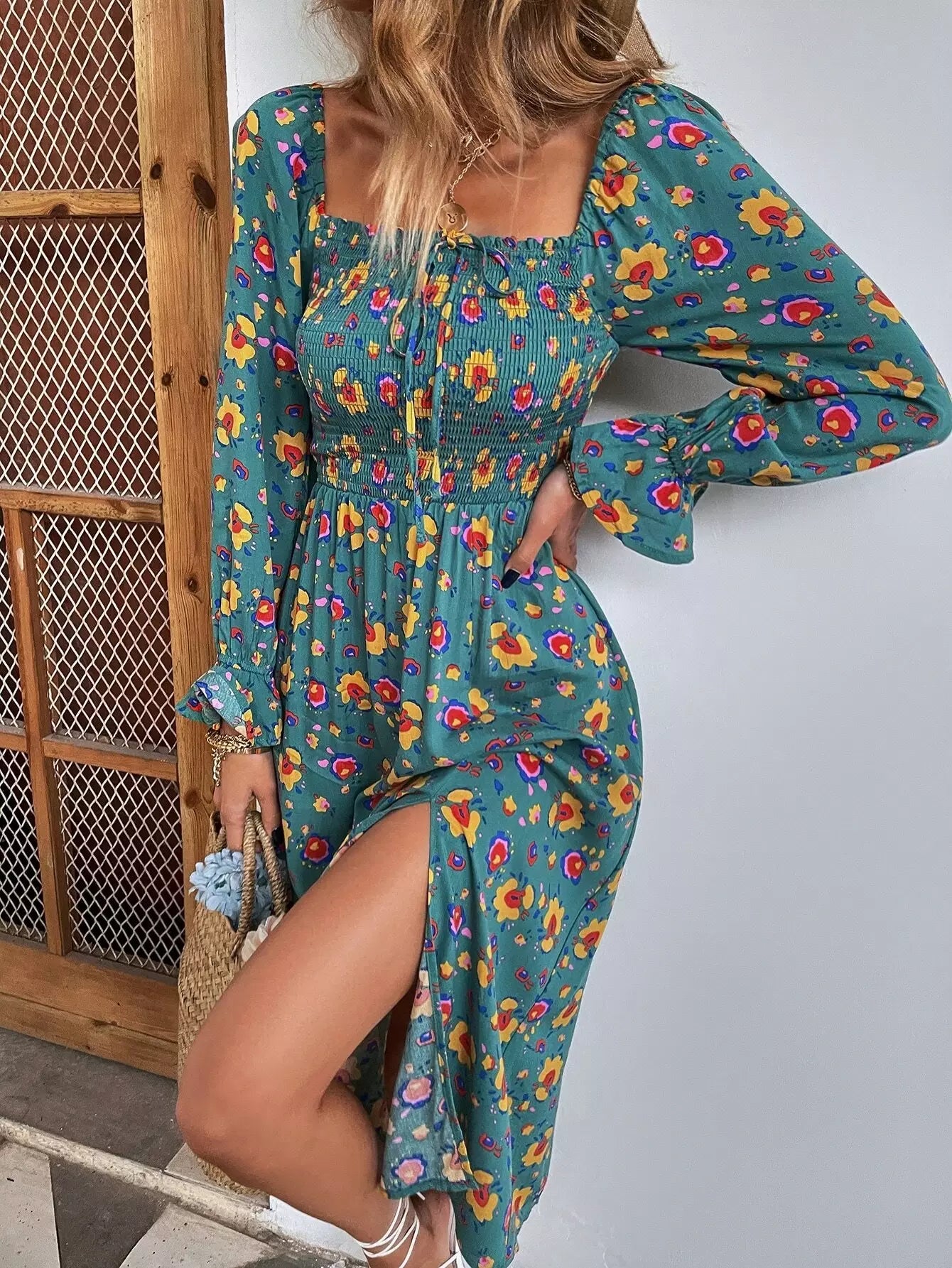 Floral Print Shirred Split A-line Dress