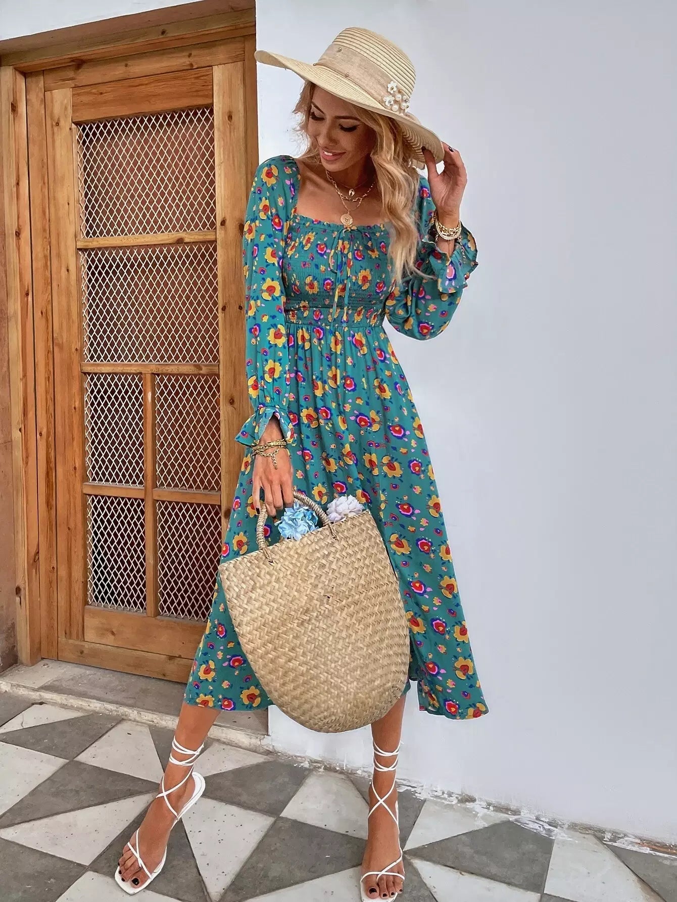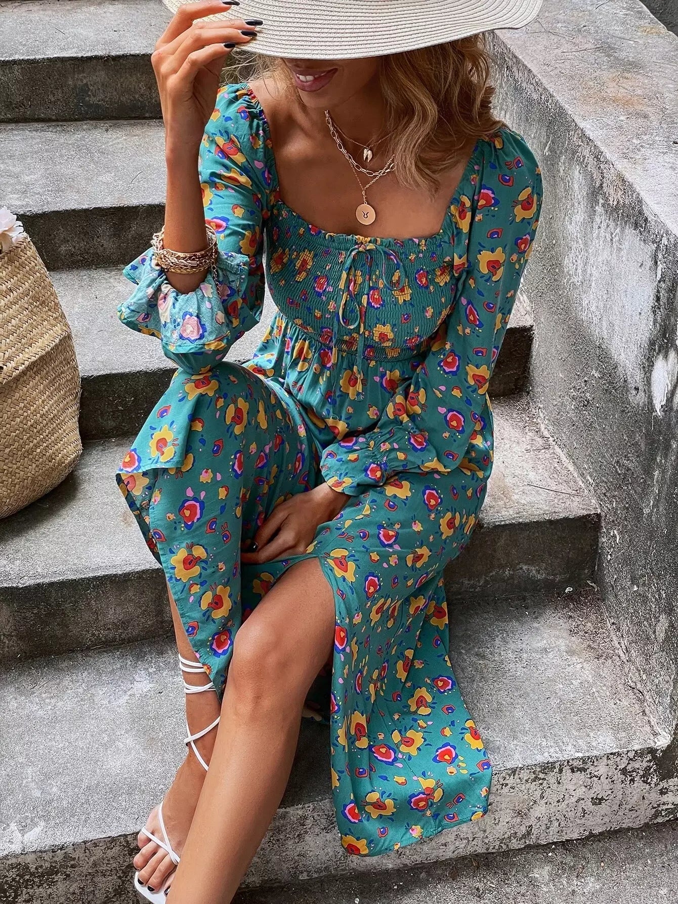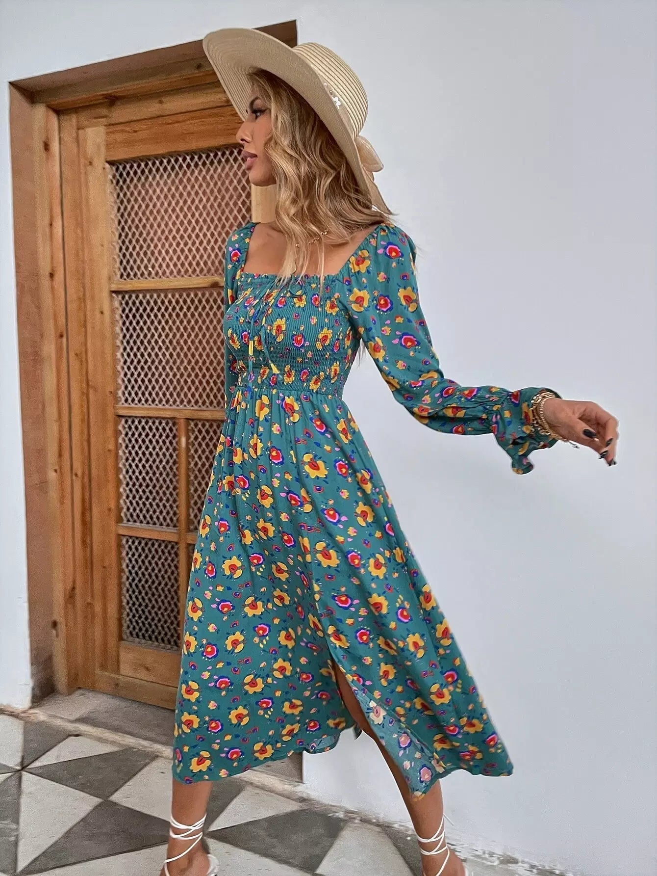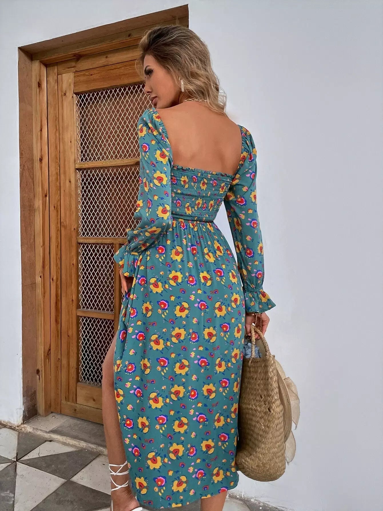 Floral Print Shirred Split A-line Dress