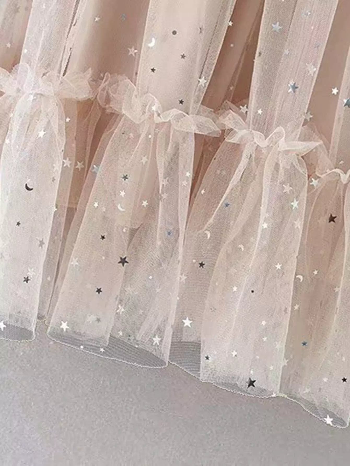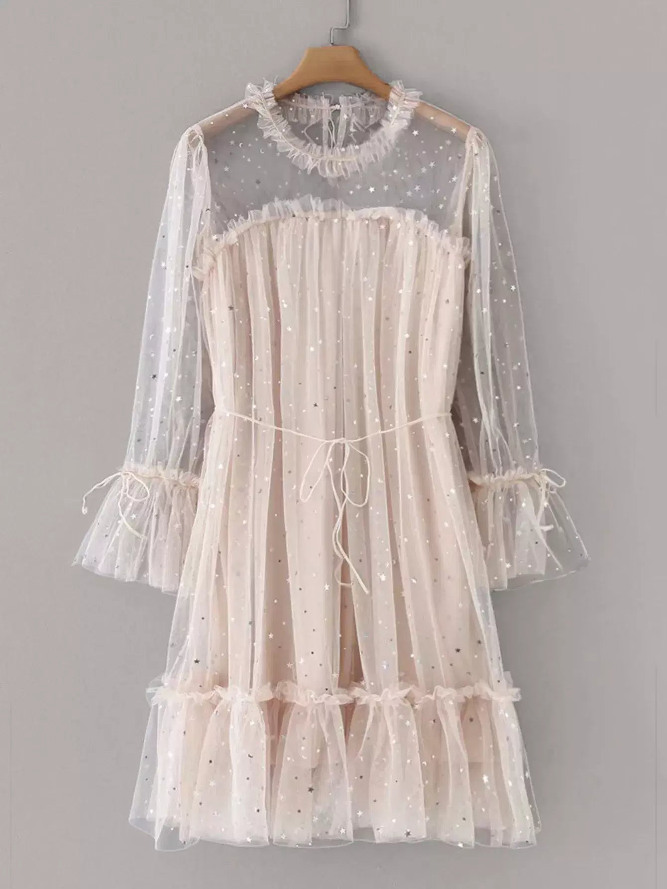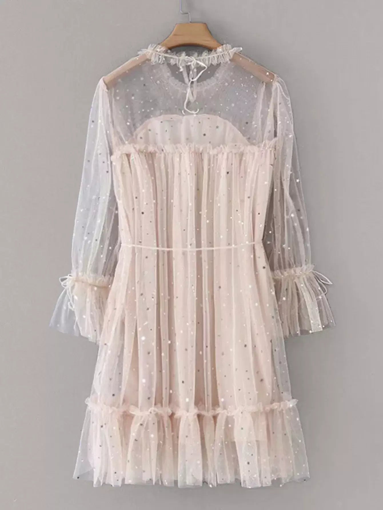 Flounce Sleeve Frill Trim Star Sequin Mesh Dress