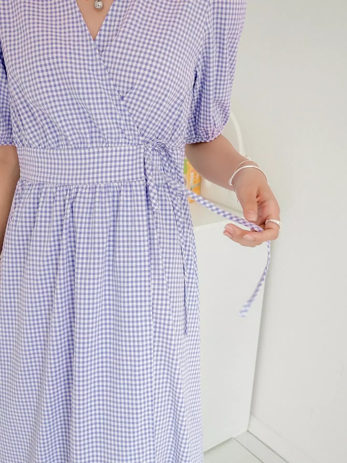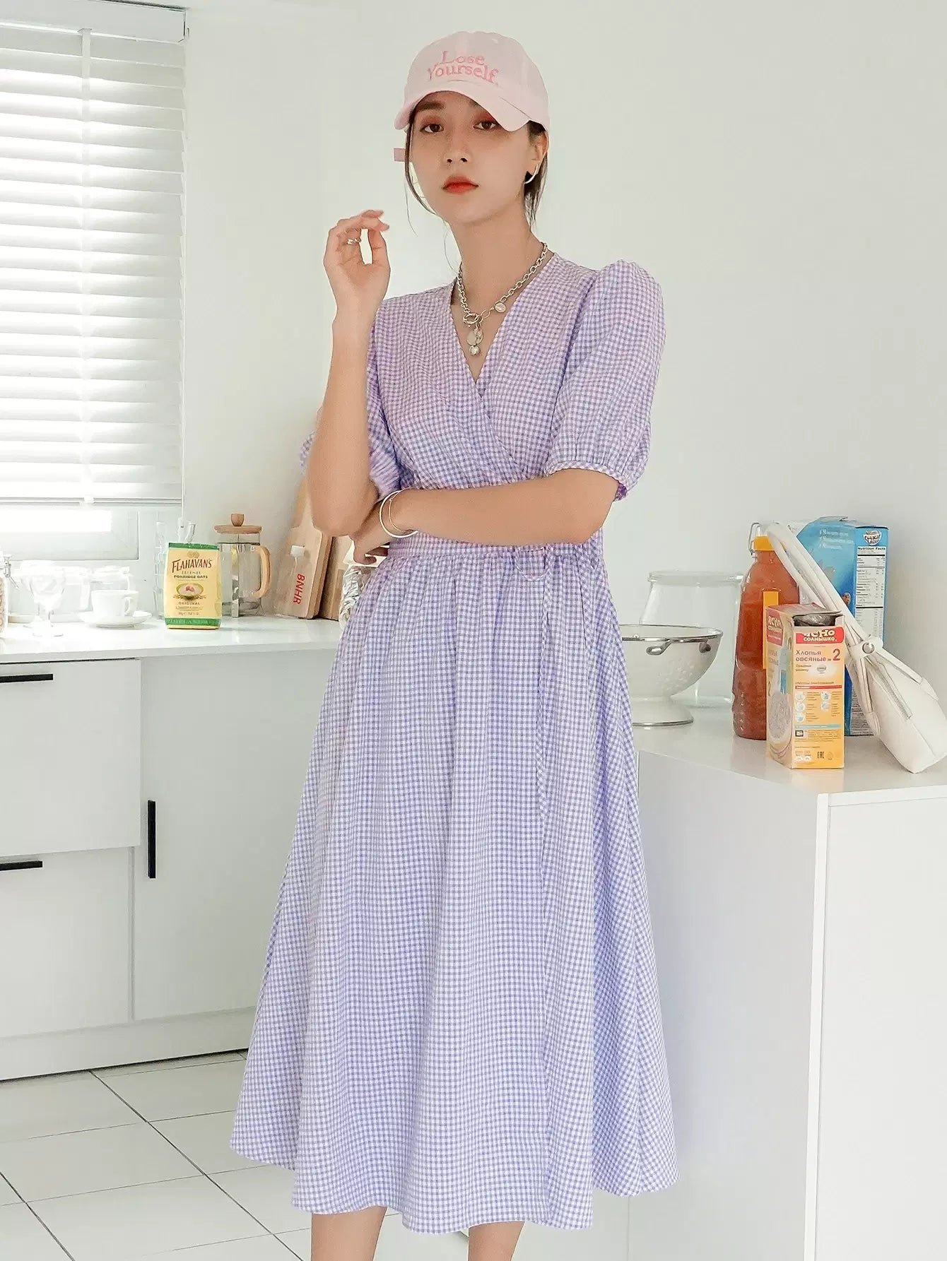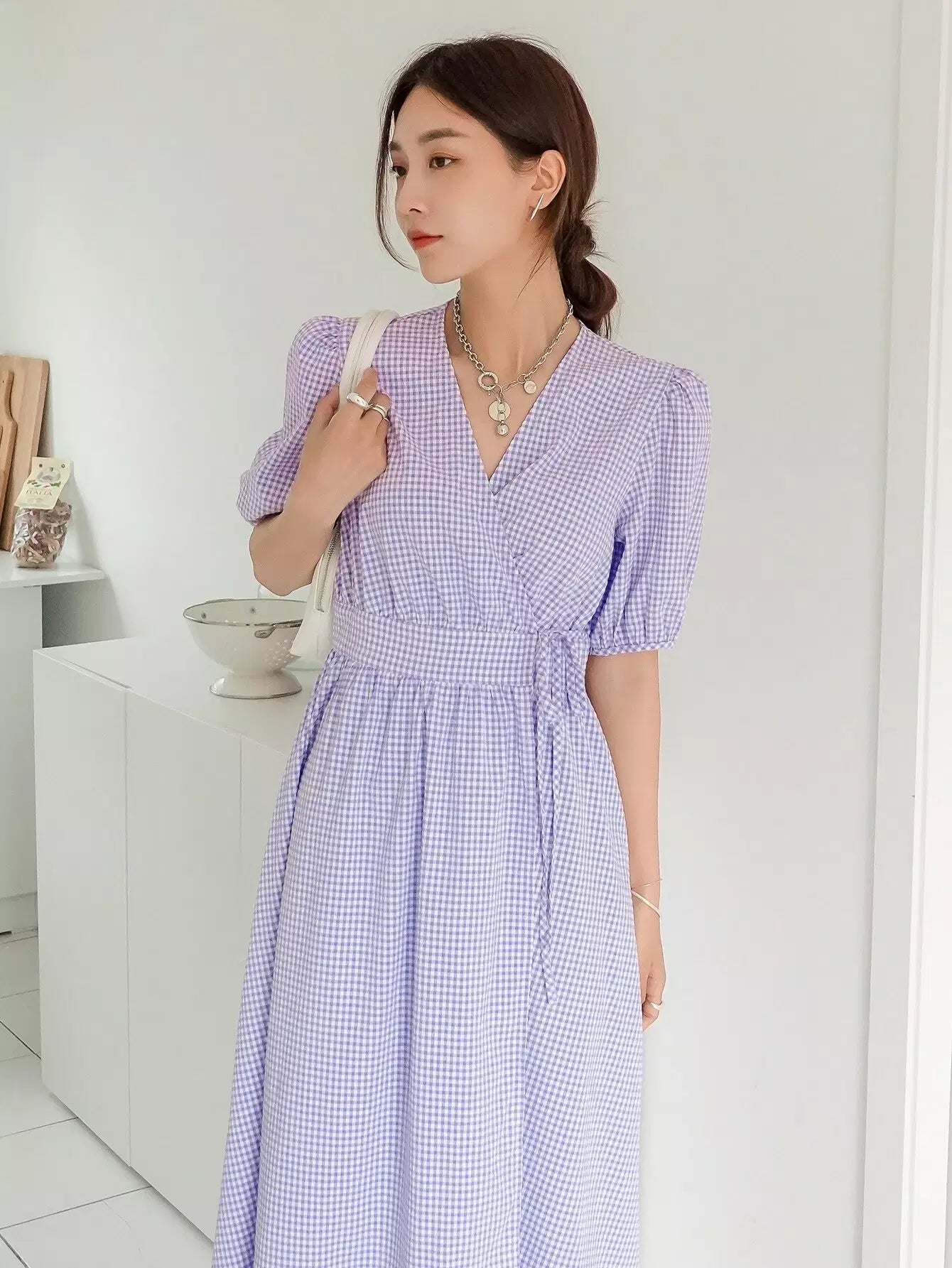 Gingham Print Knot Puff Sleeve Wrap Dress