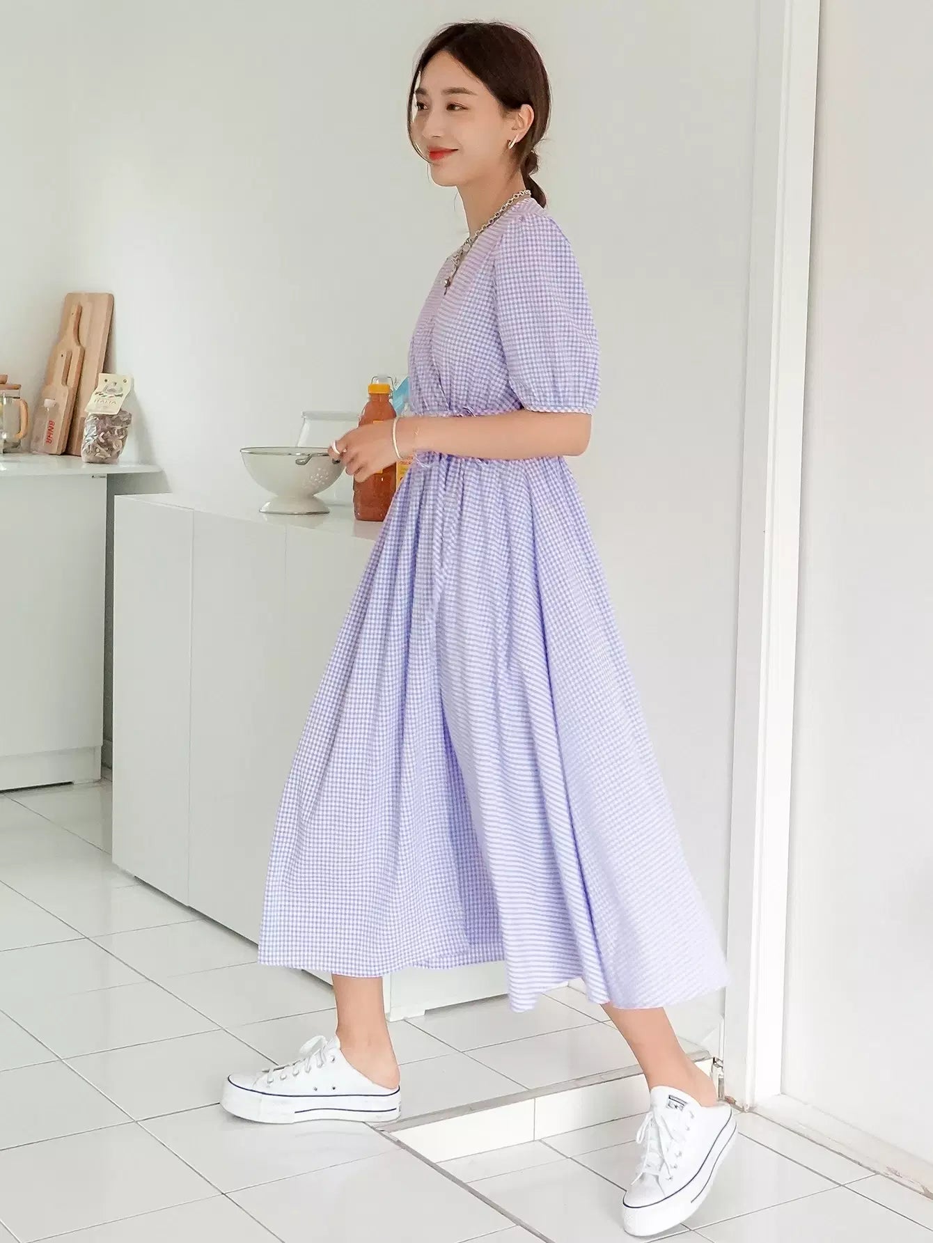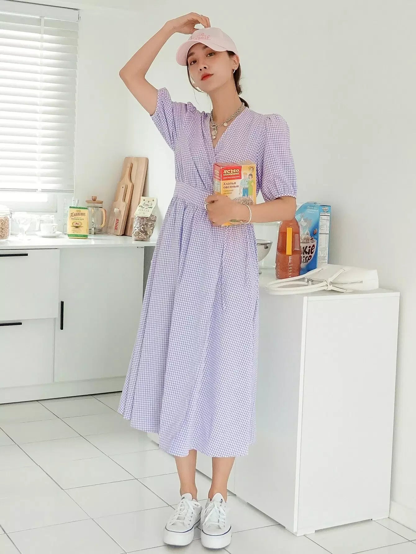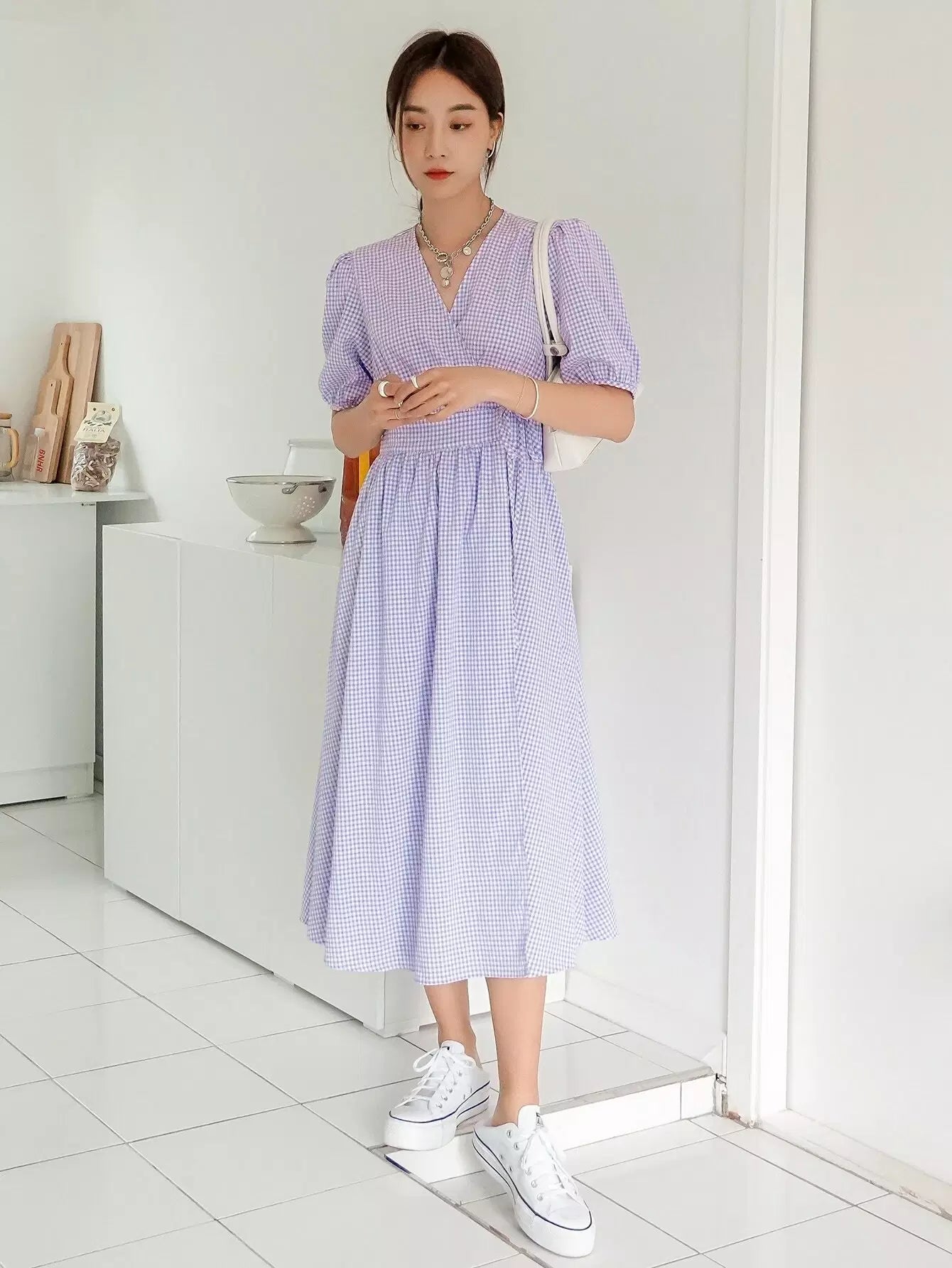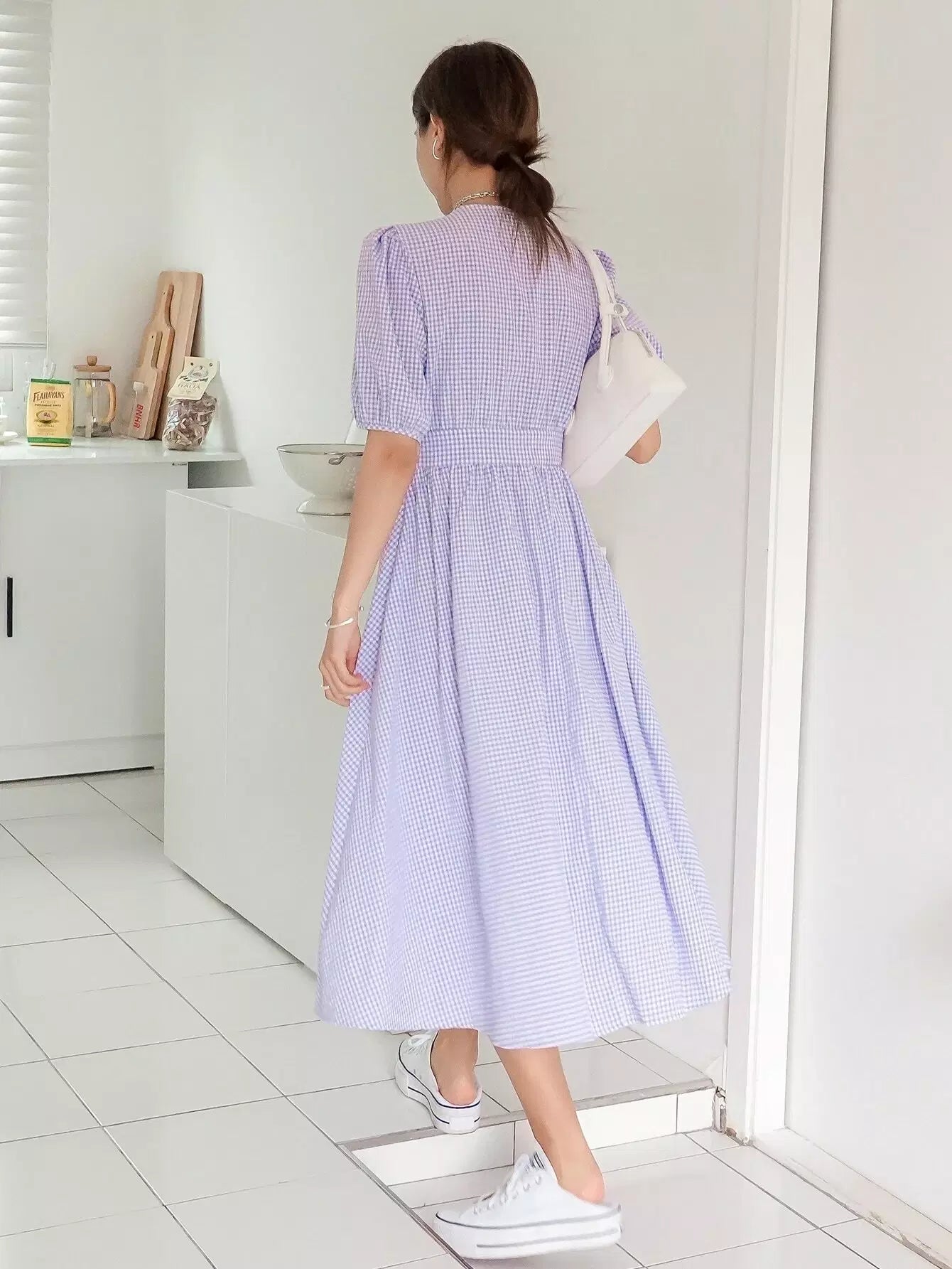 Gingham Print Knot Puff Sleeve Wrap Dress