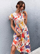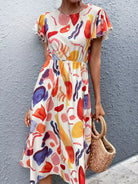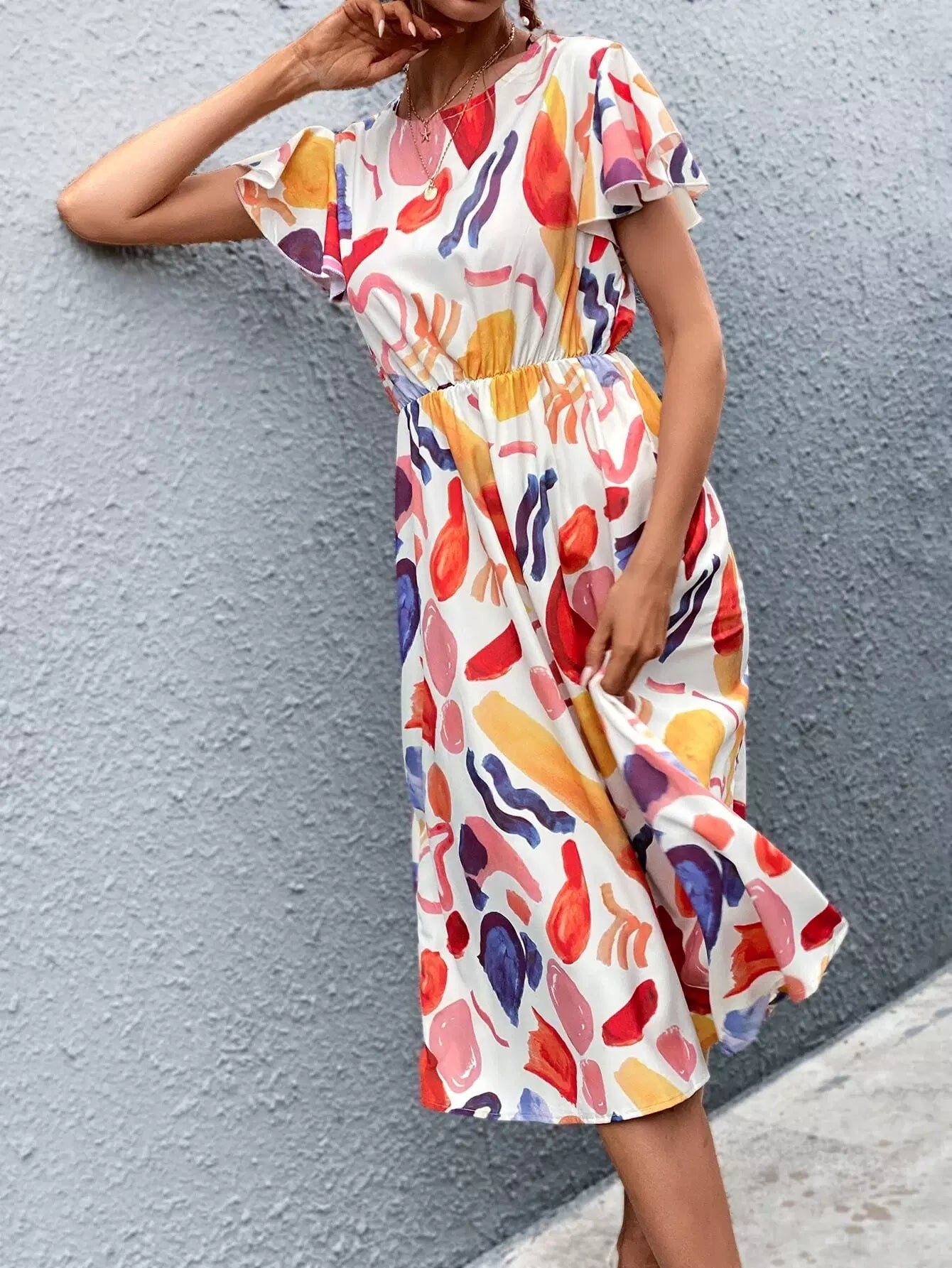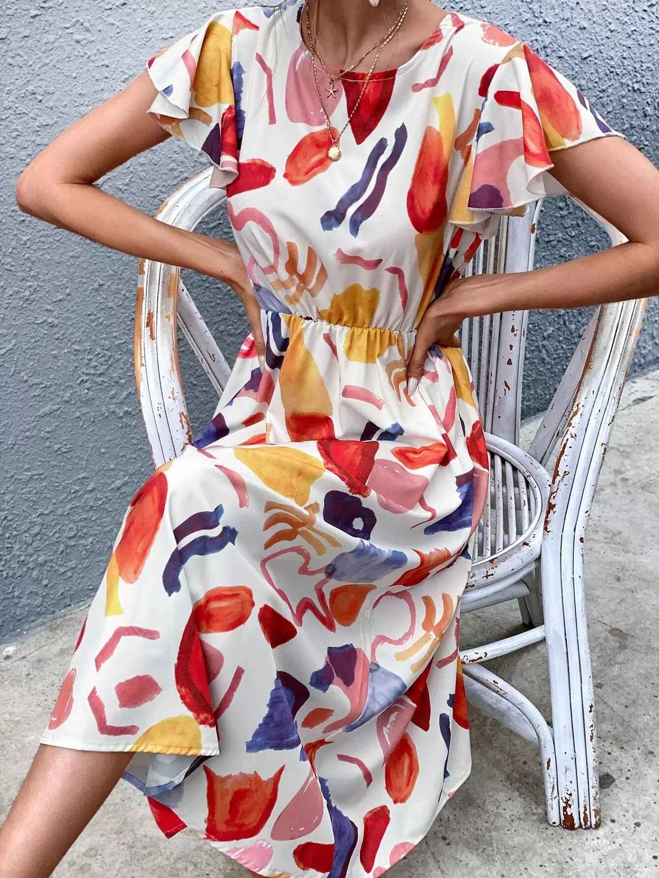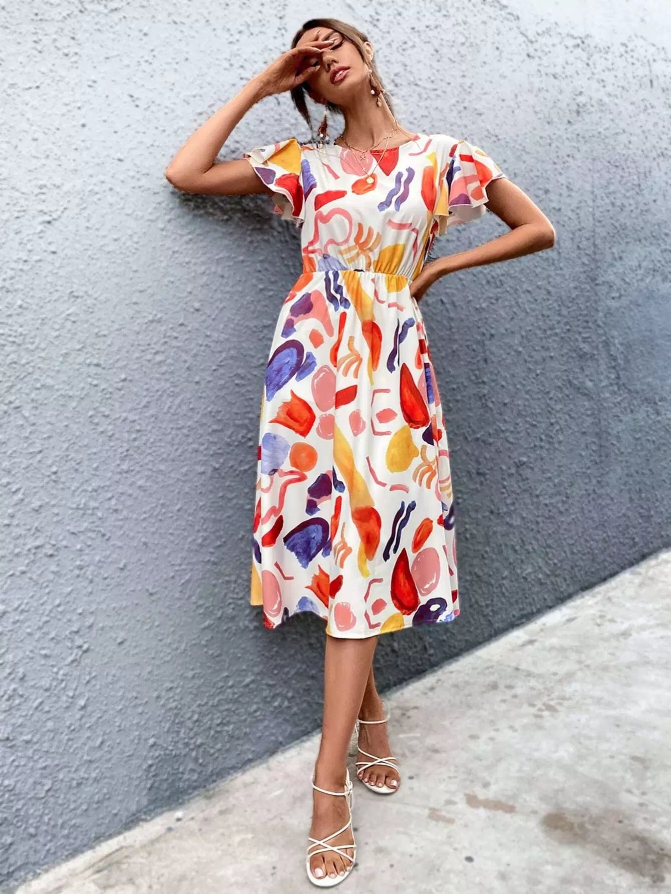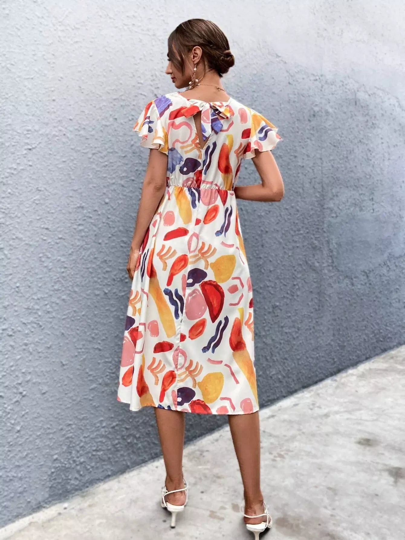 Graphic Print Butterfly Sleeve Tie Back Dress