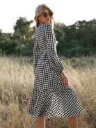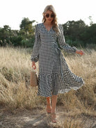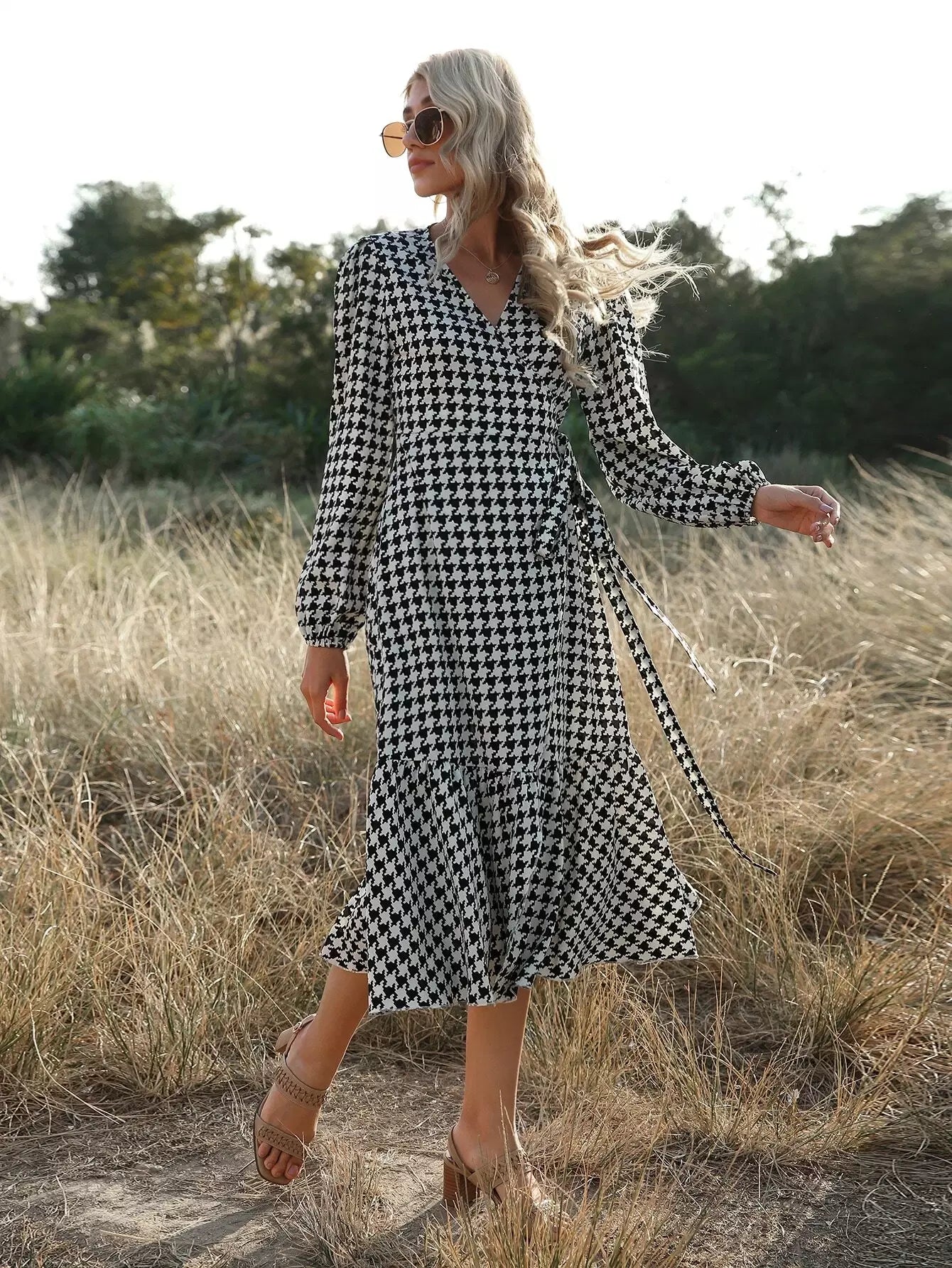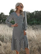 Women - Houndstooth Ruffle Hem Belted Wrap Dress