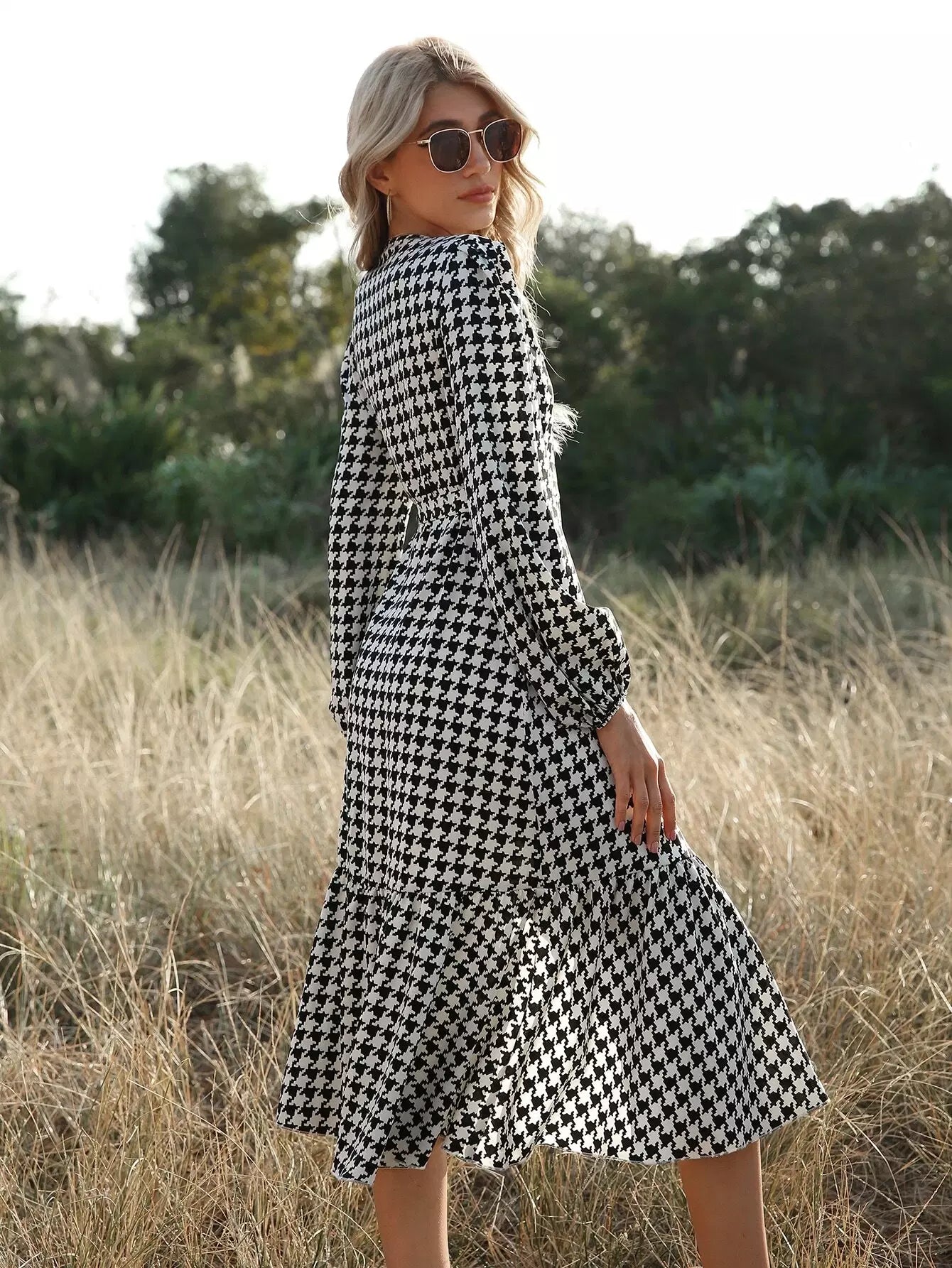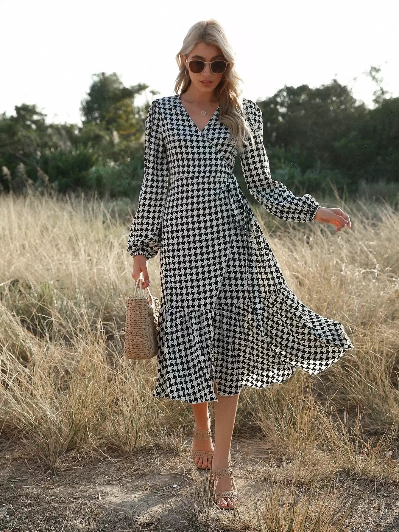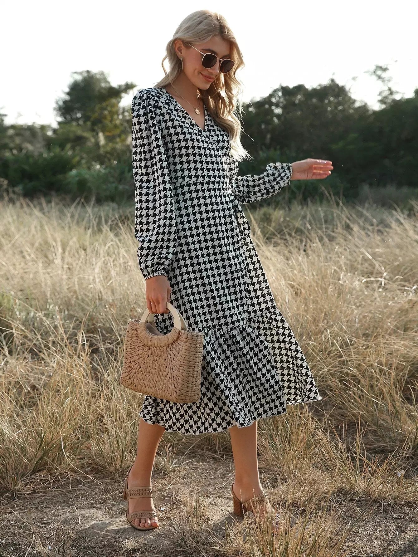 Houndstooth Ruffle Hem Wrap Dress Without Belt