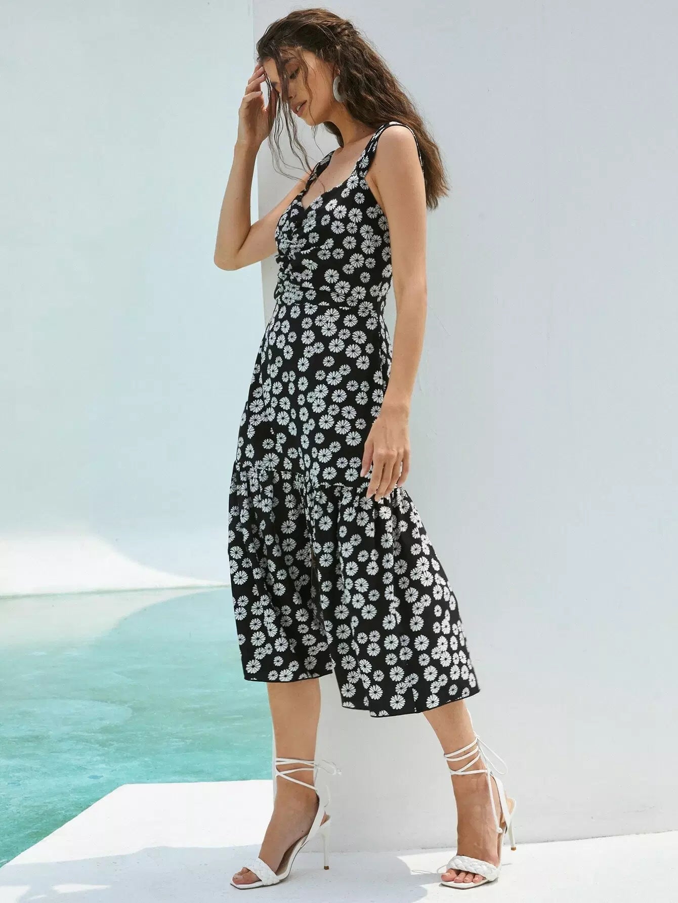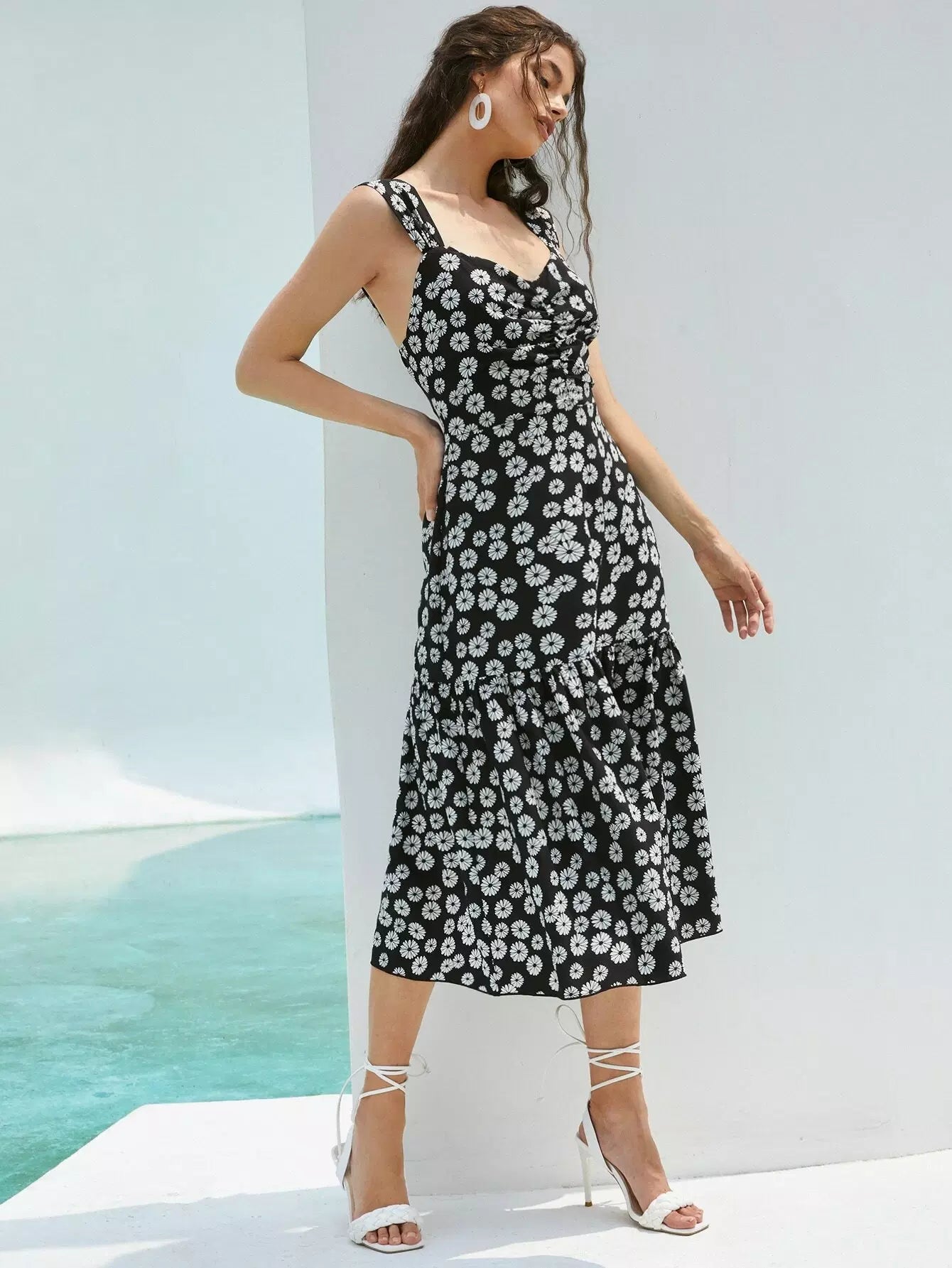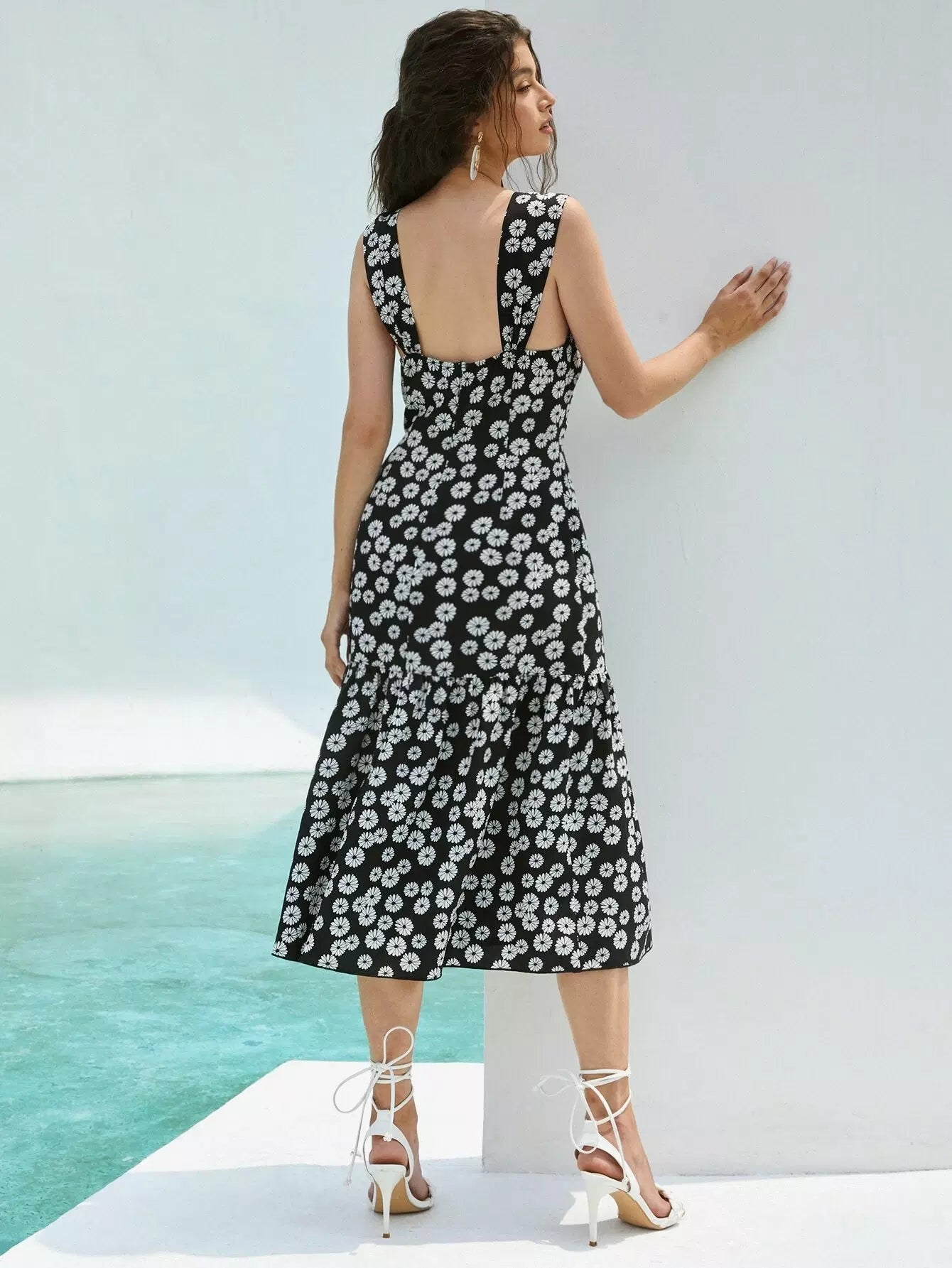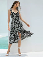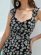 Low Back Ruched Slit Ruffle Hem Floral Dress