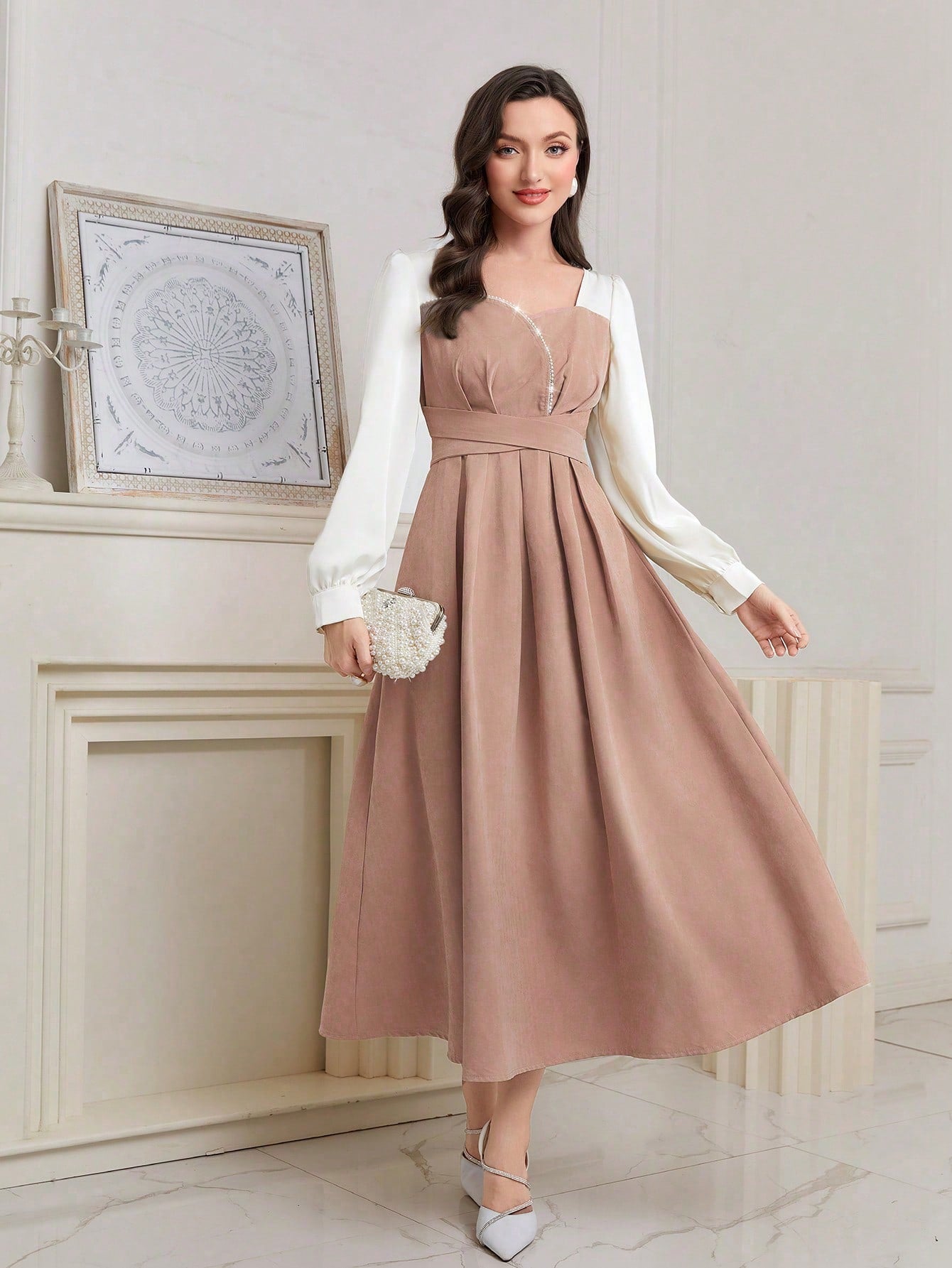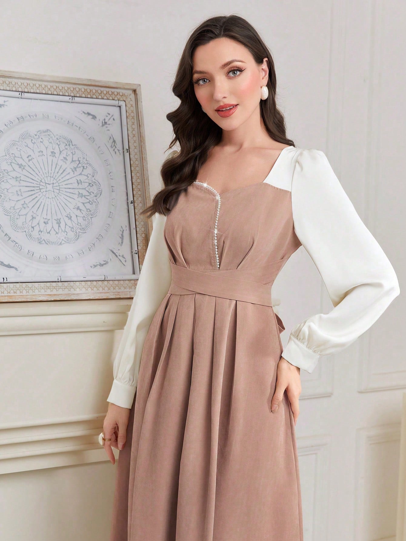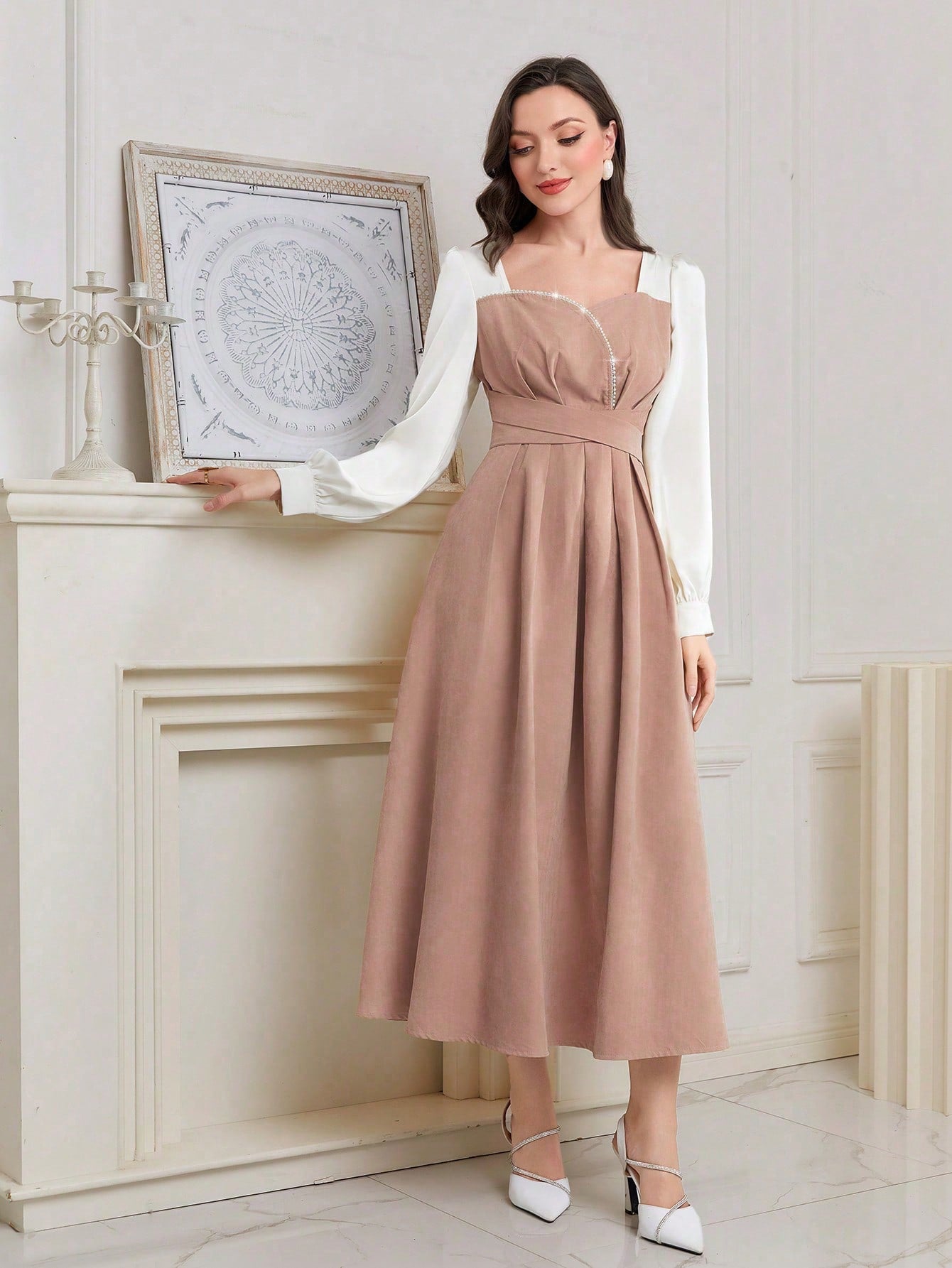 Modelyn Women's Square Neckline Dress With Faux Pearl Detail Maxi Women Outfit Long Evening Dresses