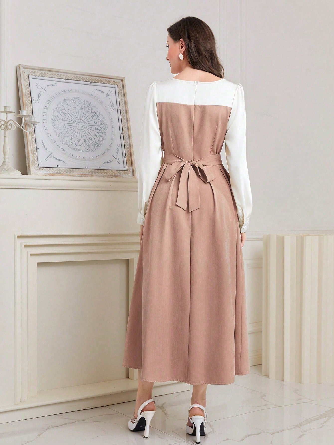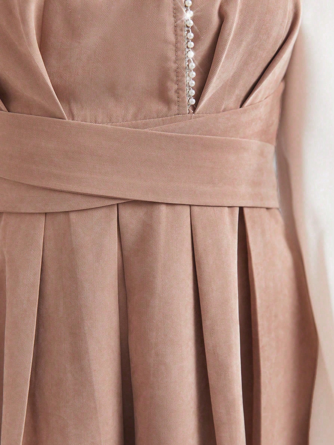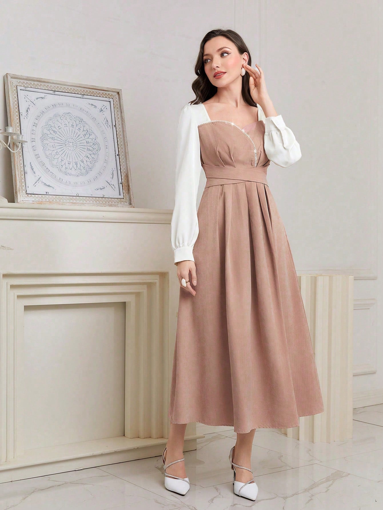 Modelyn Women's Square Neckline Dress With Faux Pearl Detail Maxi Women Outfit Long Evening Dresses