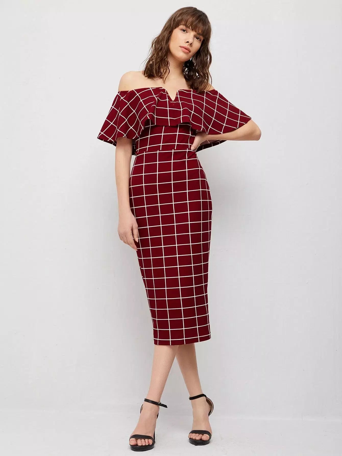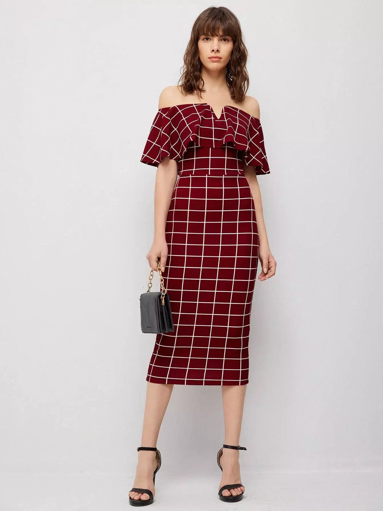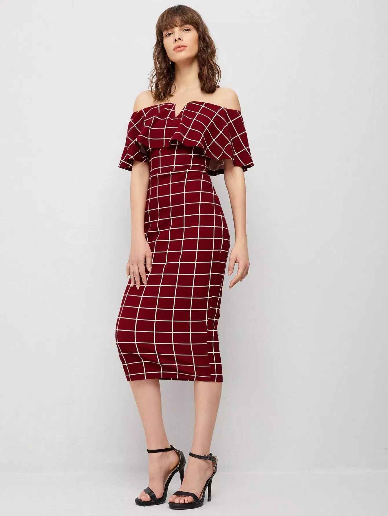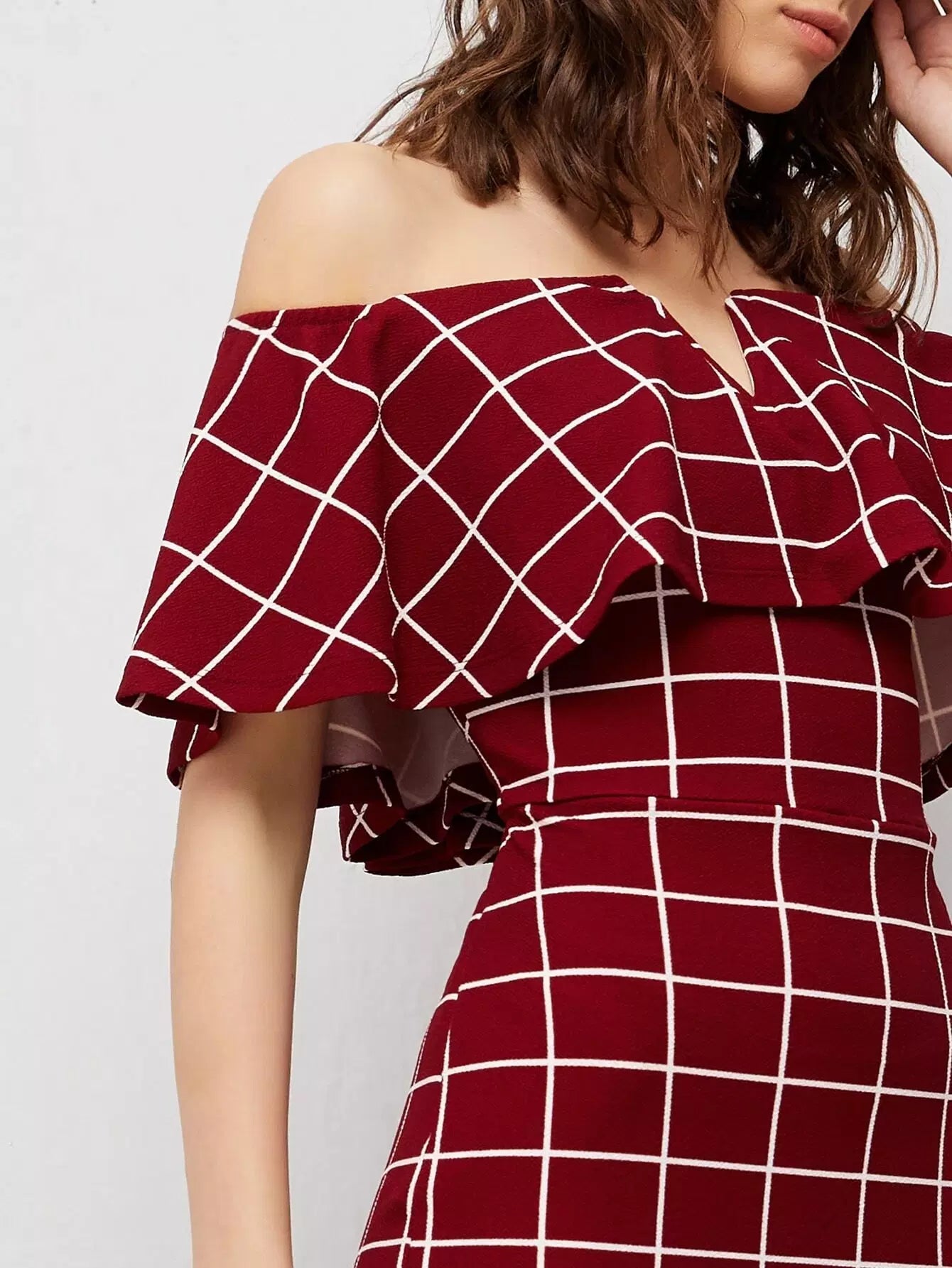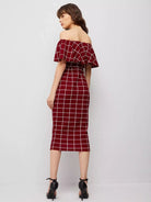 Off Shoulder Foldover Grid Dress