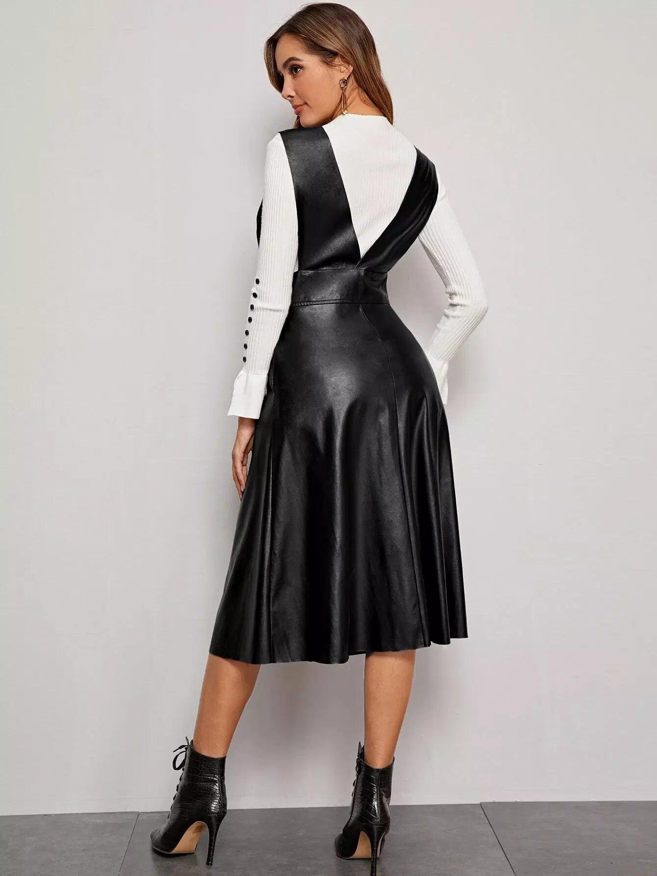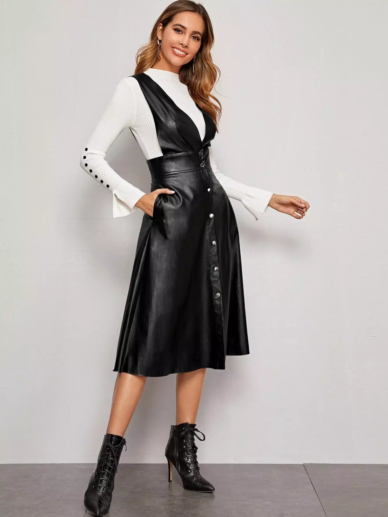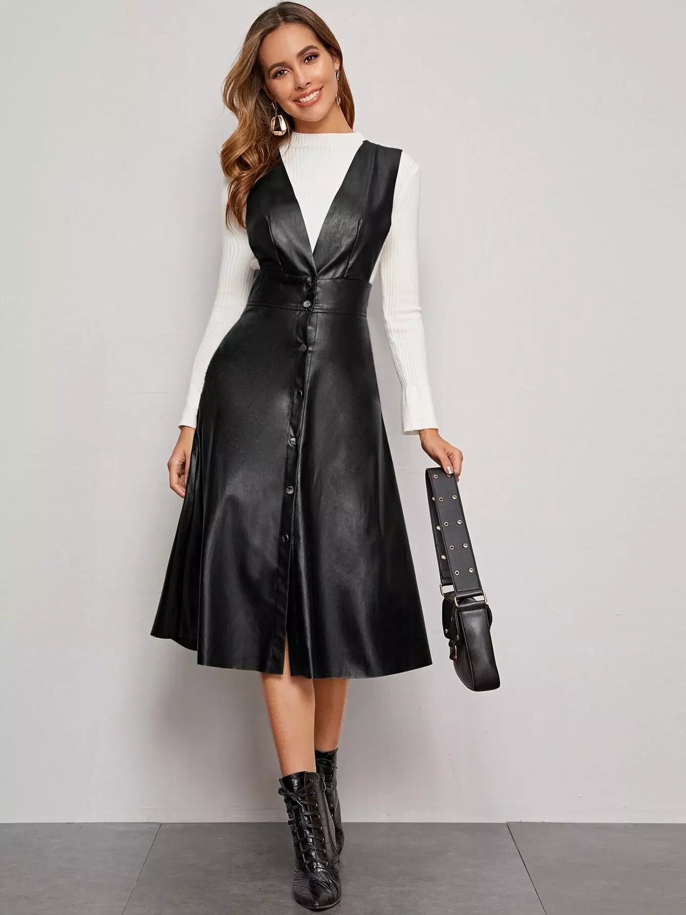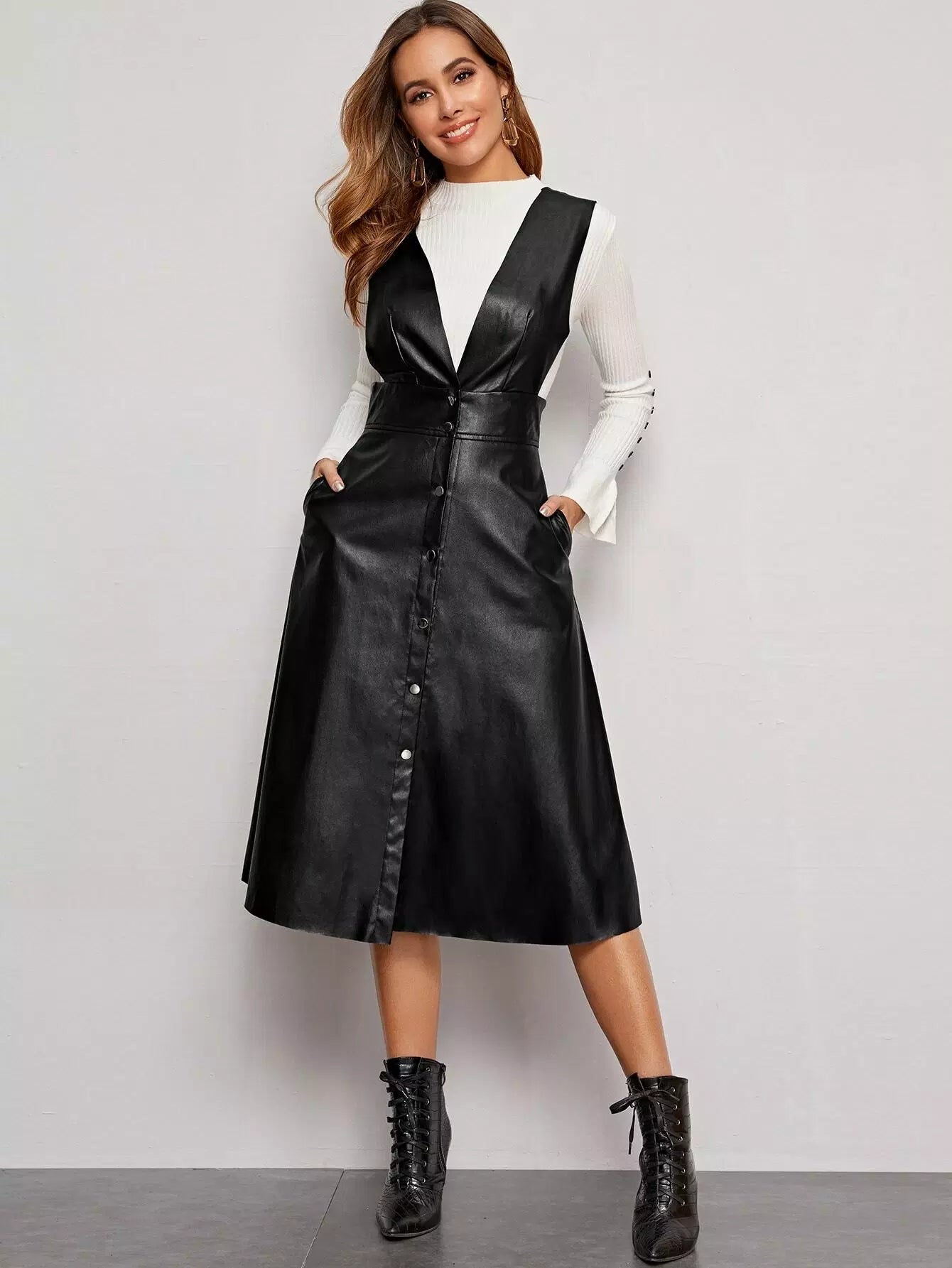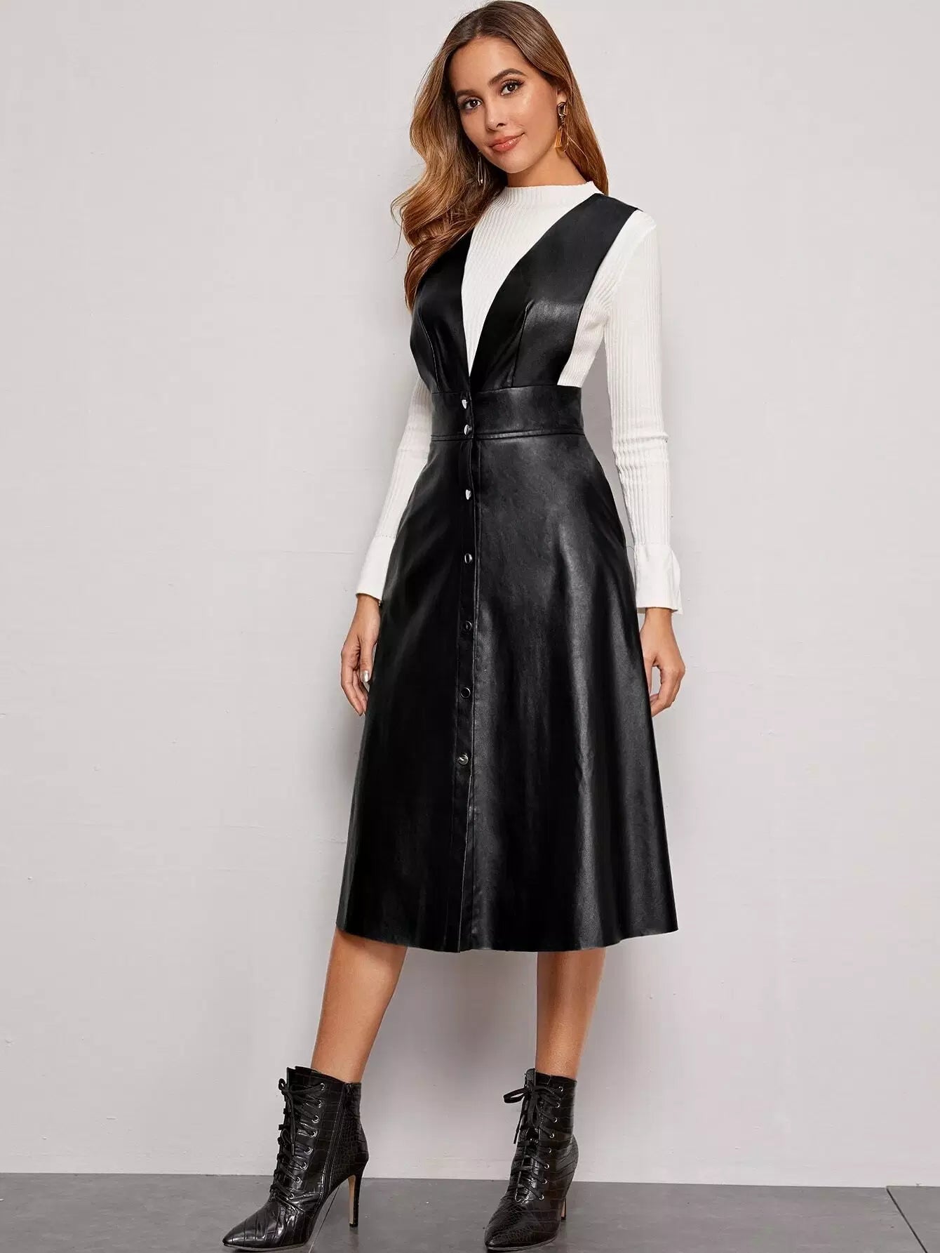 Plunging Neck Button Front PU Overall Dress