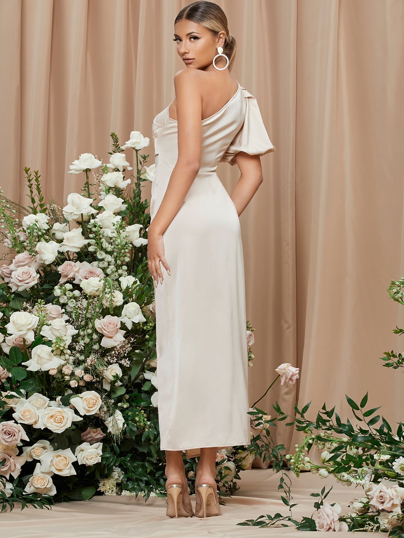 Solid One Shoulder Lantern Sleeve Split Thigh Dress