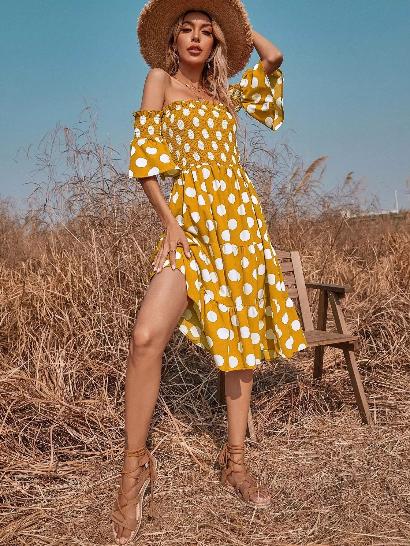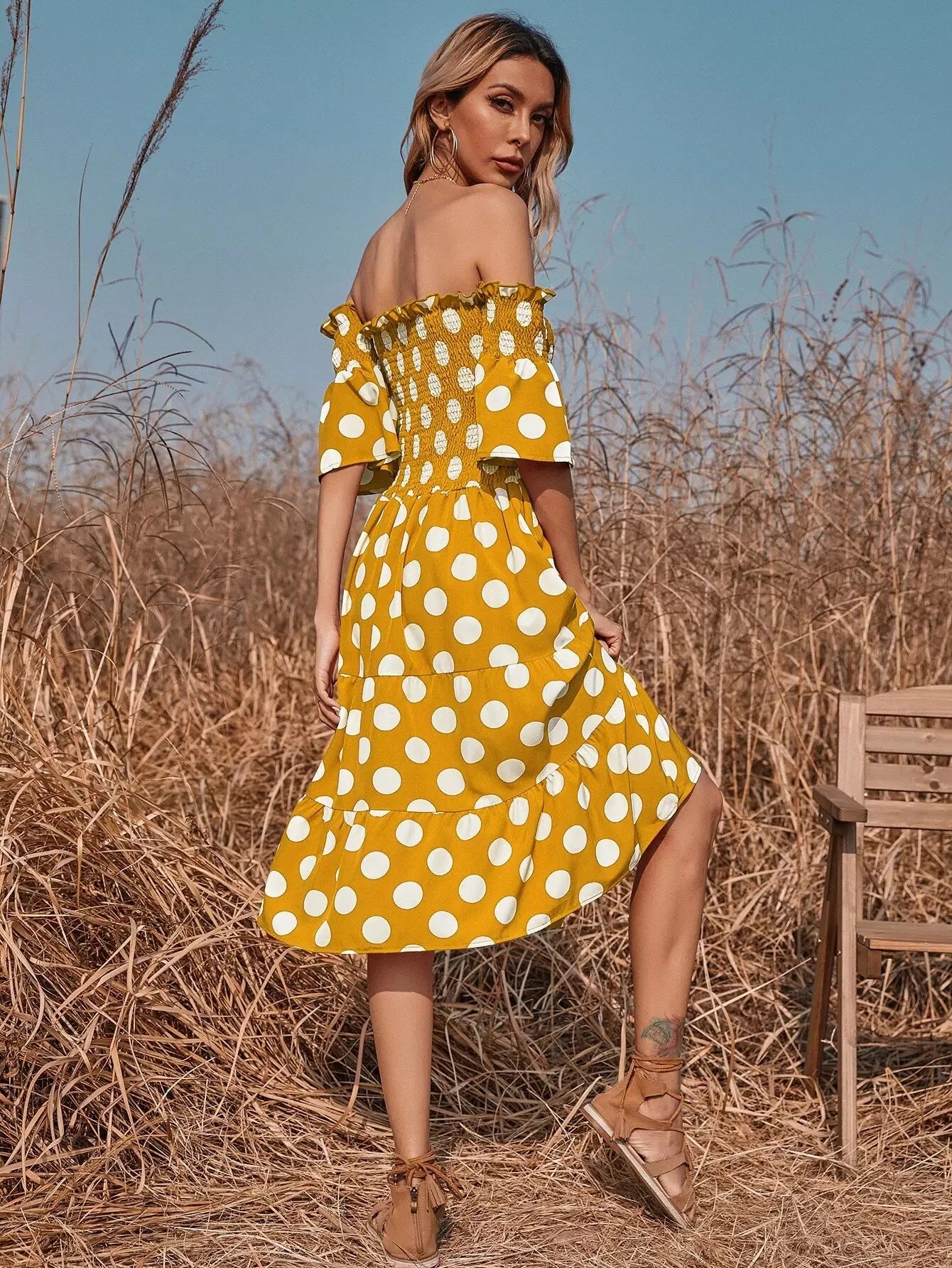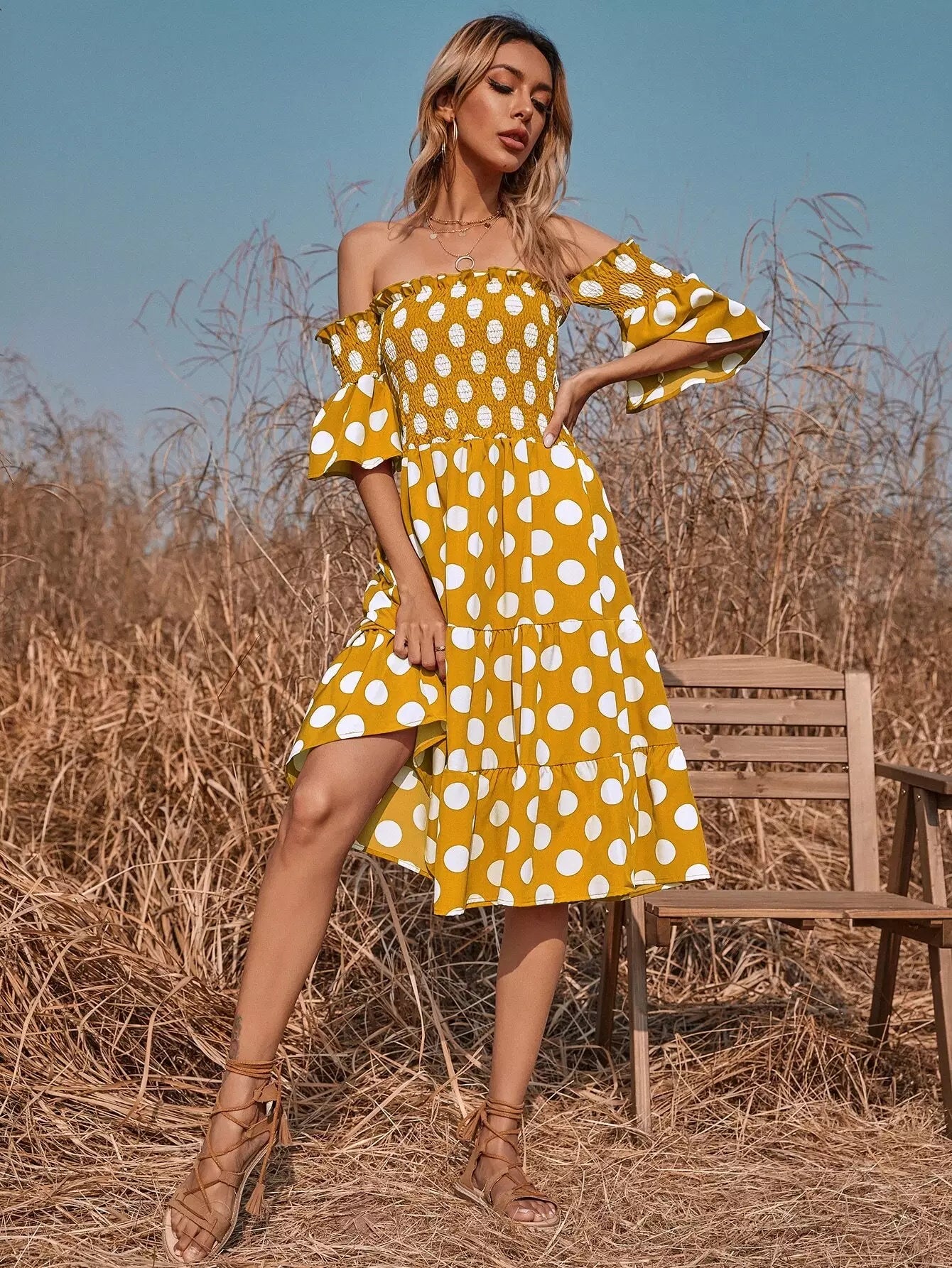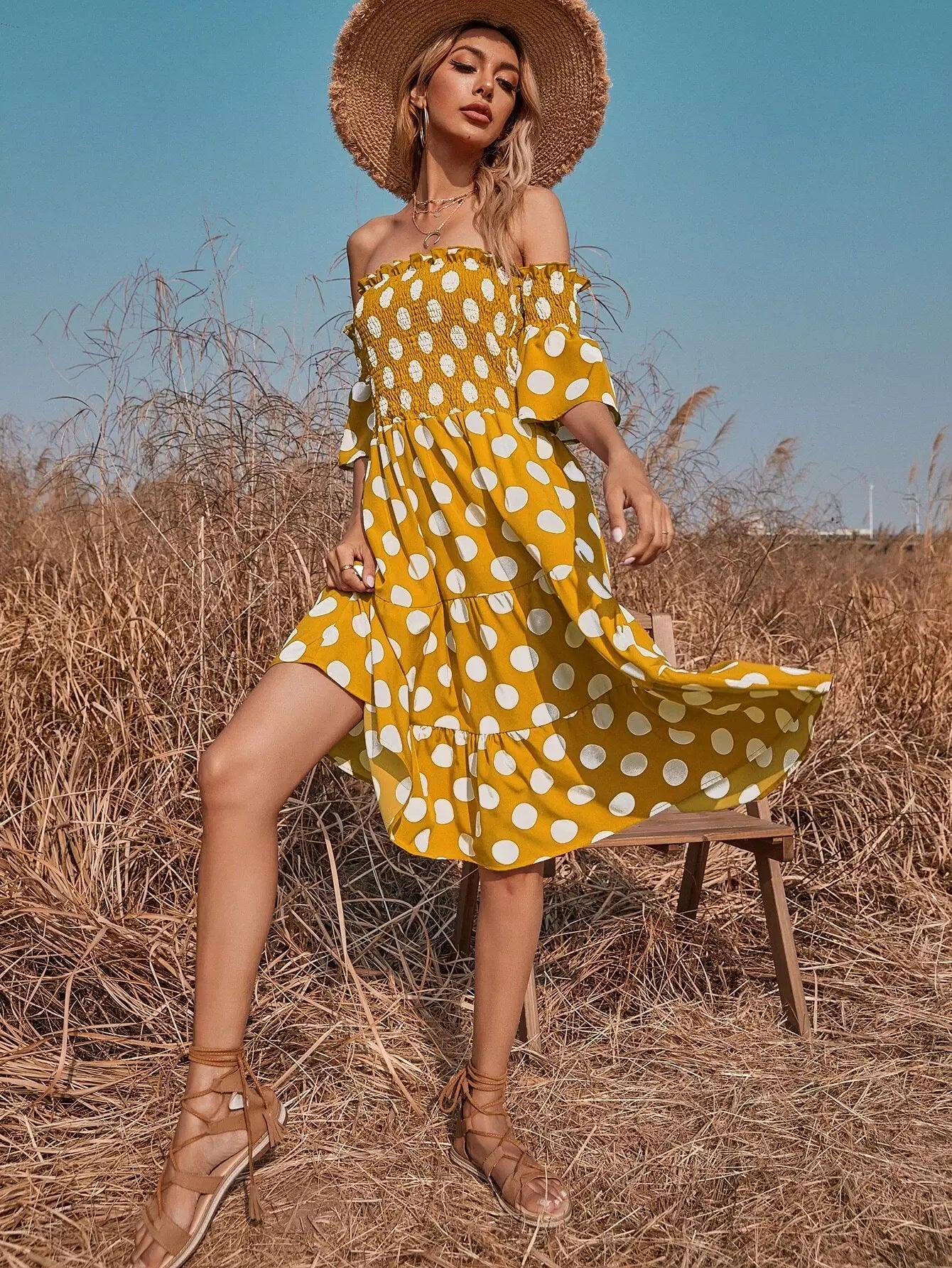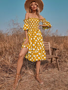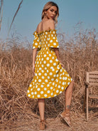 Polka Dot Shirred Bardot A-line Dress