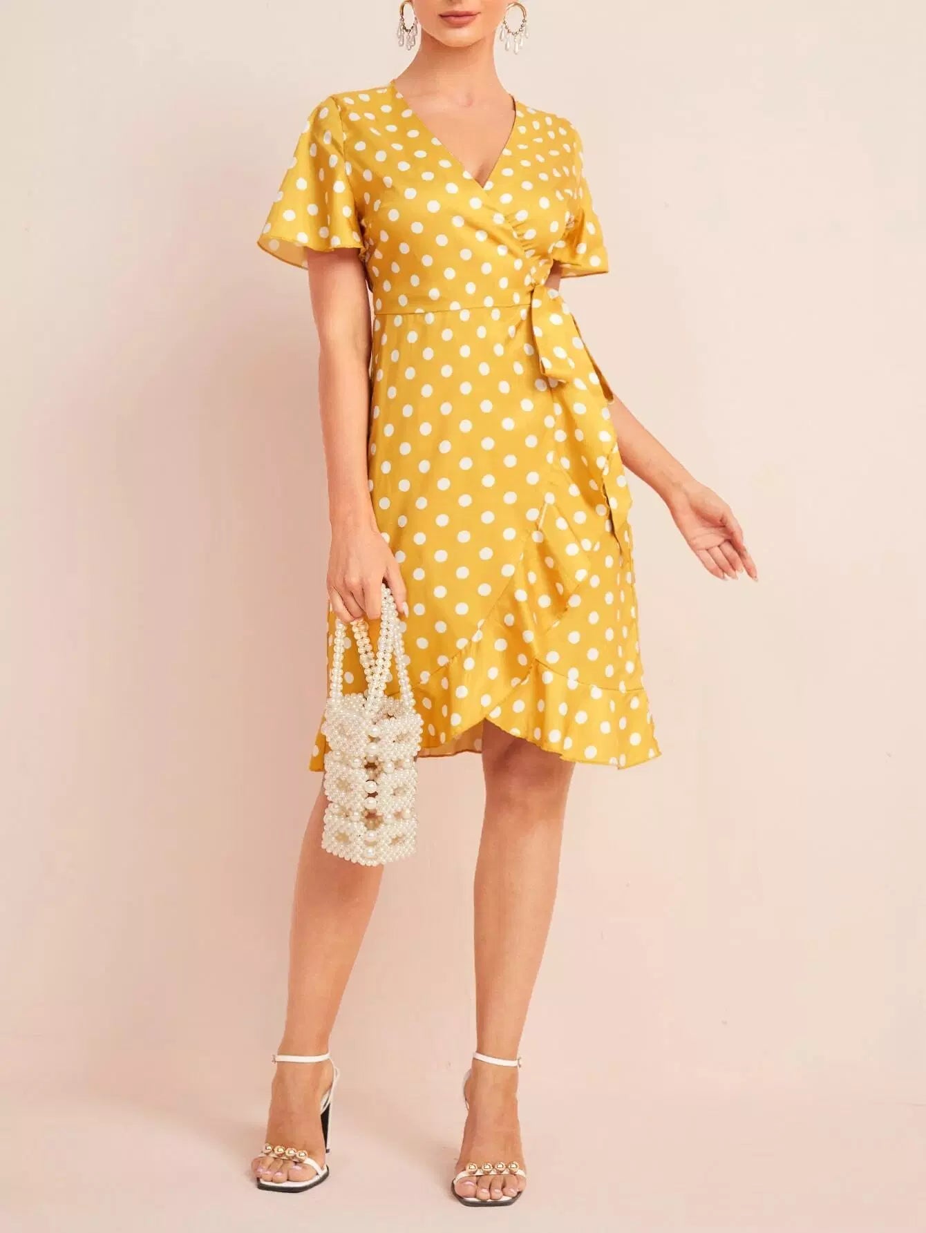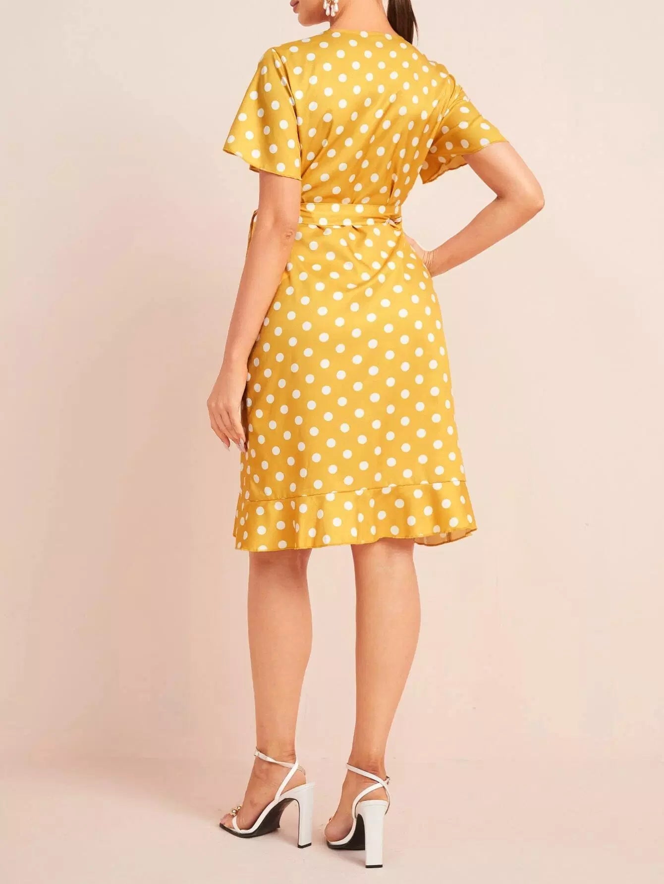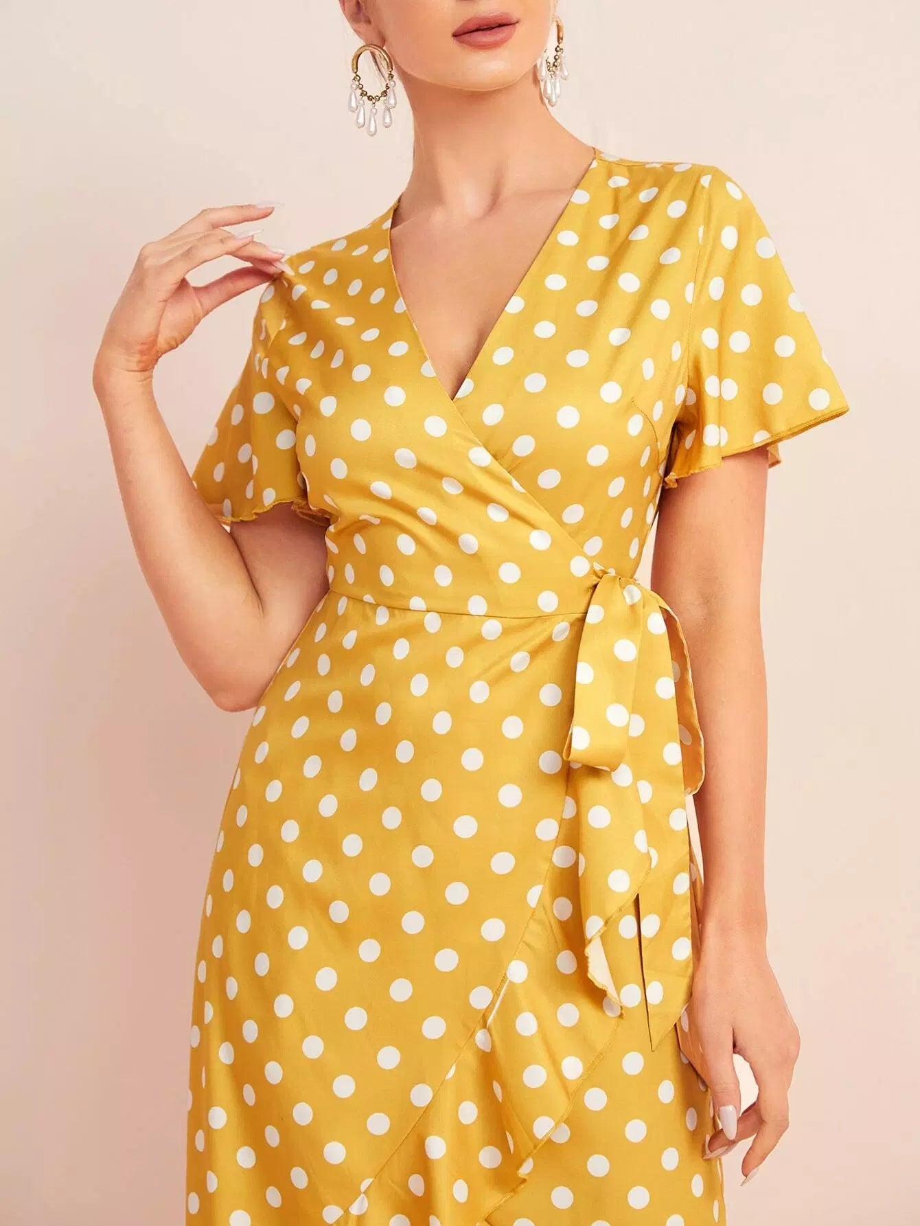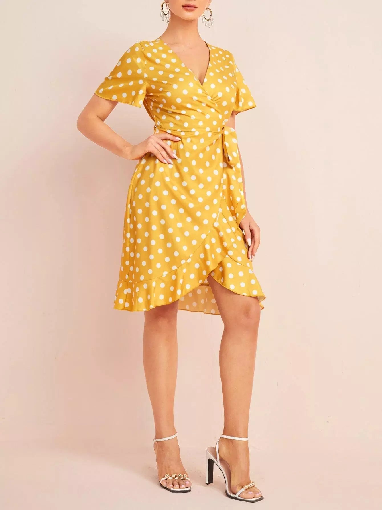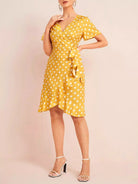 Polka Dot Tie Side Ruffle Wrap Dress