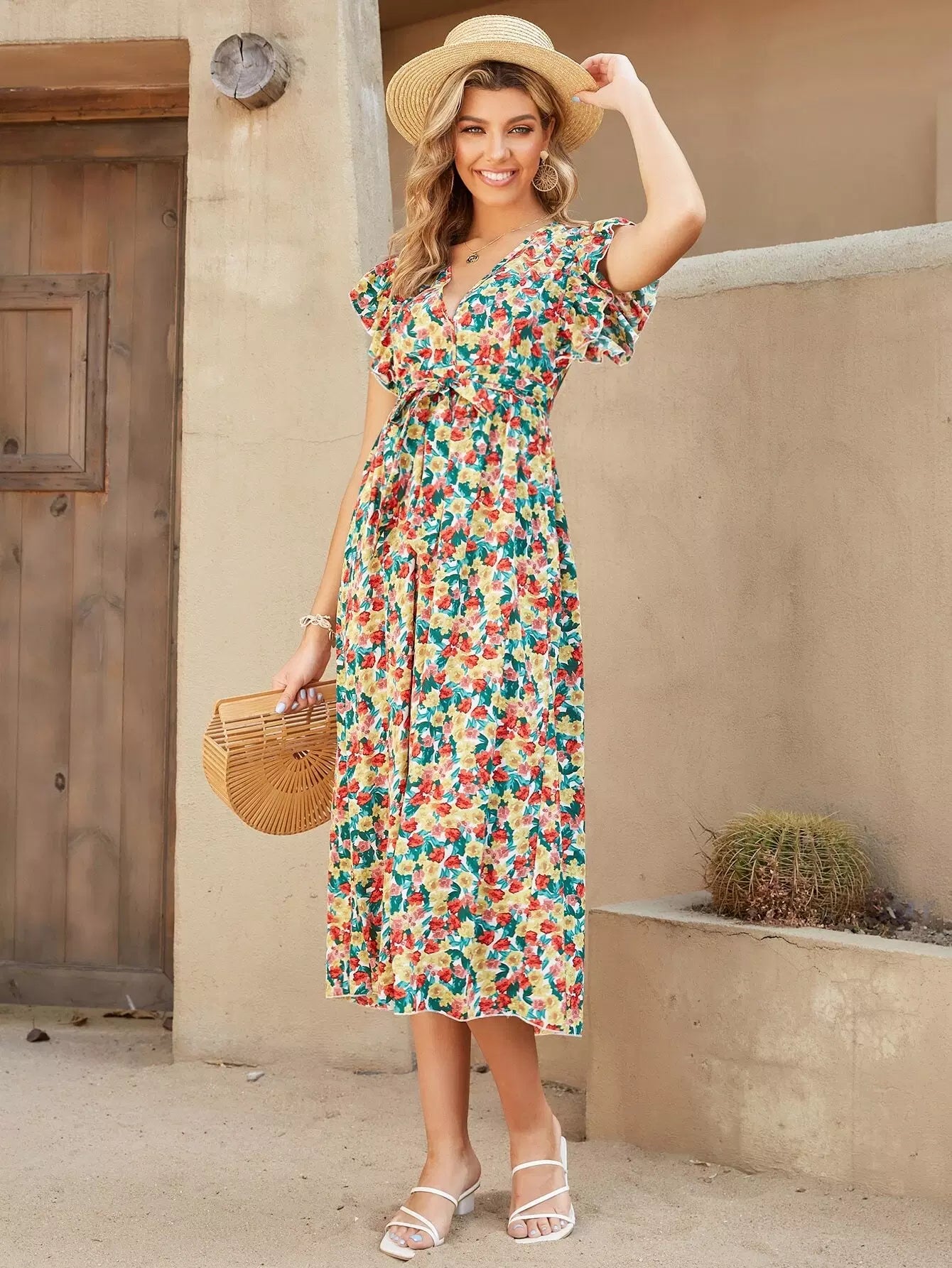 Ruffle Trim Floral Print Dress Without Belt