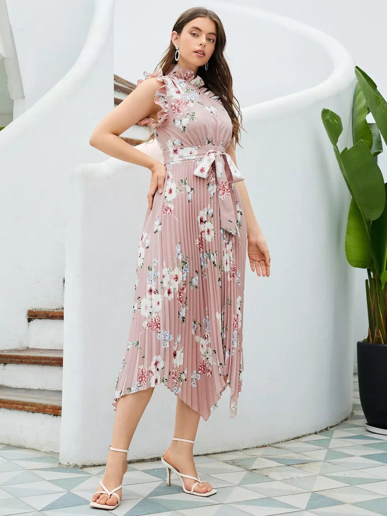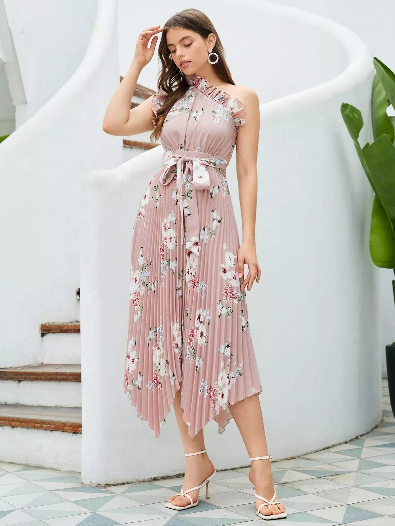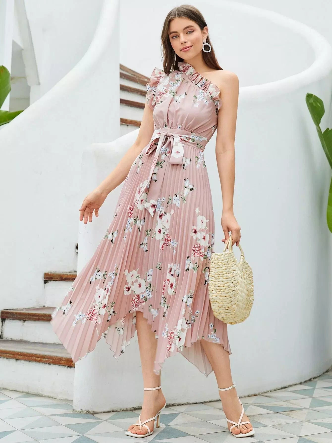 Ruffle Trim One Shoulder Pleated Hanky Hem Floral Dress Without Belt
