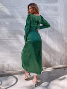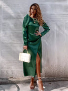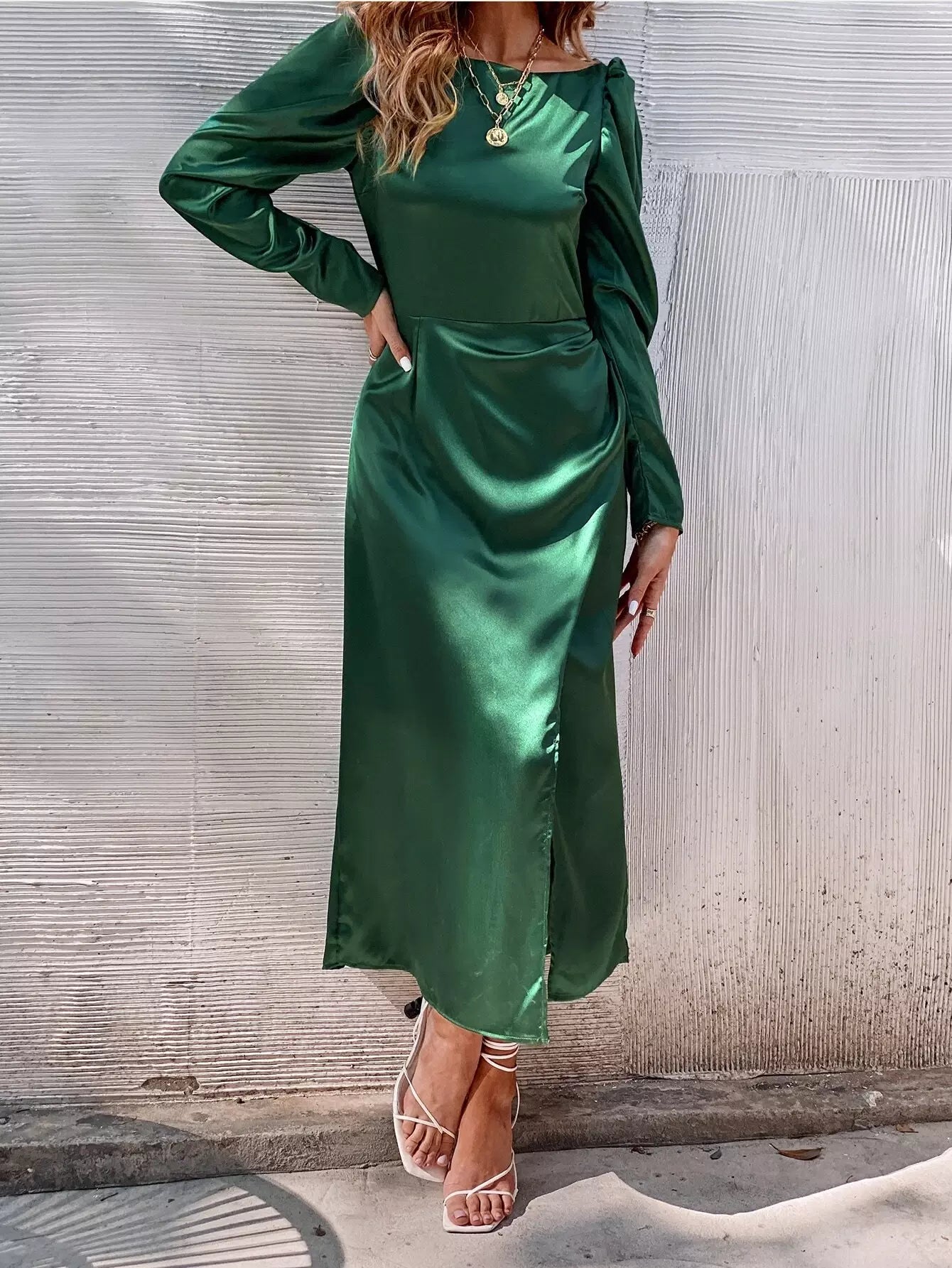 Satin Boat Neck Puff Sleeve Wrap Hem Dress