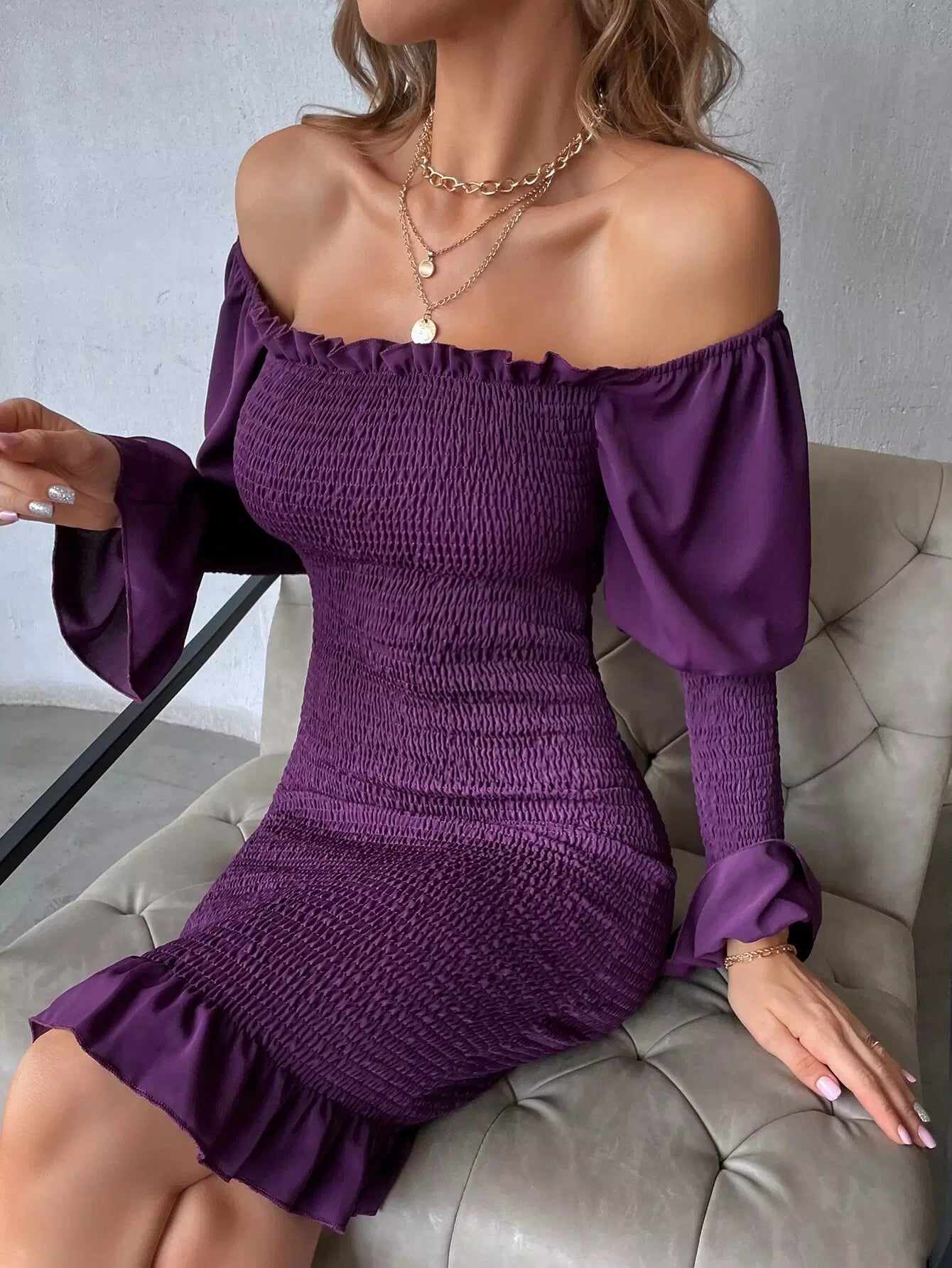 Solid Frill Trim Shirred Bodycon Dress