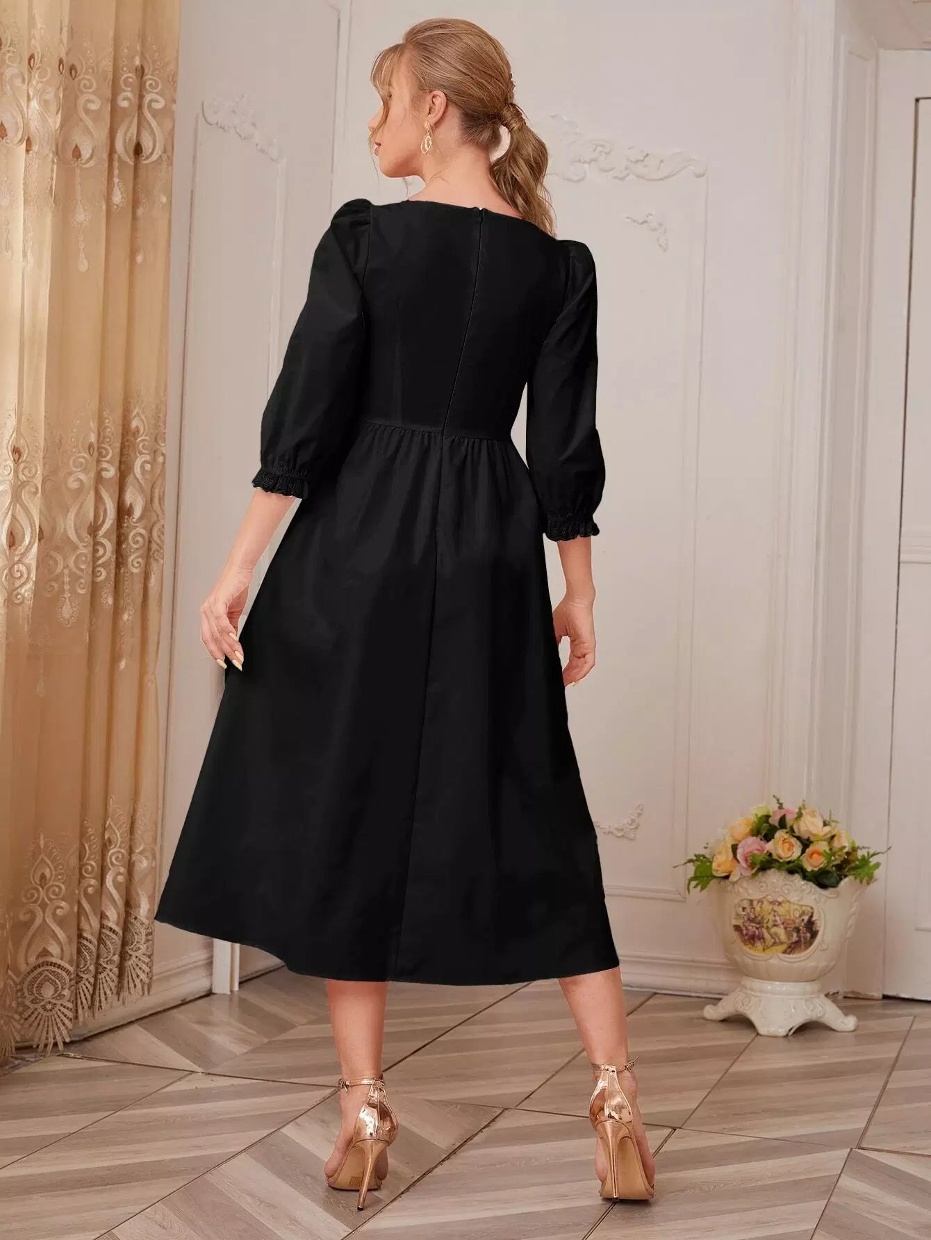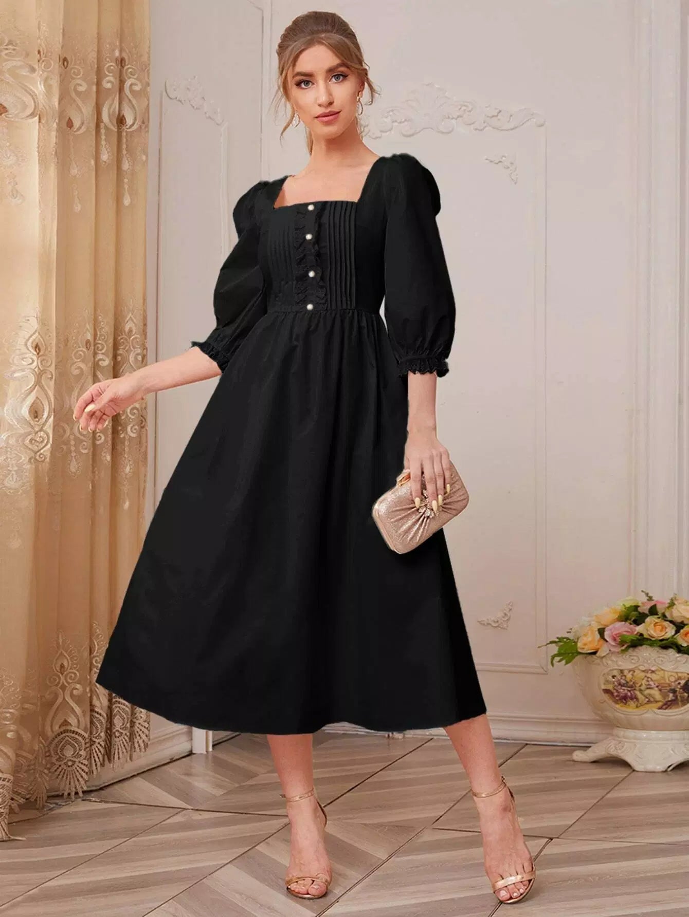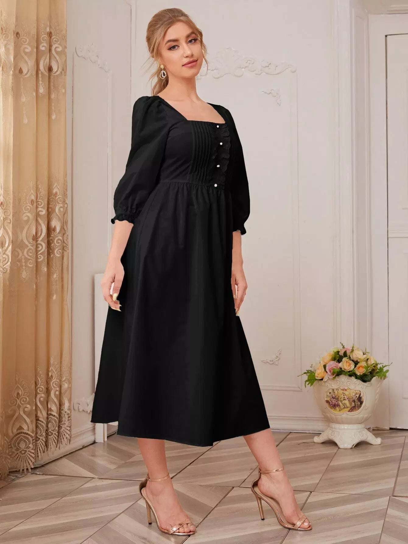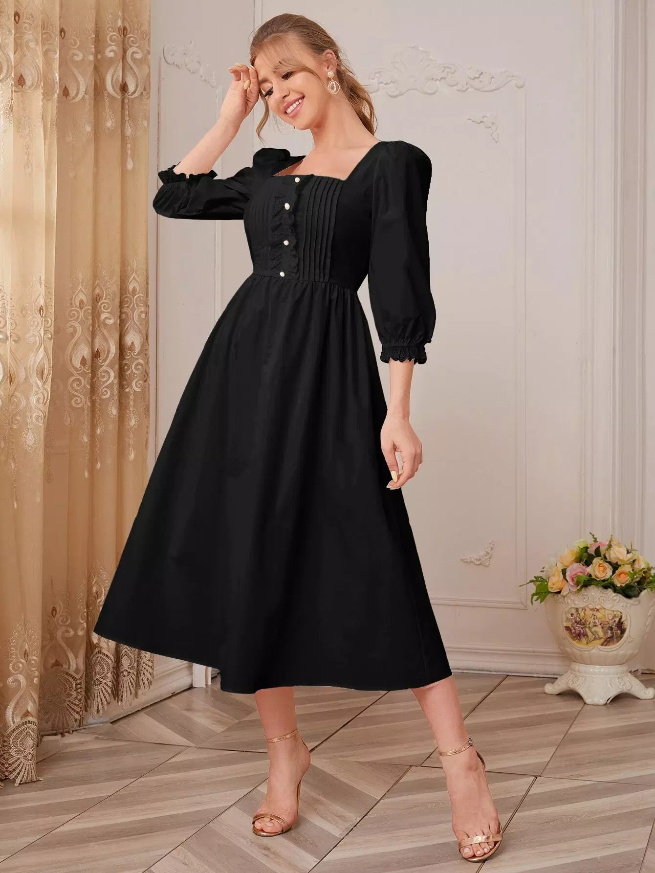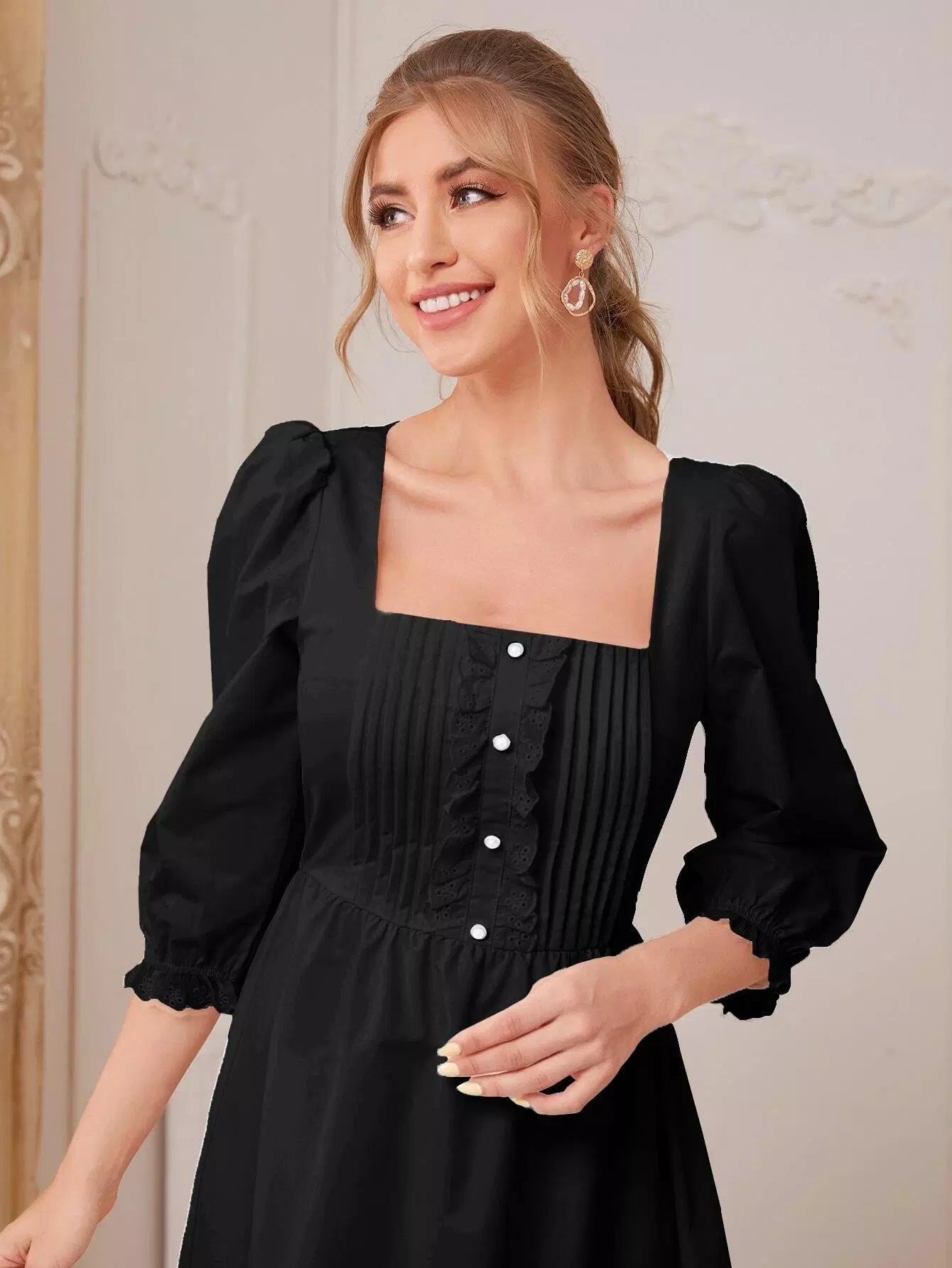 Square Neck Eyelet Embroidered Frill Trim Pleated Front Dress