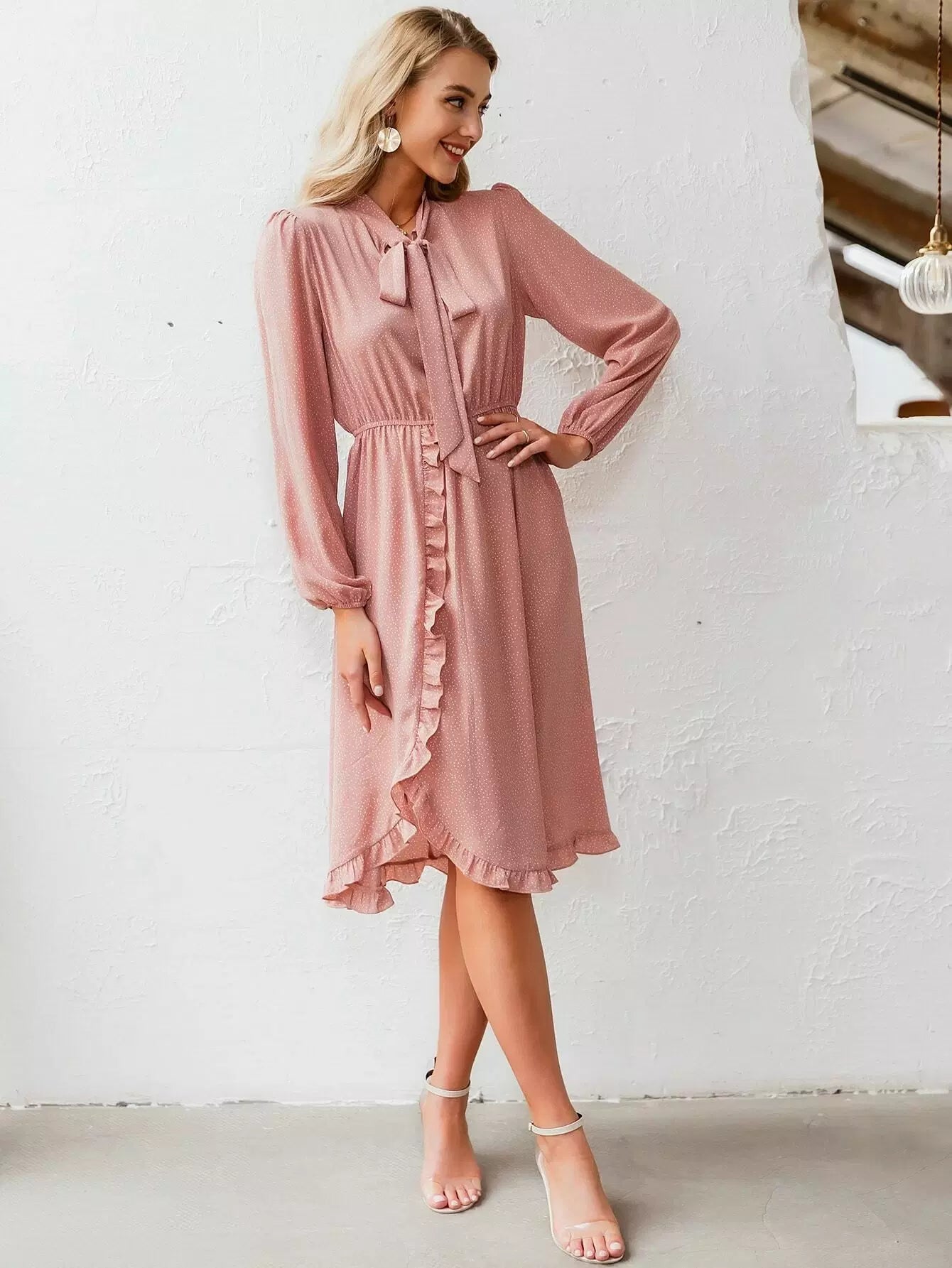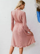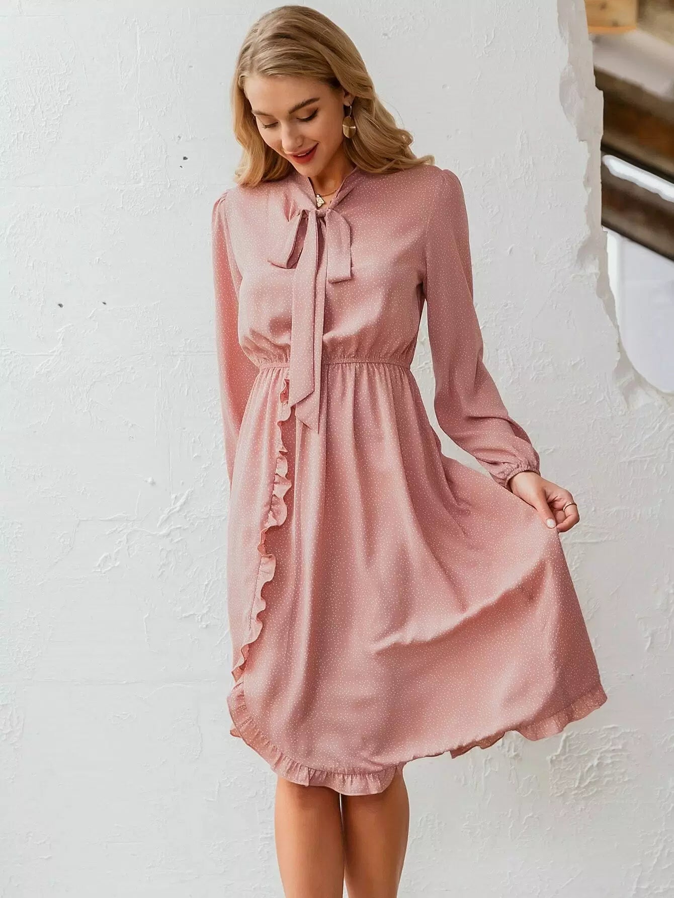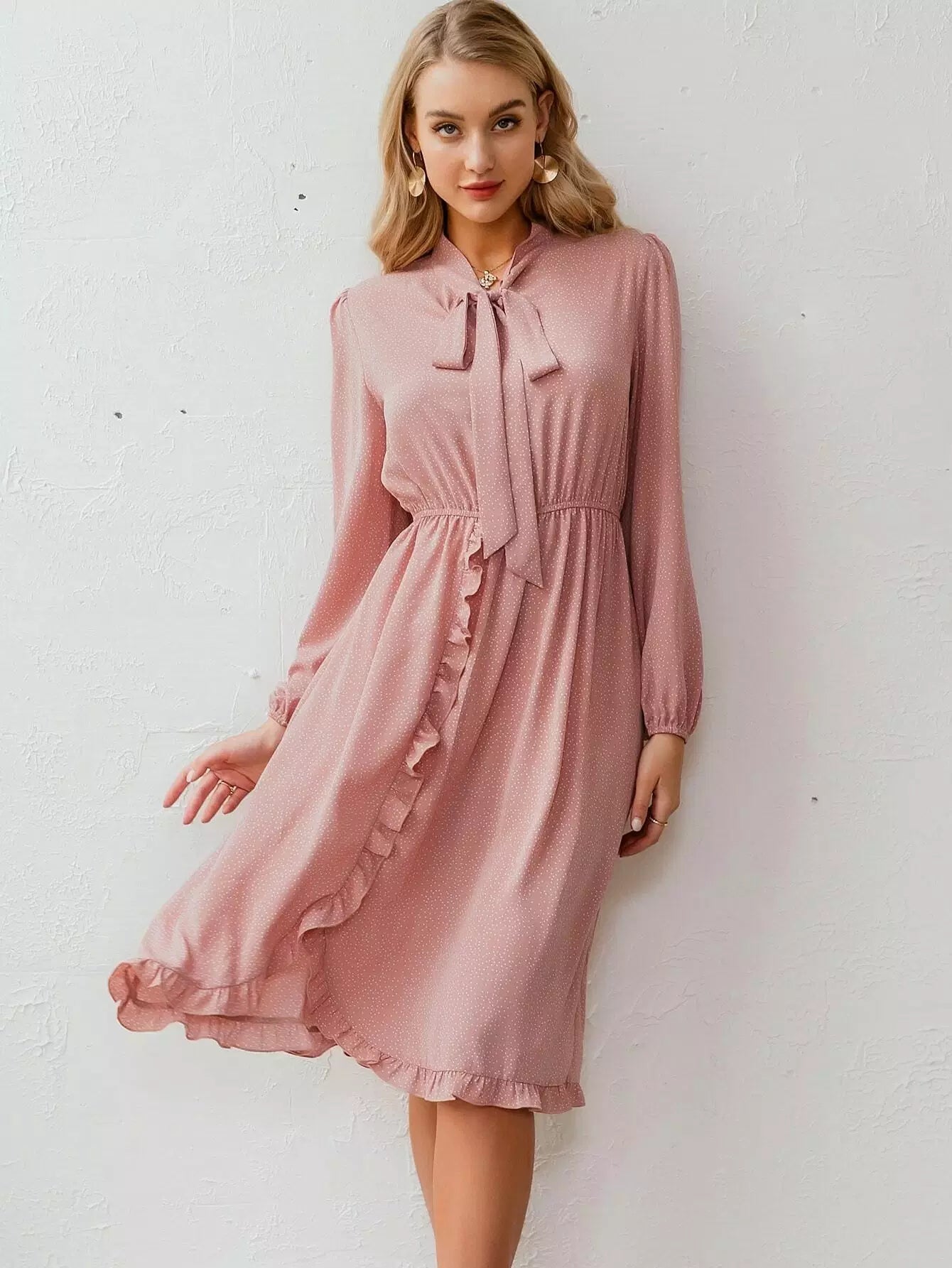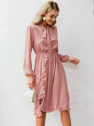 Tie Neck Ruffle Trim Polka Dot Dress